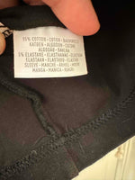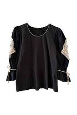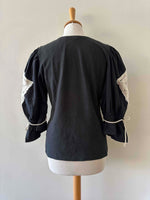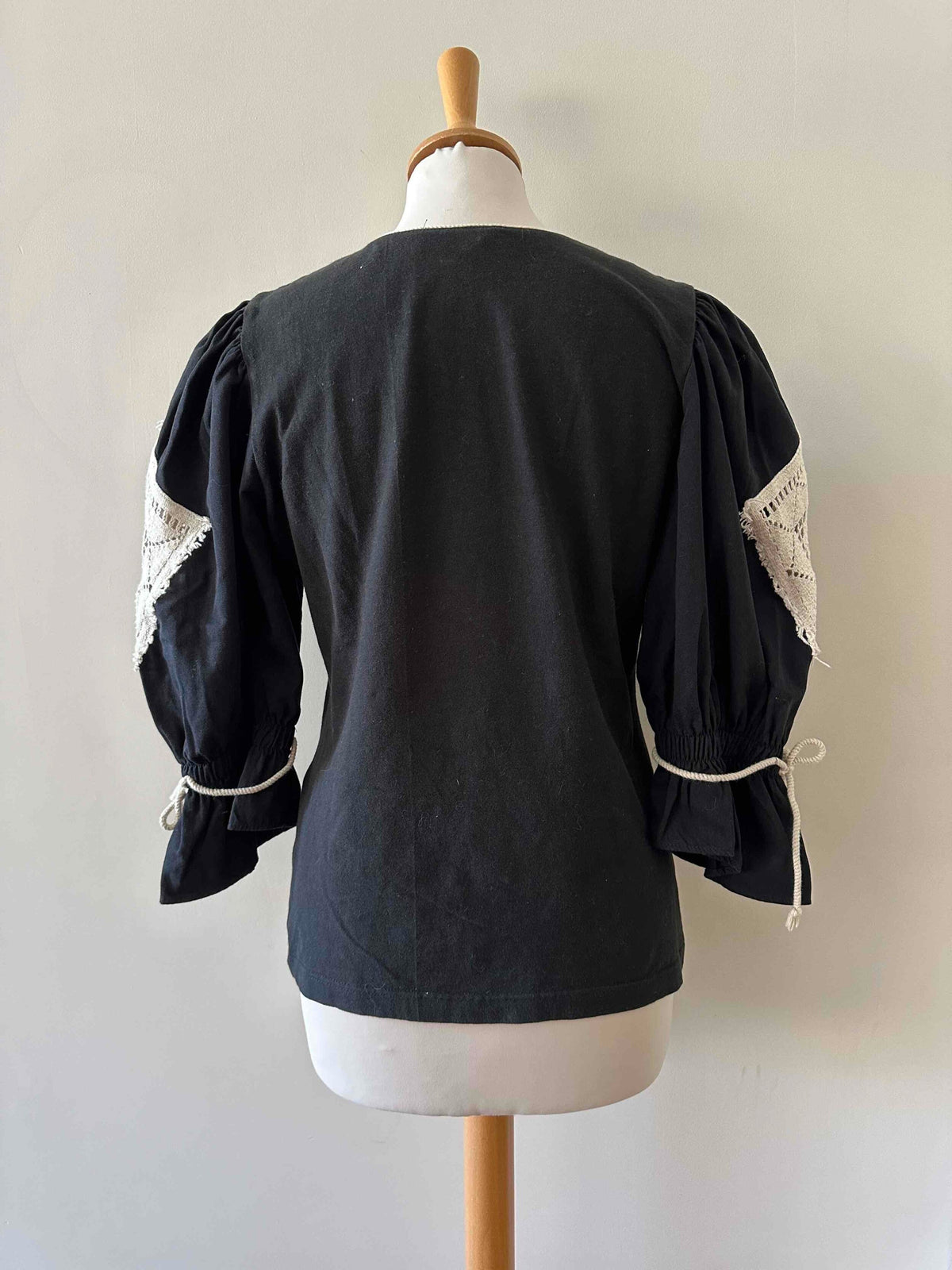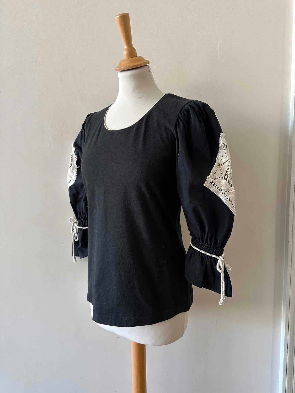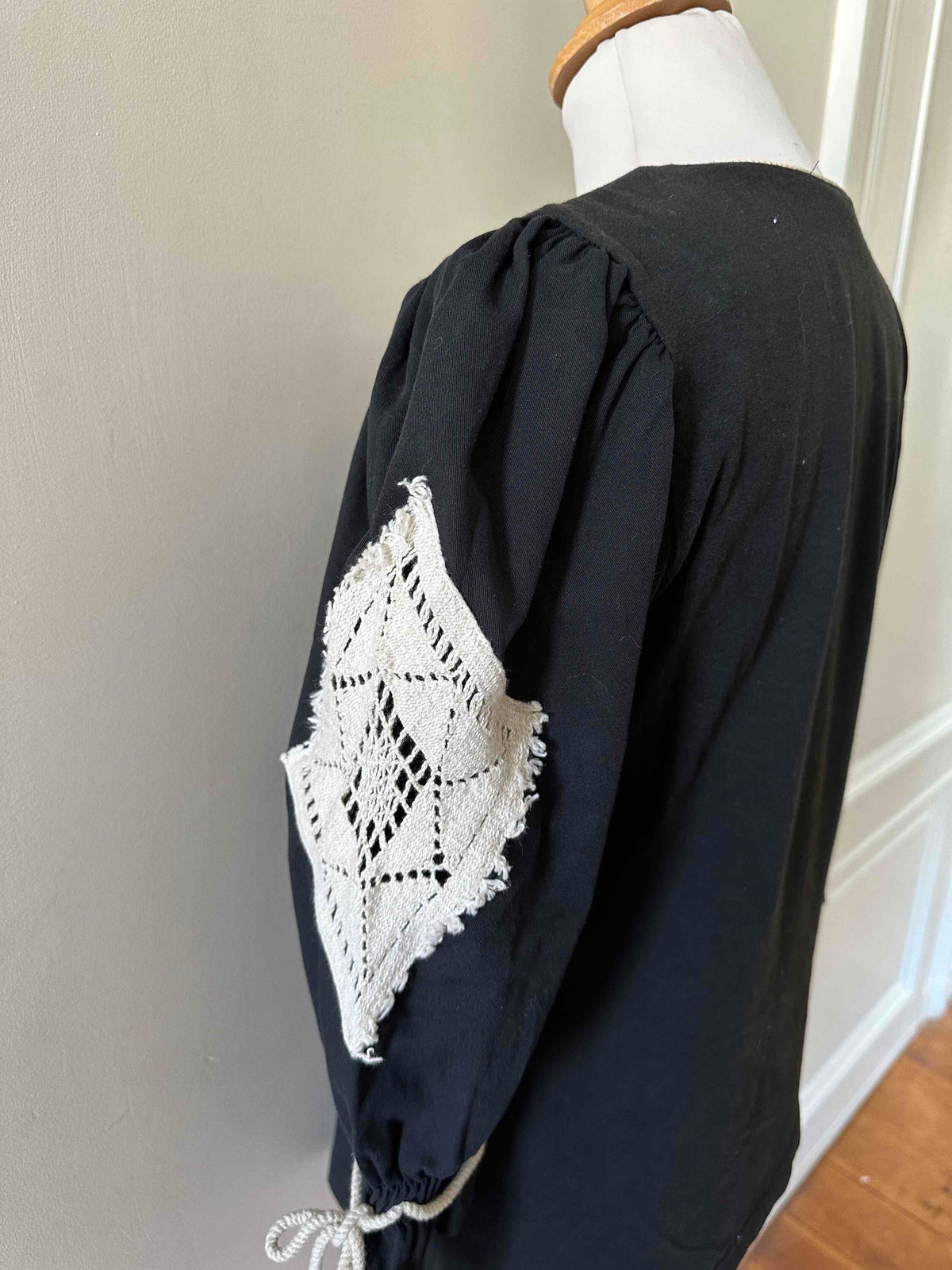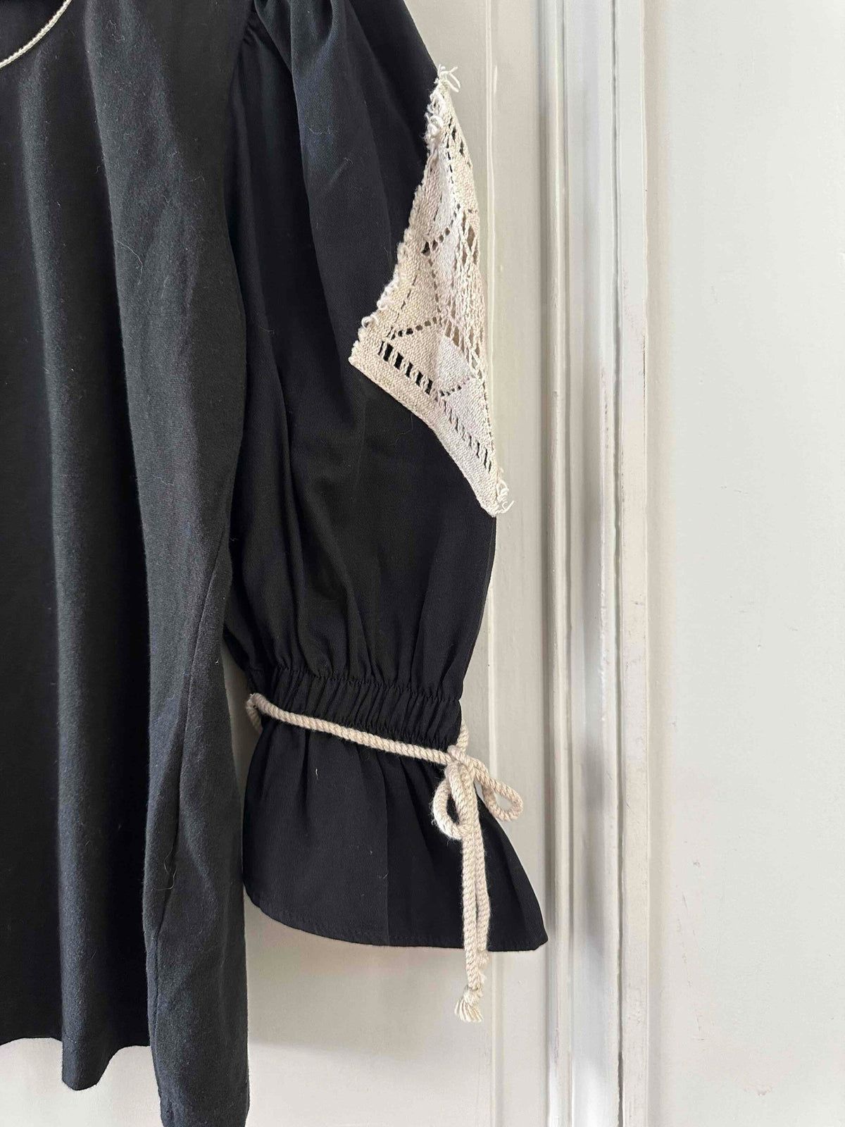 Prix unitaire parBlouse autrichienne, en coton jersey noir et manches en coton popeline noire brodées, ajourées de broderie macramé écrues, manches ballons à nouer par des cordons beiges, taille 36 portée ici sur un mannequin T36.