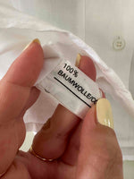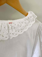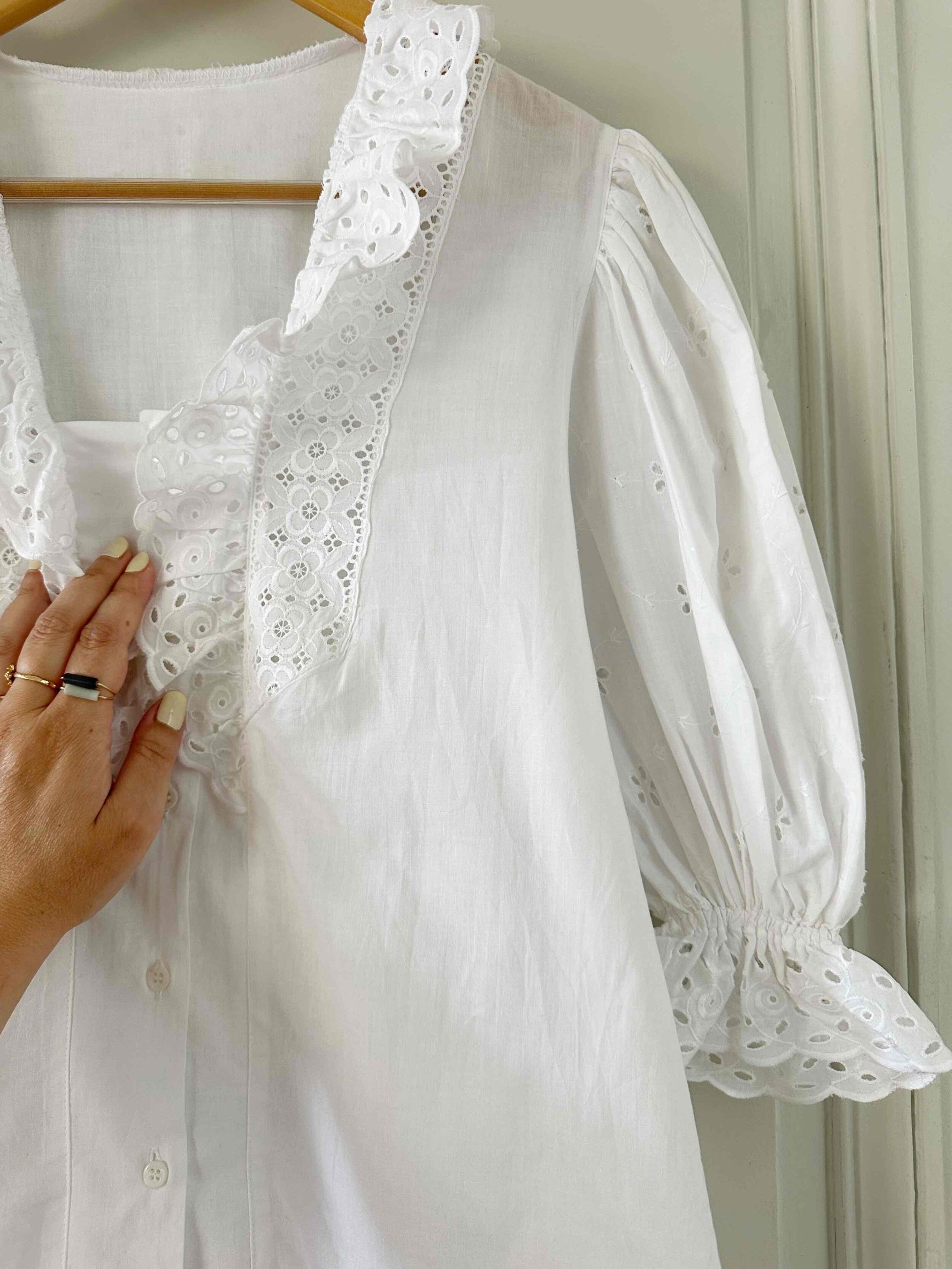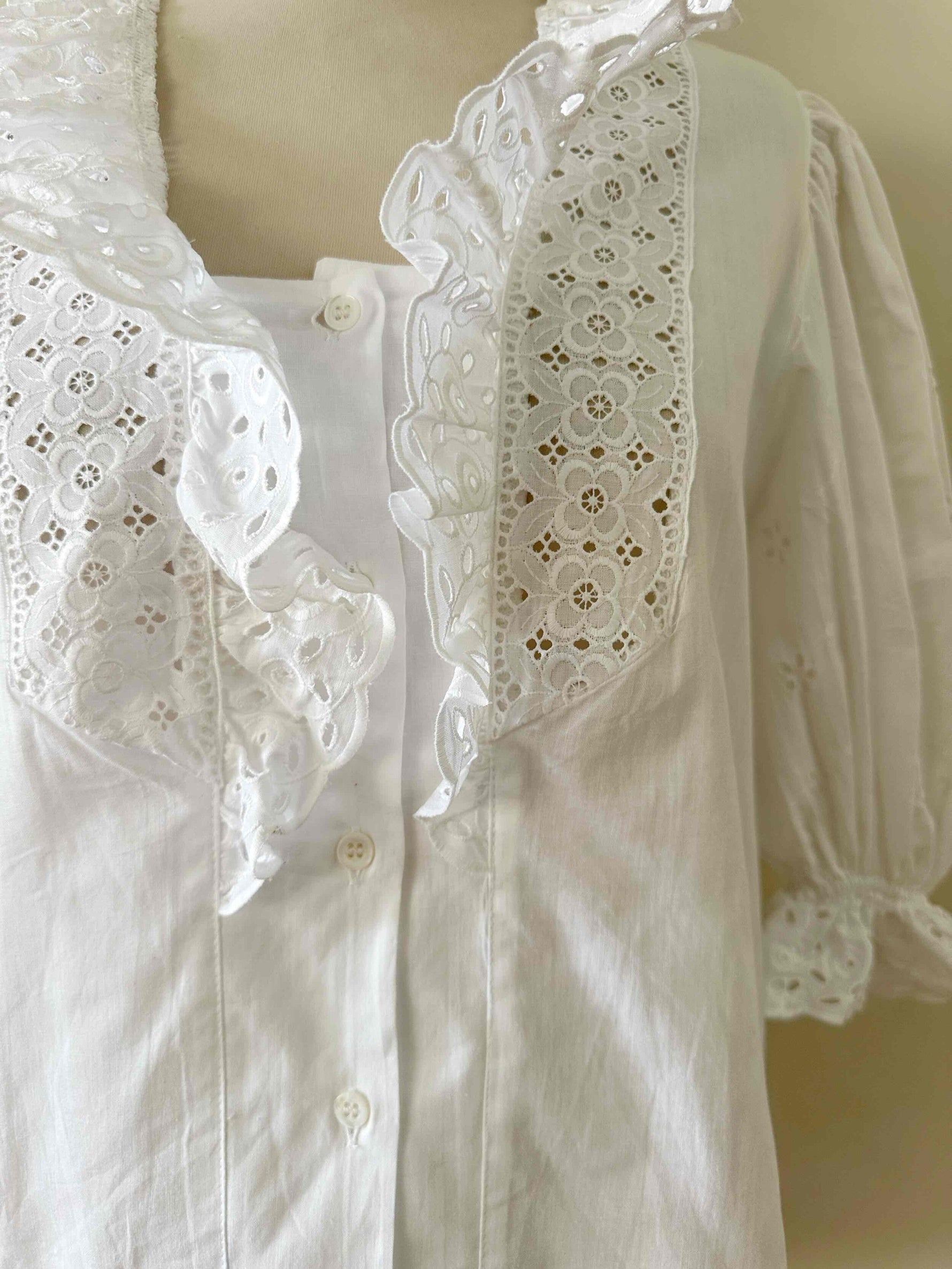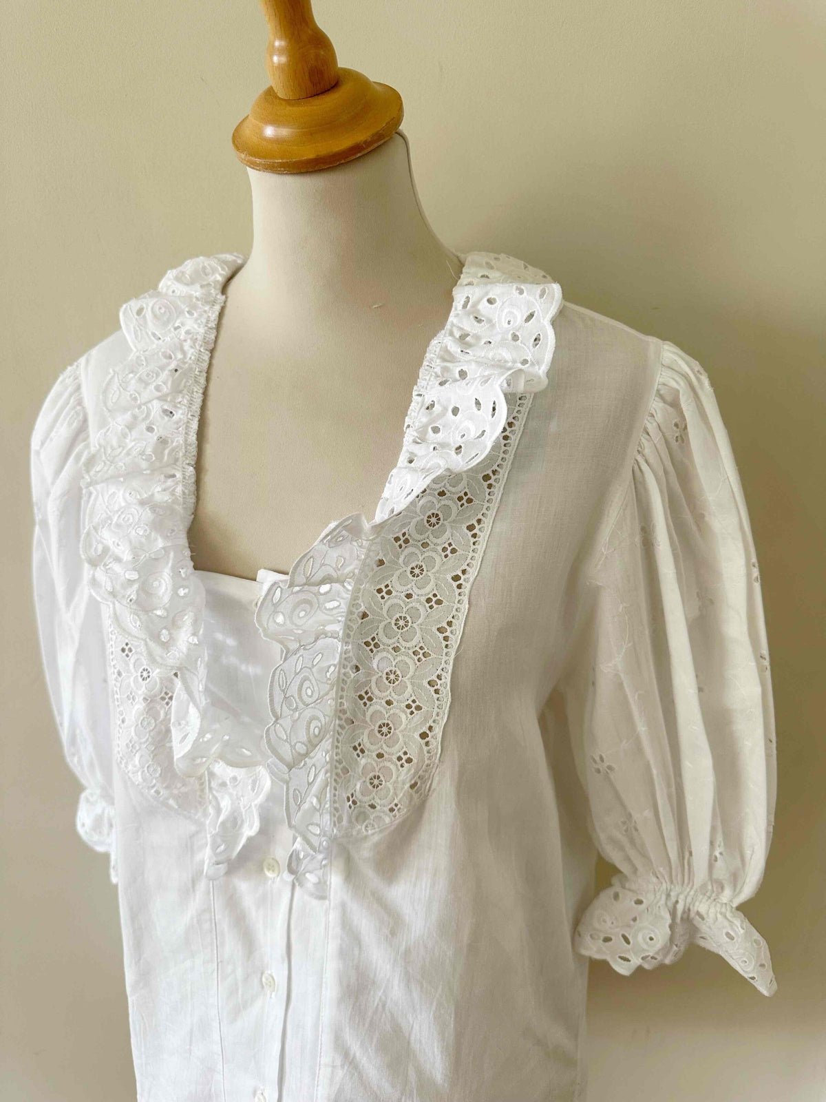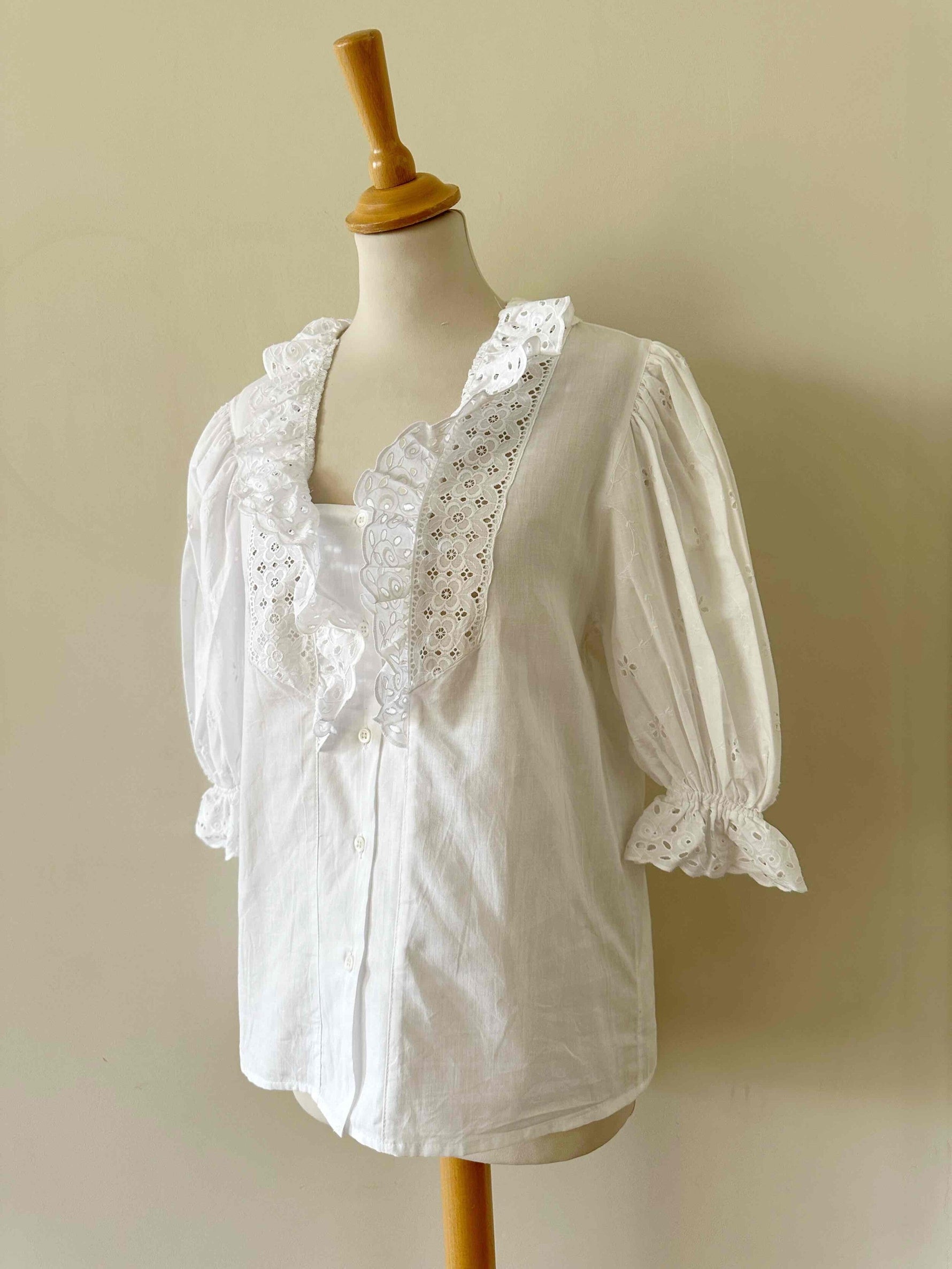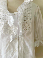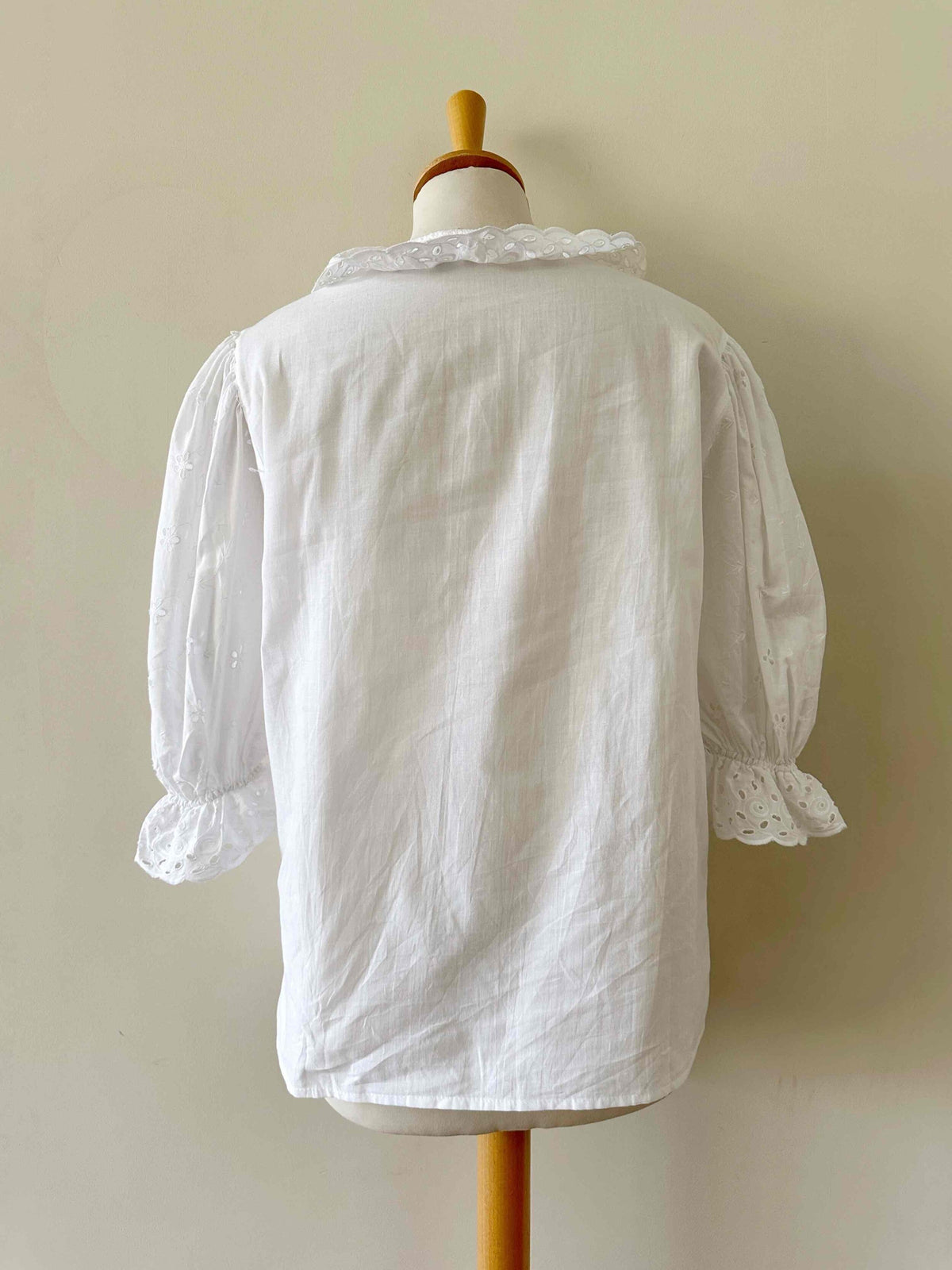 Prix unitaire parBlouse autrichienne en gaze 100% coton blanc, col ruffle et plastron en broderies anglaise ajourées, manches ballons 3/4, fabriquée en Autriche, taille 36 portée ici sur un mannequin T36.