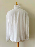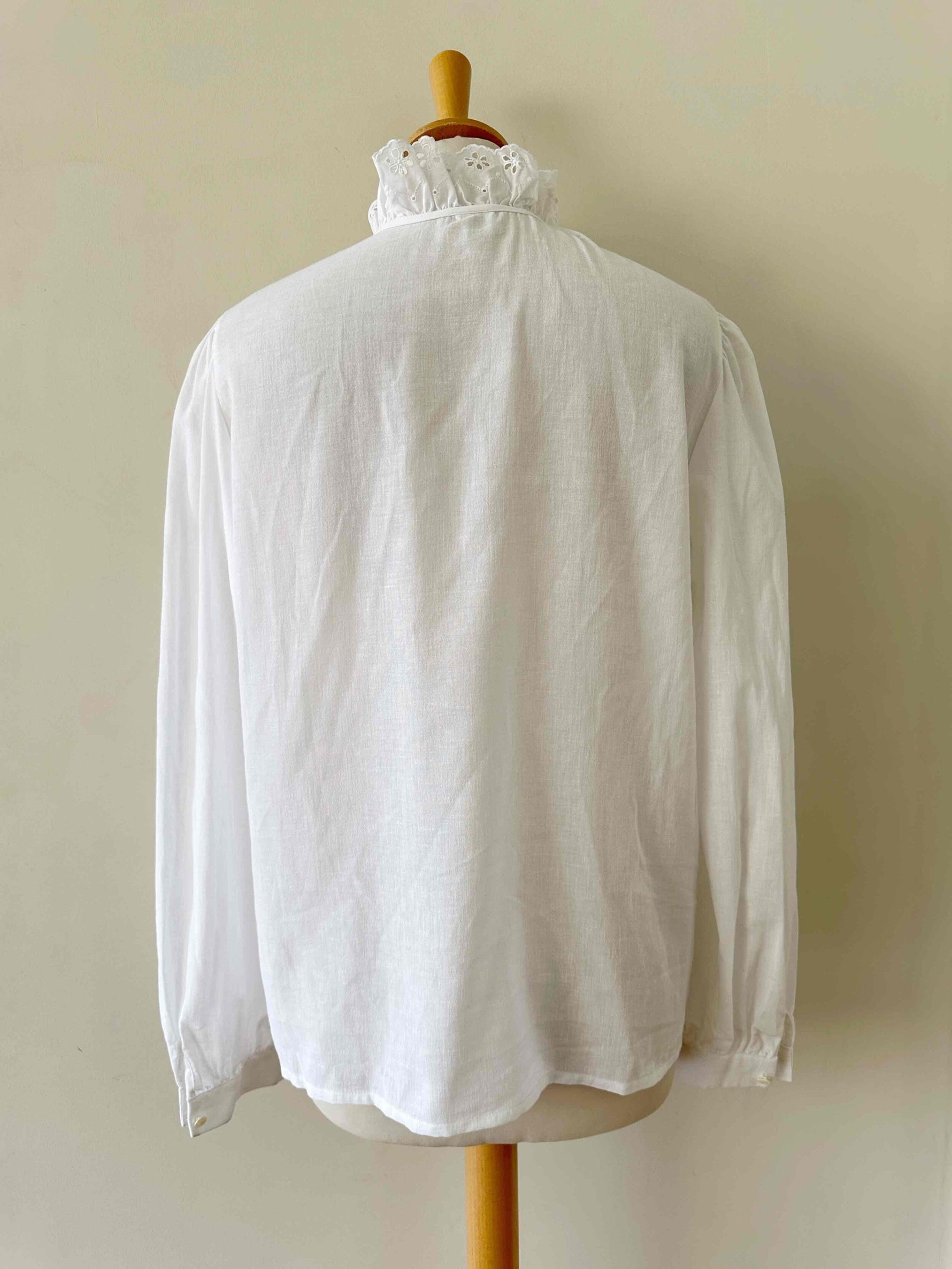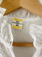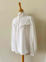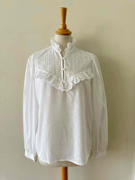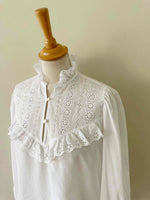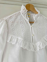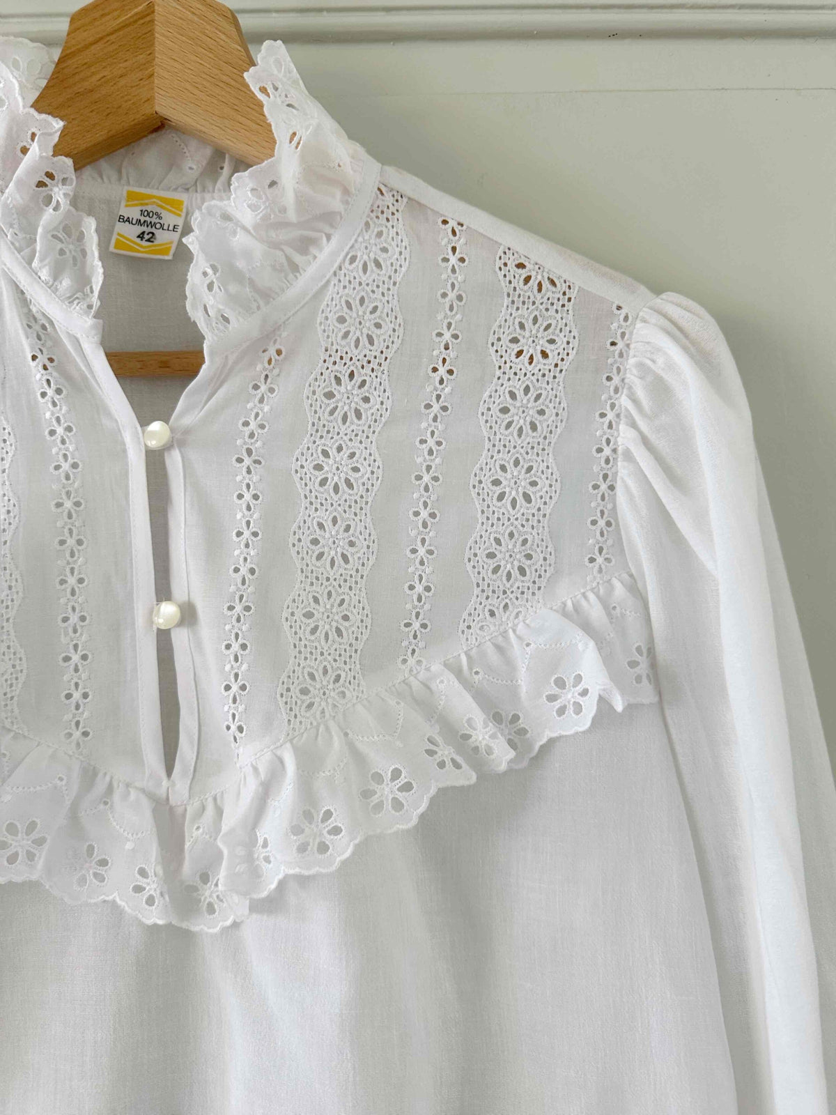 Prix unitaire parBlouse autrichienne en gaze 100% coton blanc, col ruffle collerette et plastron en broderies anglaise ajourées fleuries, manches ballons longues, forme tunique.