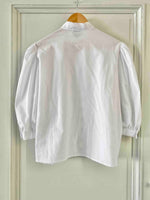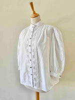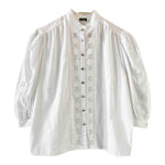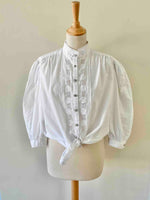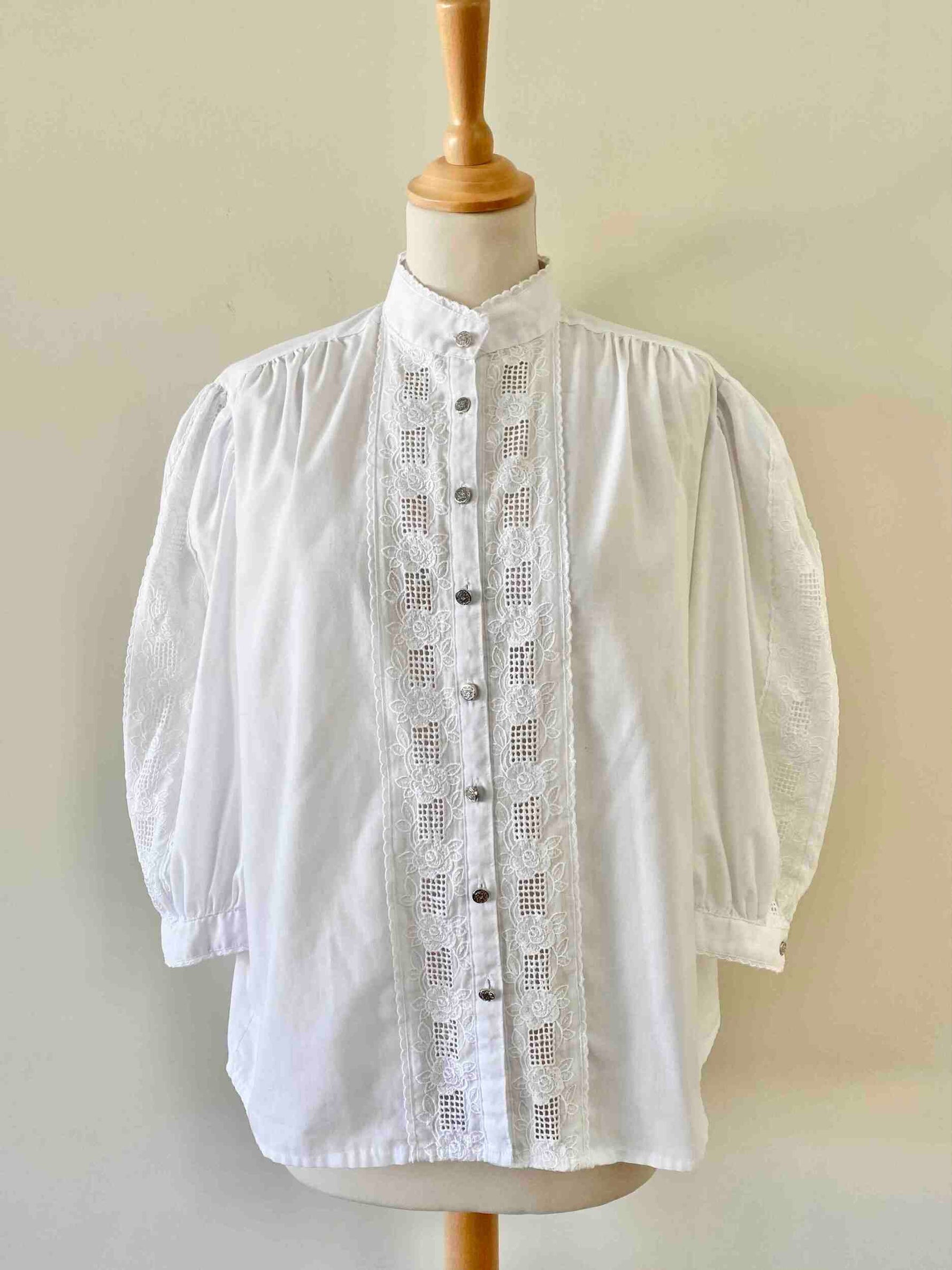 Prix unitaire parBlouse Autrichienne en coton brodé de dentelles ajourées florales, manches ballon 3/4, col montant, boutons bijoux argentés, fabriqué en Autriche