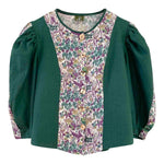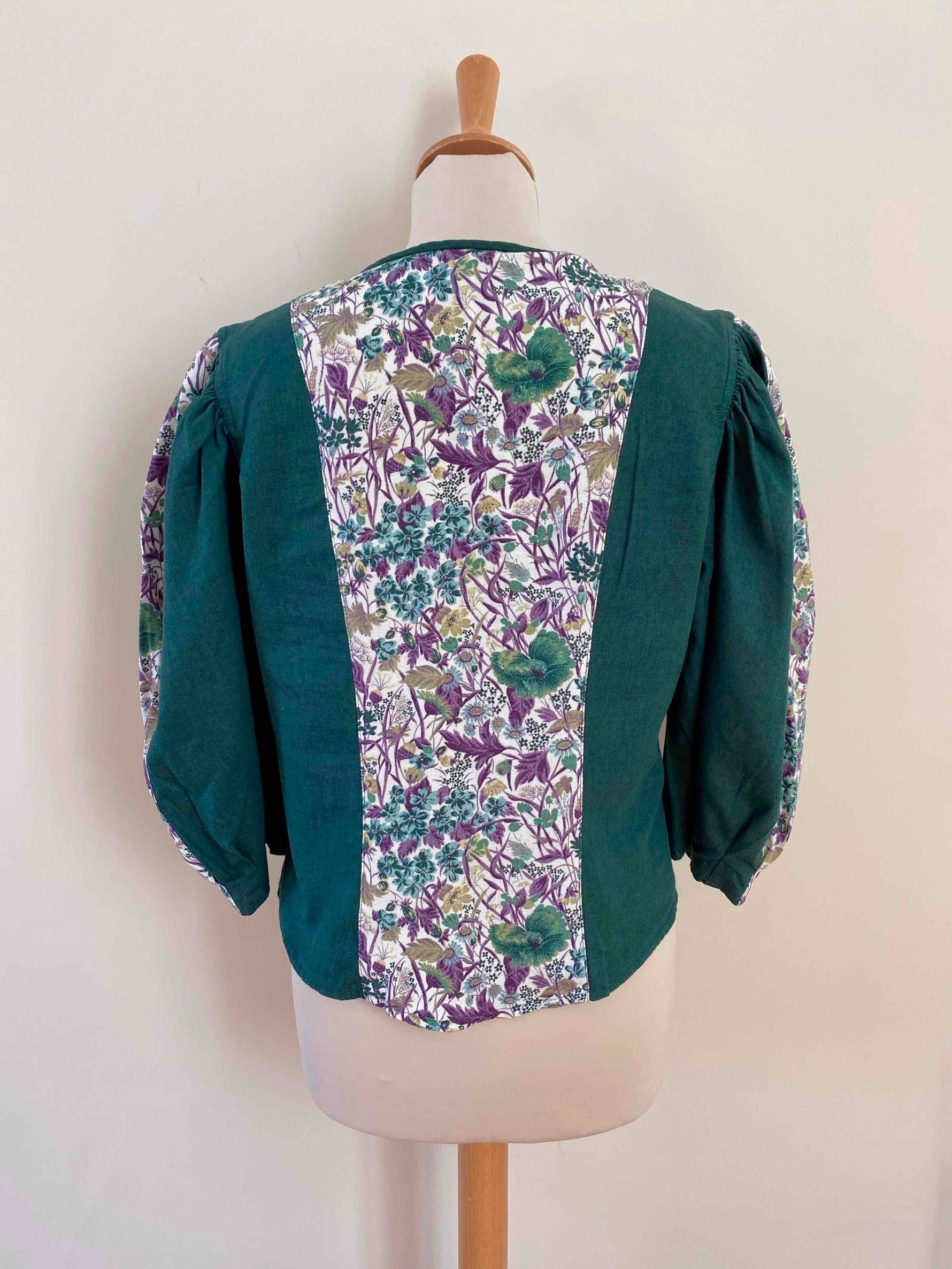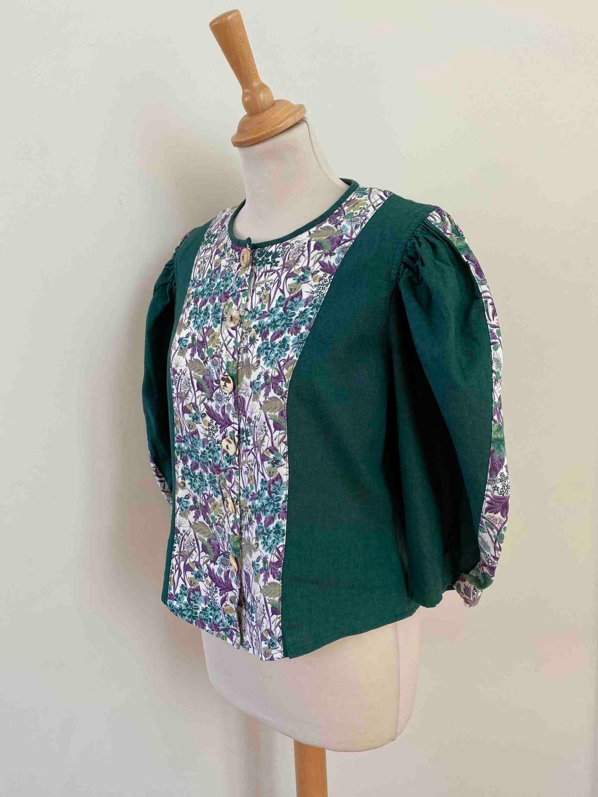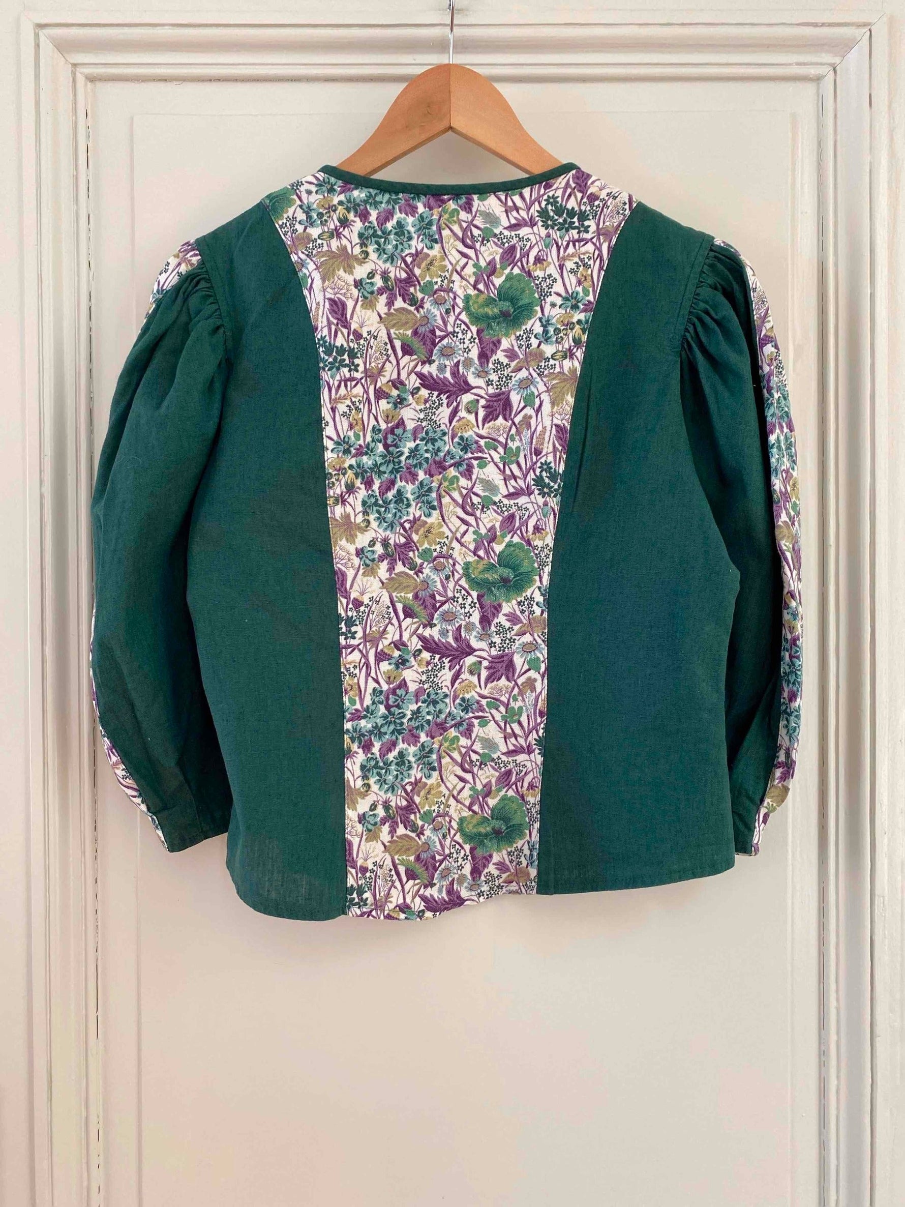 Prix unitaire parBlouse autrichienne en coton & lin vert bouteille et imprimé floral dans les tons violets, manches ballons, boutons bois, fabriquée en Autriche