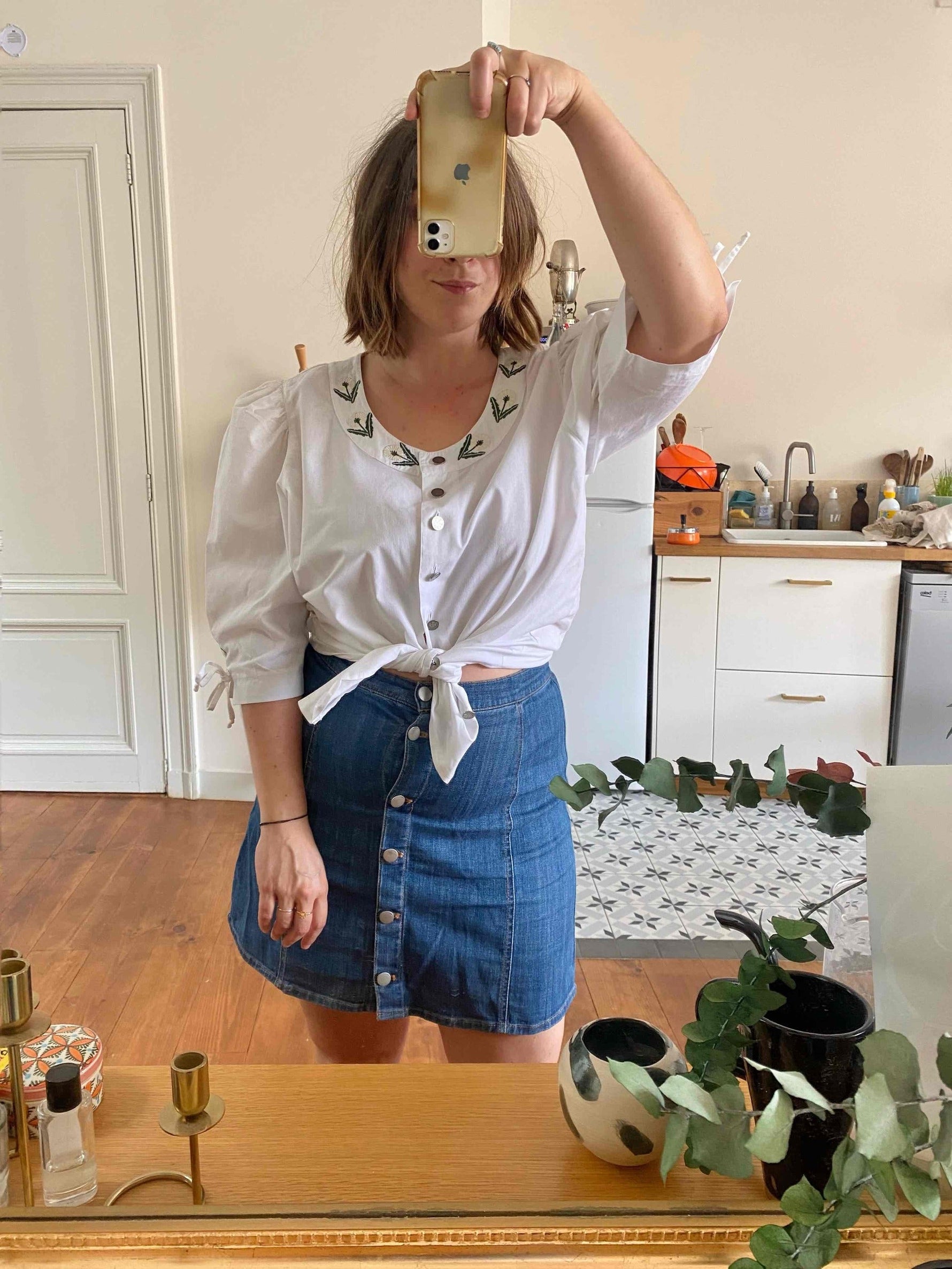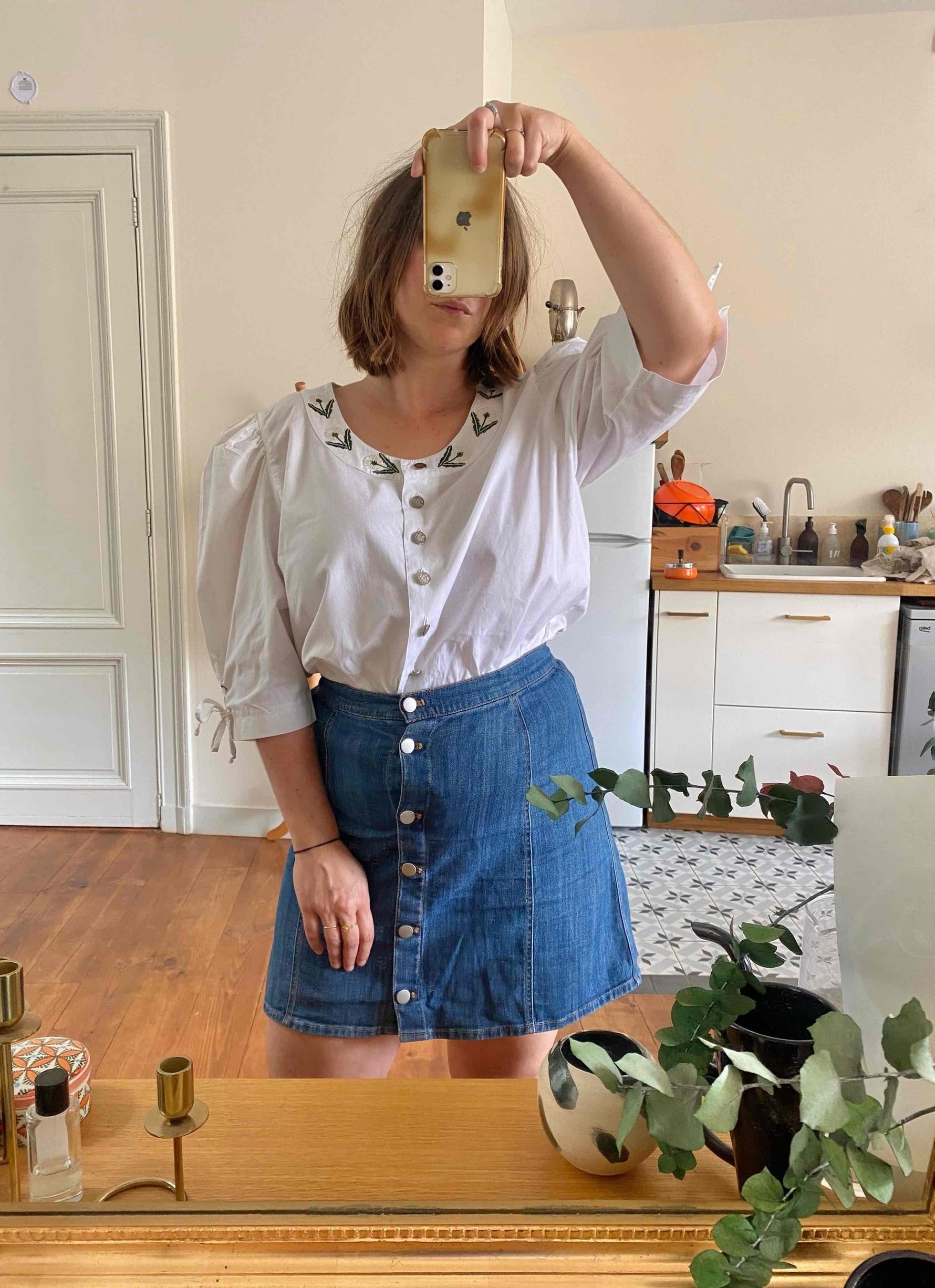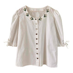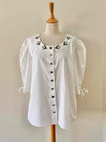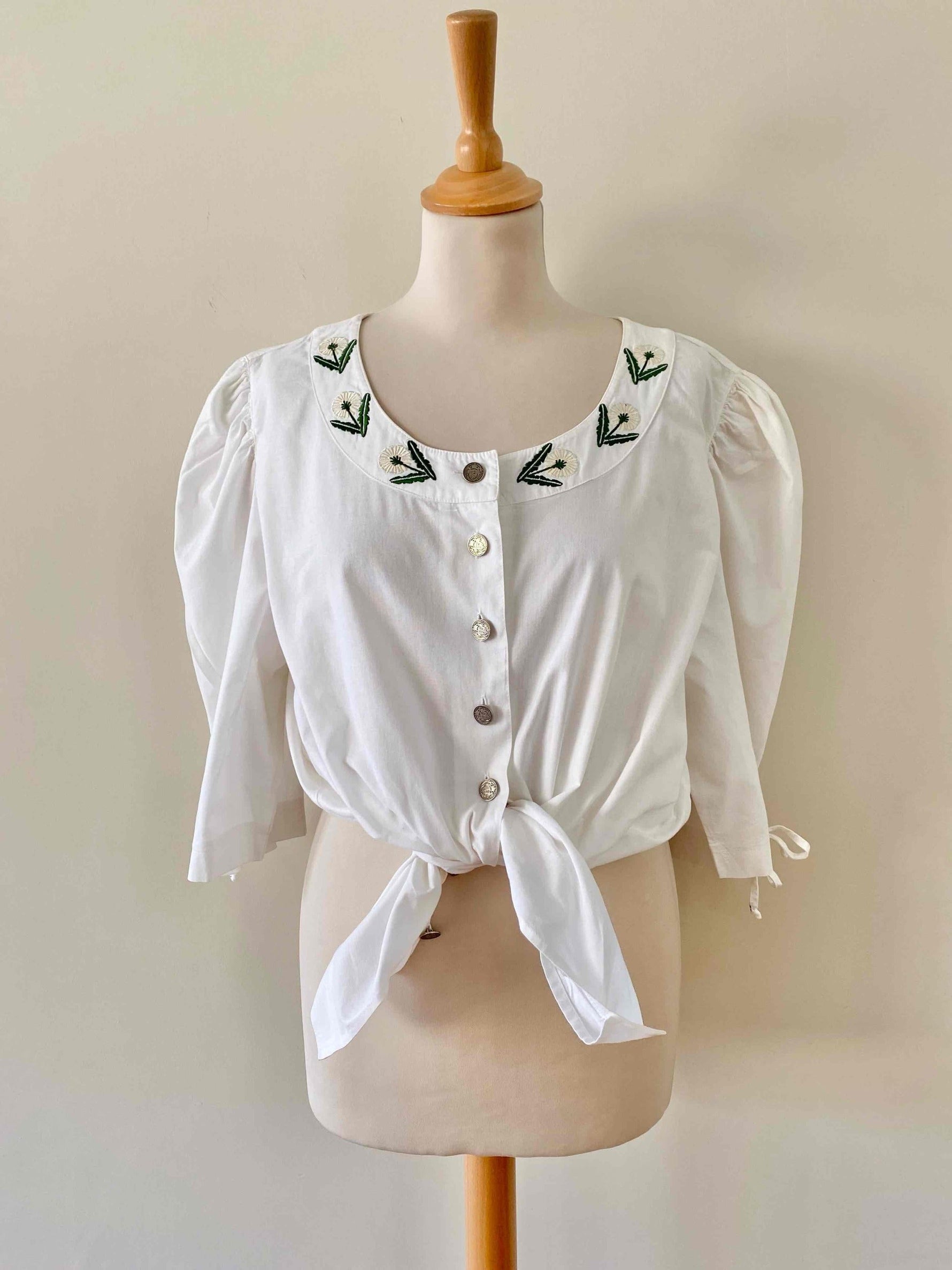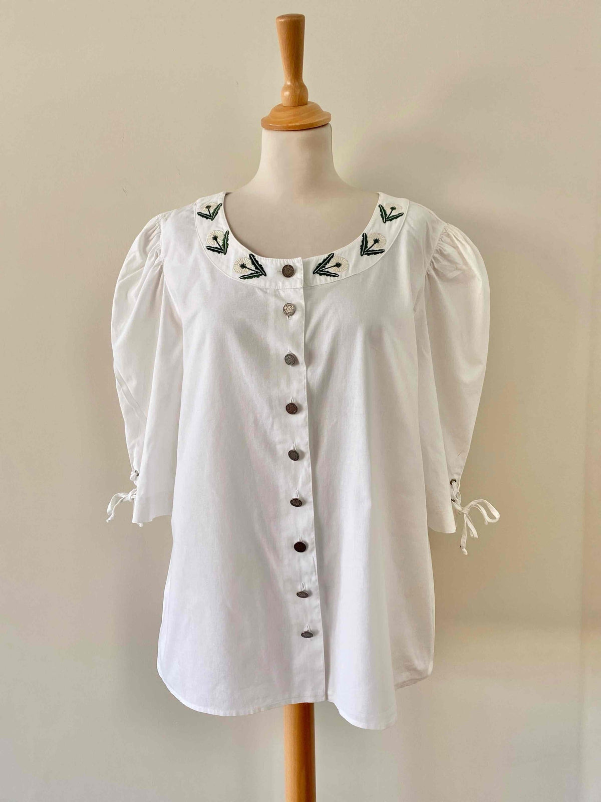 Prix unitaire parBlouse autrichienne en coton popeline, col rond brodé de fleurs marguerites, manches ballons à lacets noués, boutons bijoux argentés, fabriquée en Autriche.