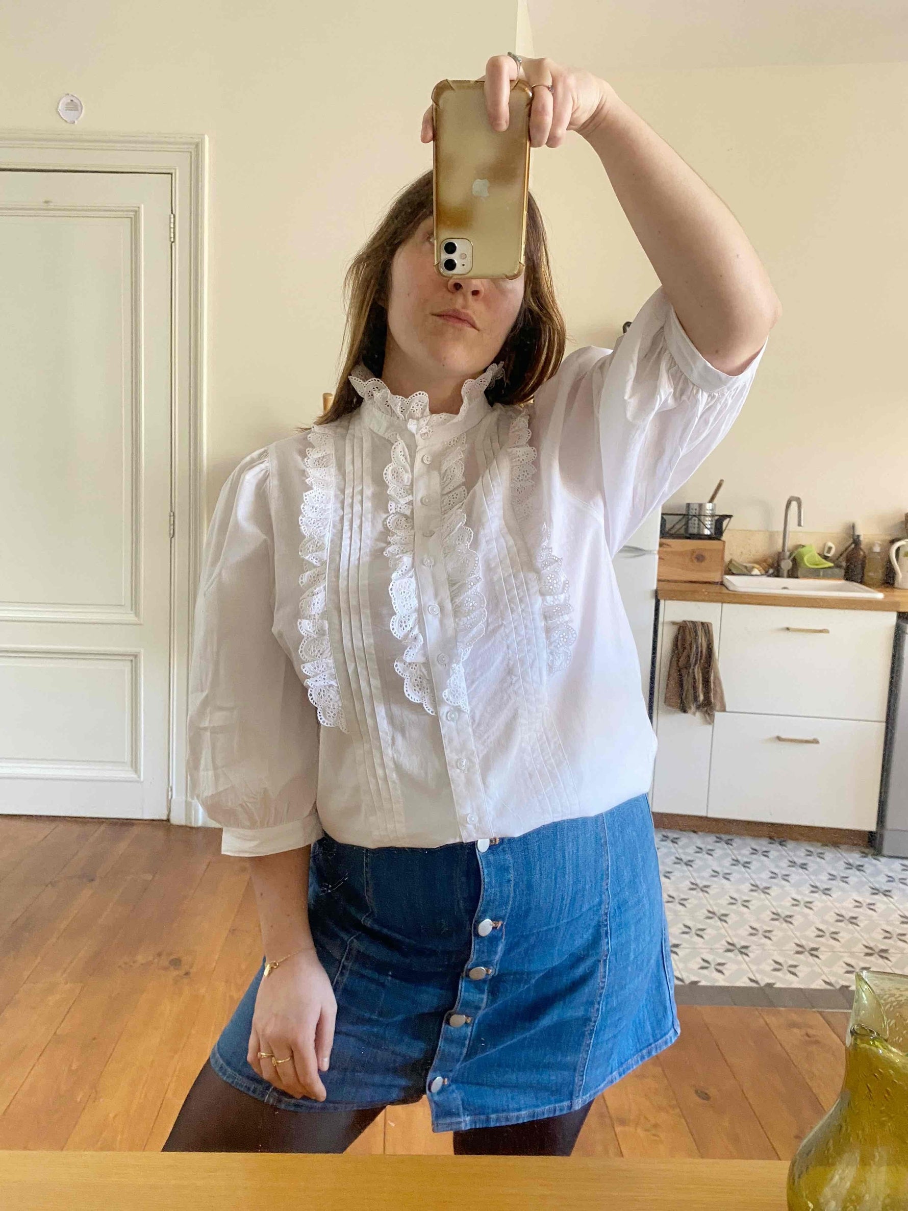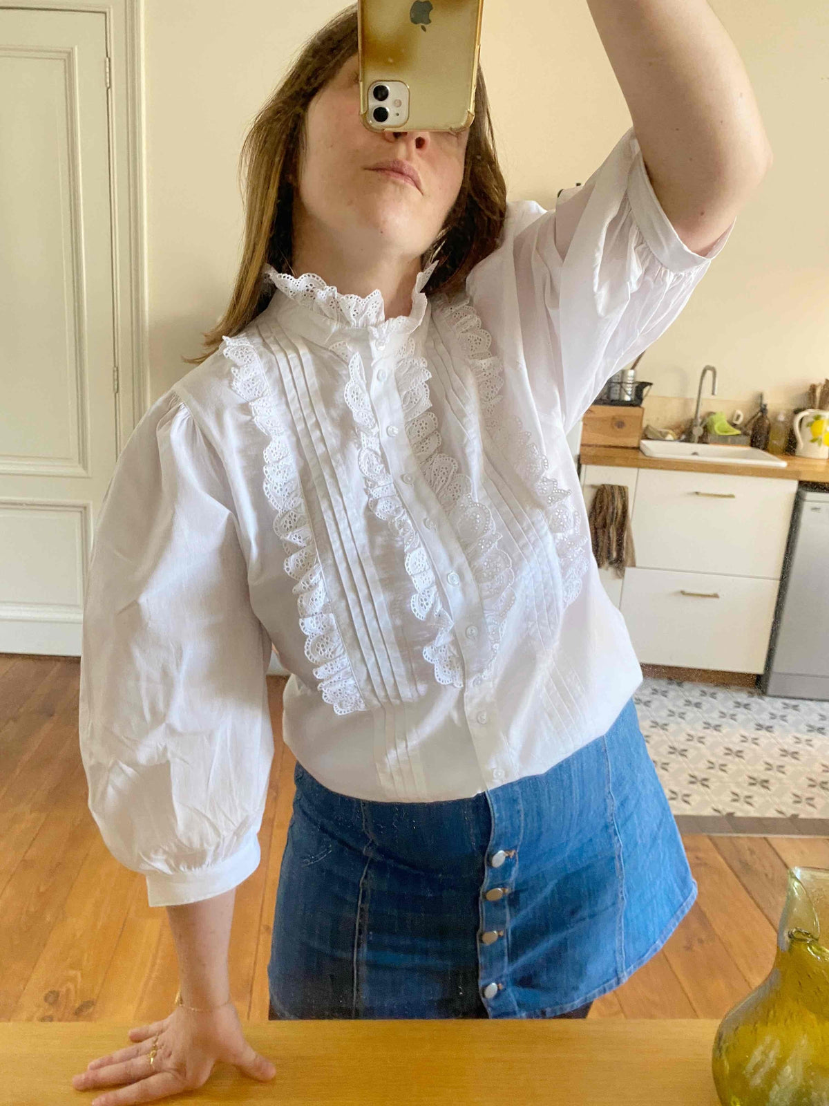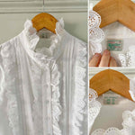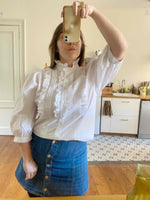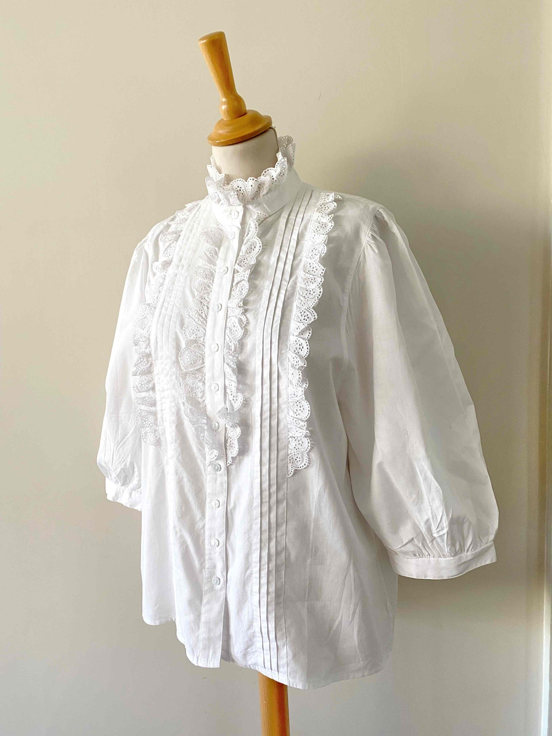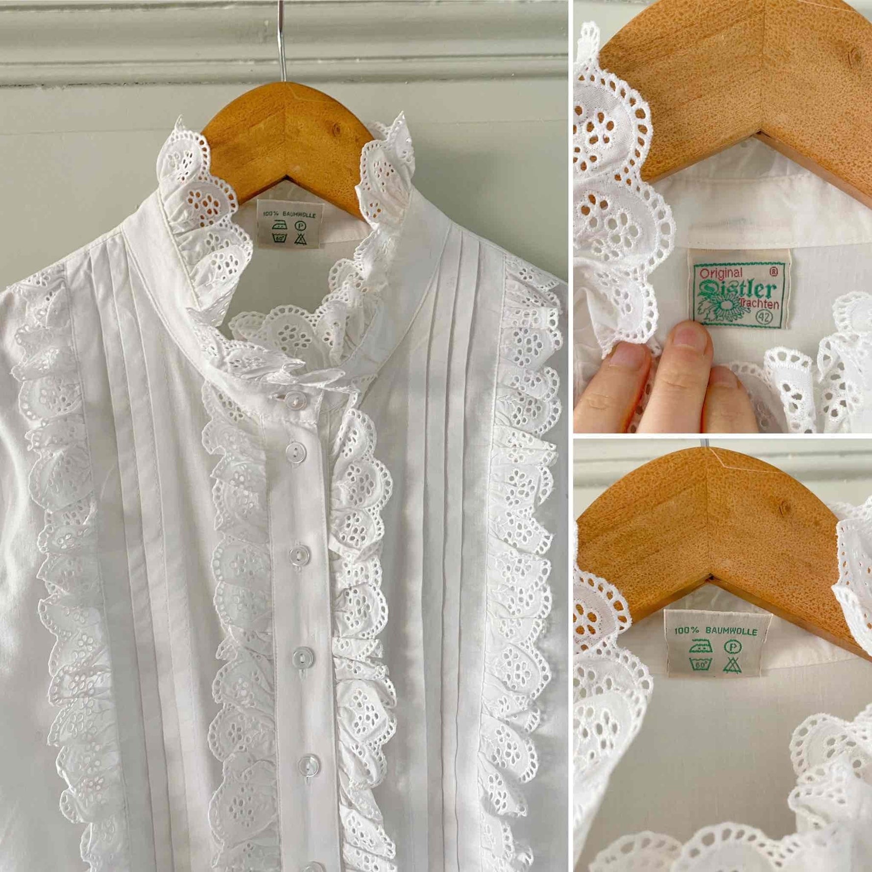 Prix unitaire parBlouse autrichienne en coton, plastron et col montant brodé de dentelle volantes, manches ballons 3/4, fabriquée en Autriche, taille 40 porté ici sur un mannequin T36 et une personne T40.