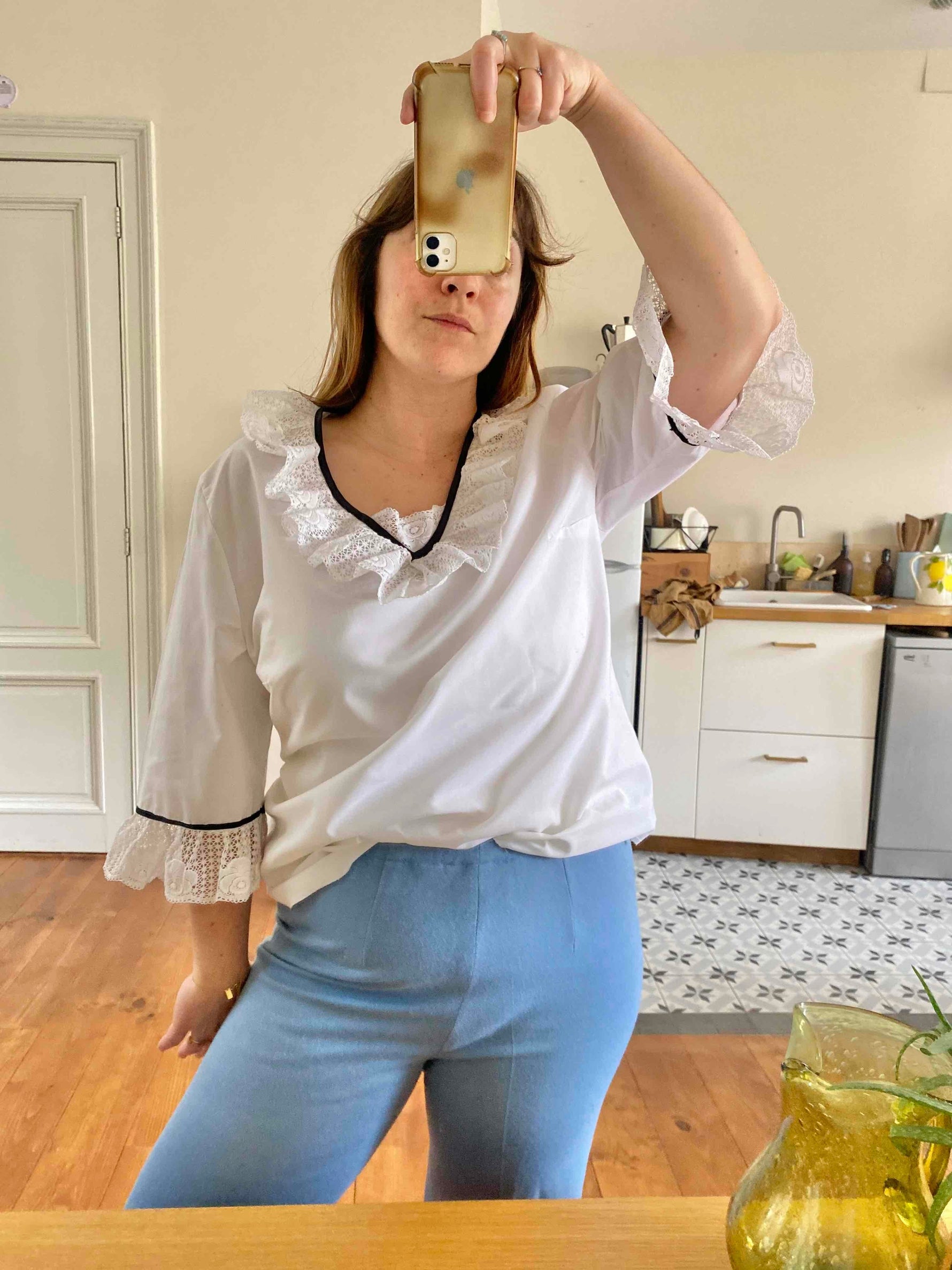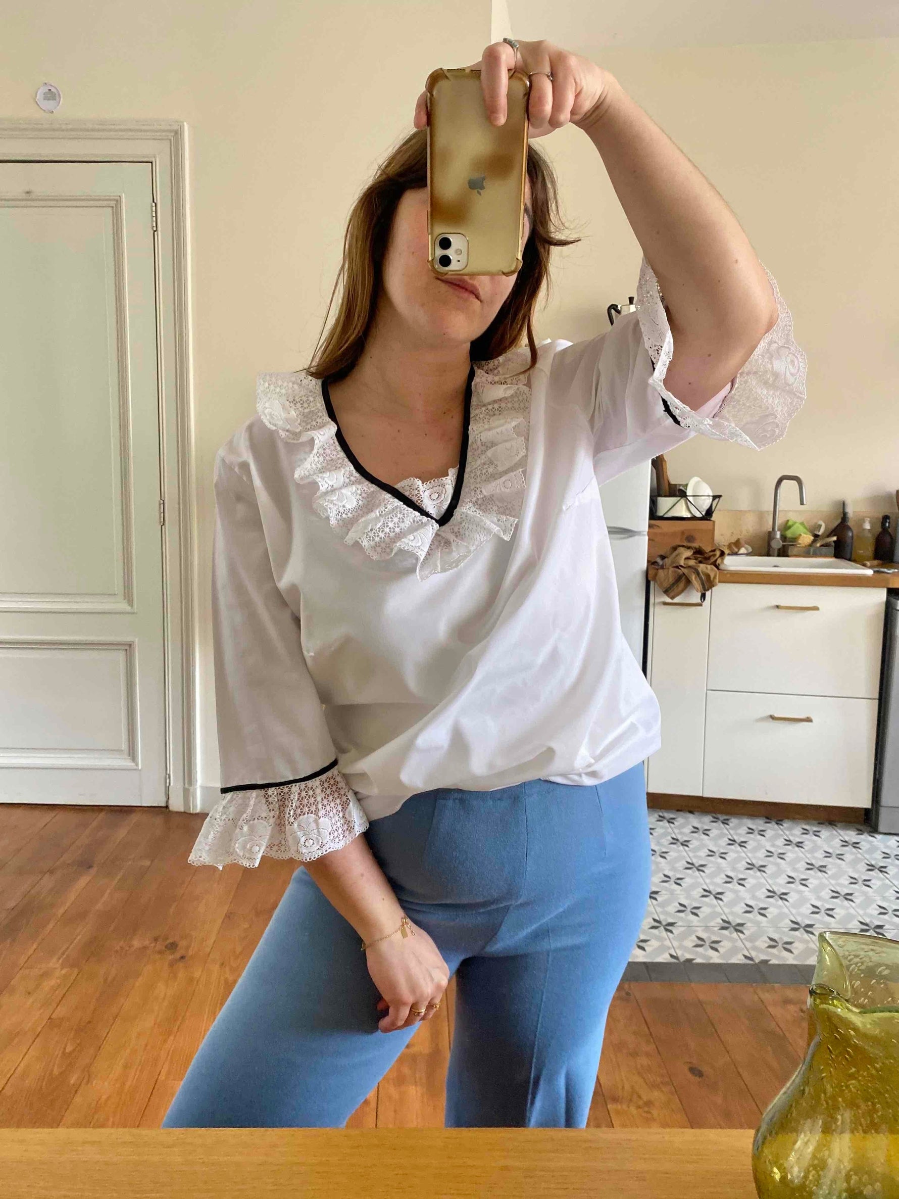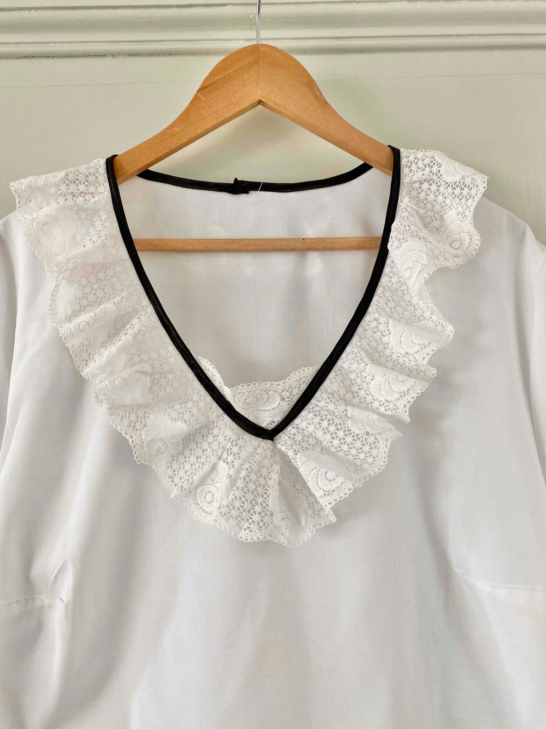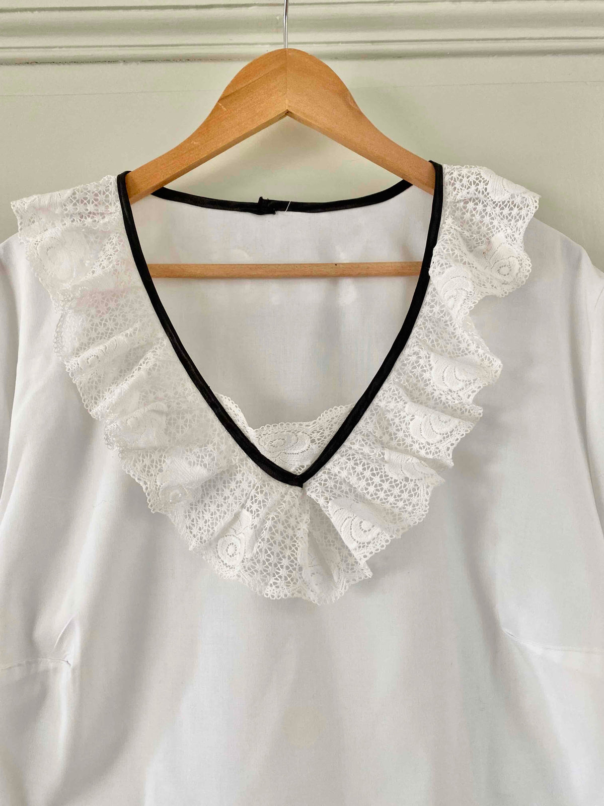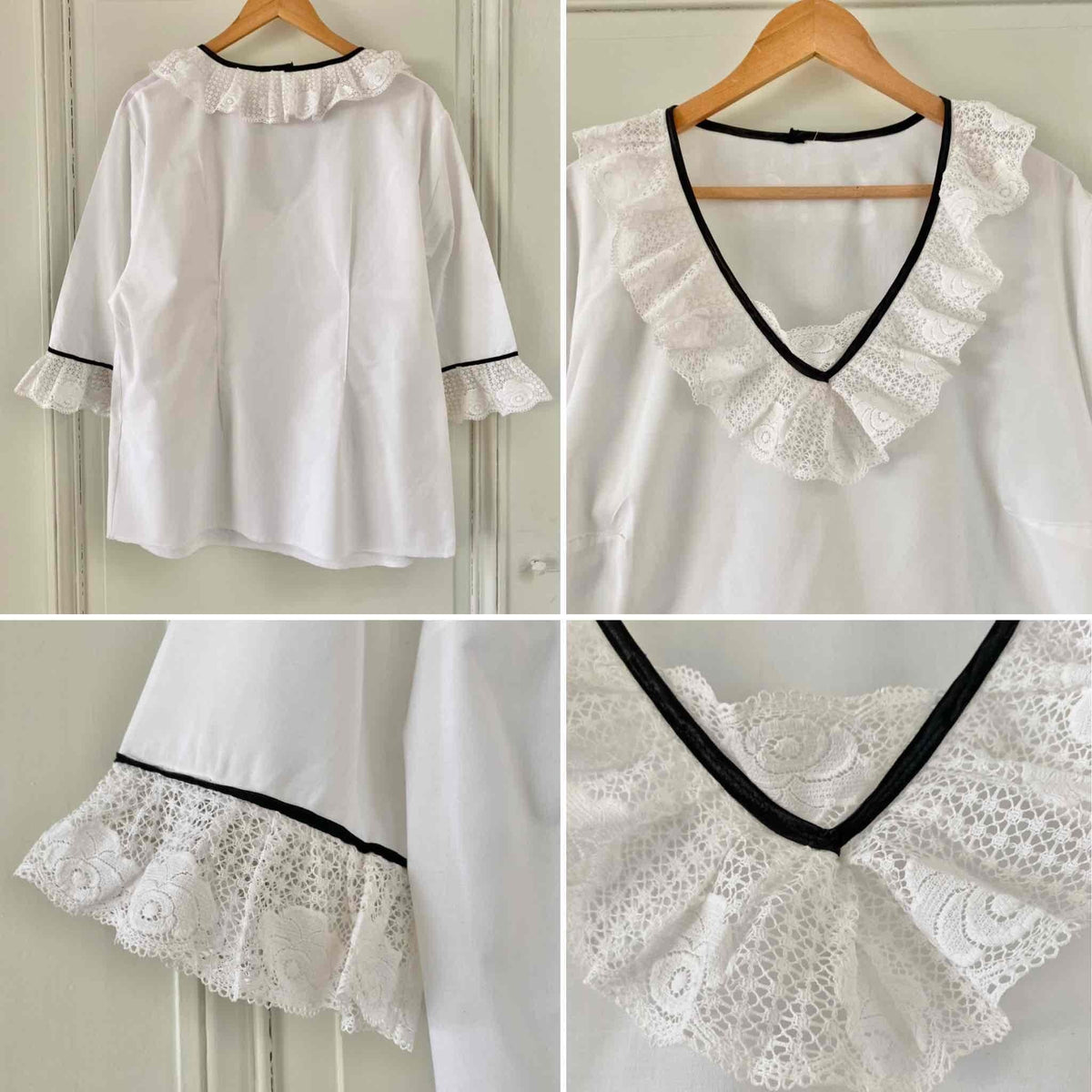 Prix unitaire parBlouse autrichienne en coton popeline, col en dentelle Volantée, manches évasées trompettes en dentelle, bordures en satin noir, taille 40 porté ici sur une personne T40.