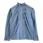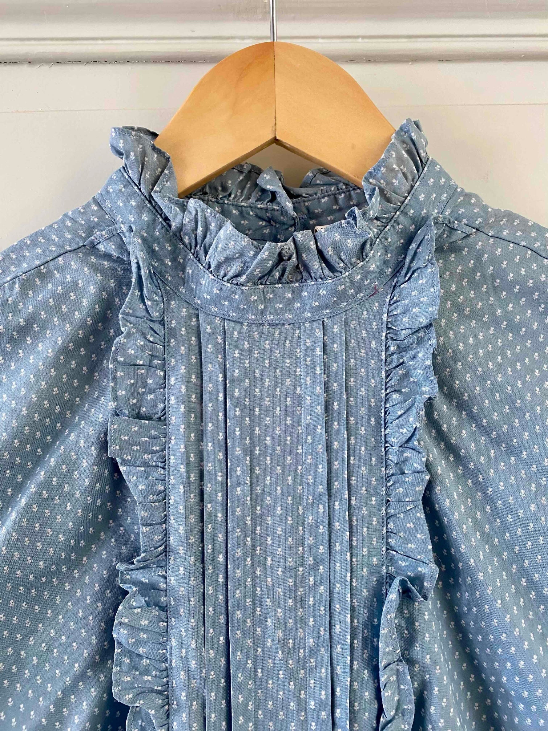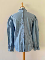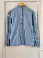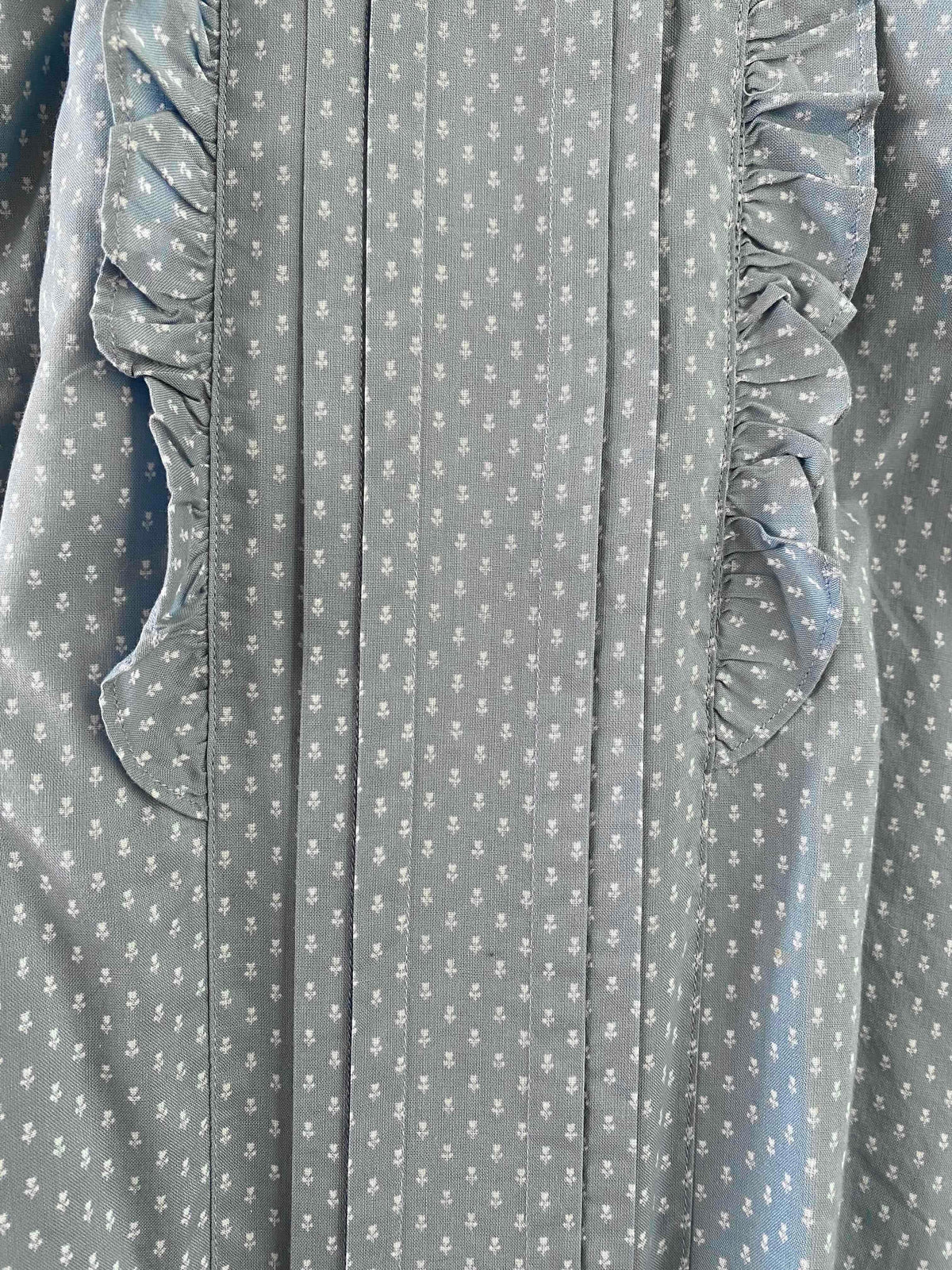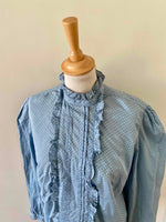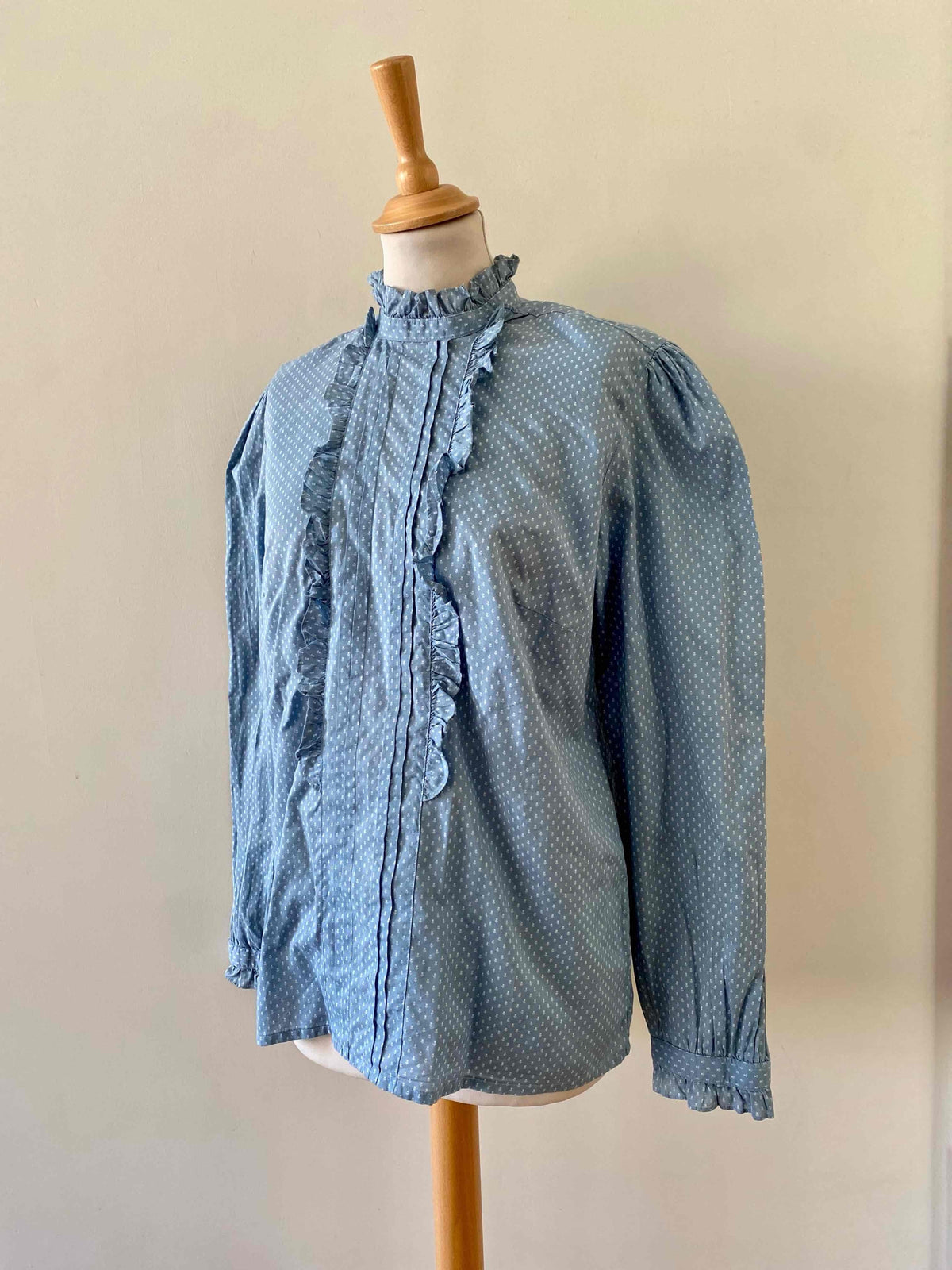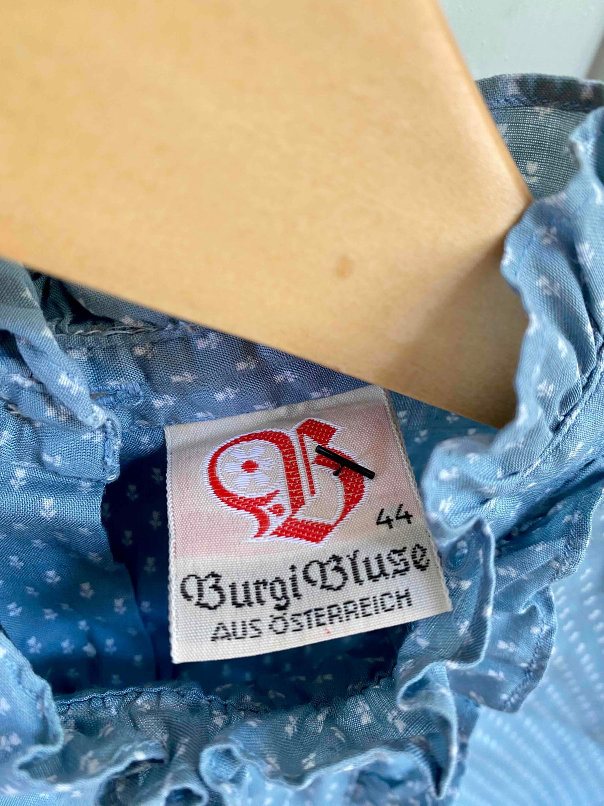 Blouse Autrichienne en coton bleu ciel imprimée minis fleurs blanches, manches ballons longues poignets volanté, col montant ruffle et jabot à volants, boutonnée au dos, fabriquée en Autriche, années 70’s, taille 36 portée ici sur un mannequin T36.