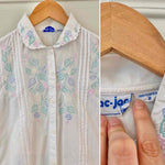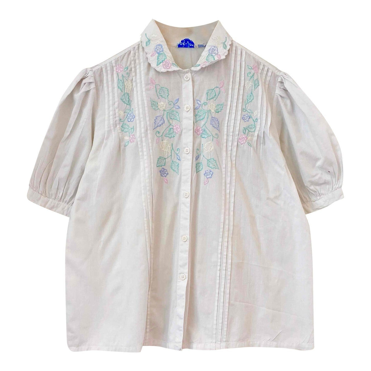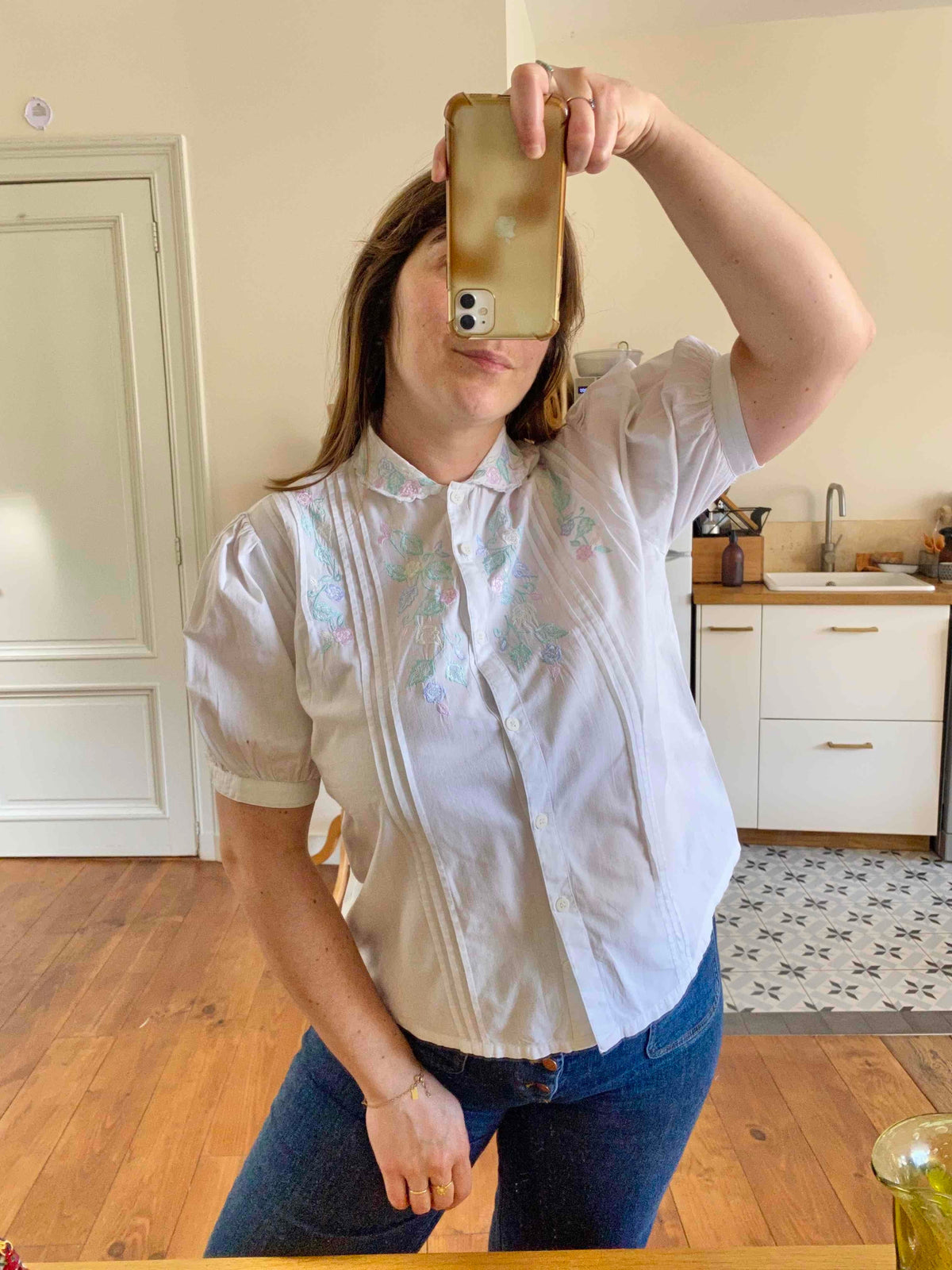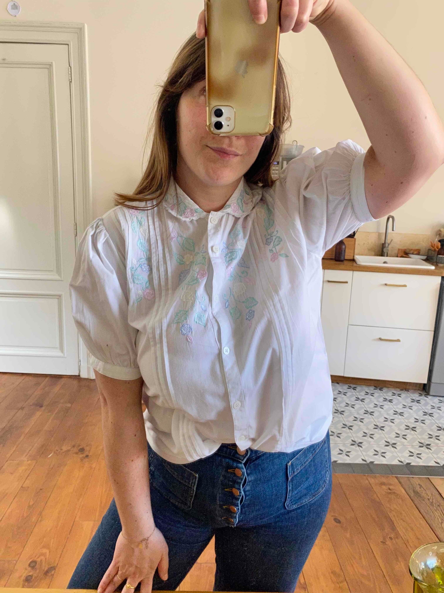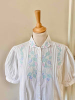 Prix unitaire parBlouse Brodée en 100% coton, col claudine et plastron brodé de fleurs pastels roses, vertes, jaunes et bleues, manches ballons, taille 38 portée ici sur un mannequin T36 et une personne T40.