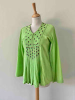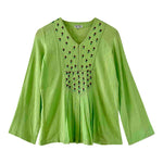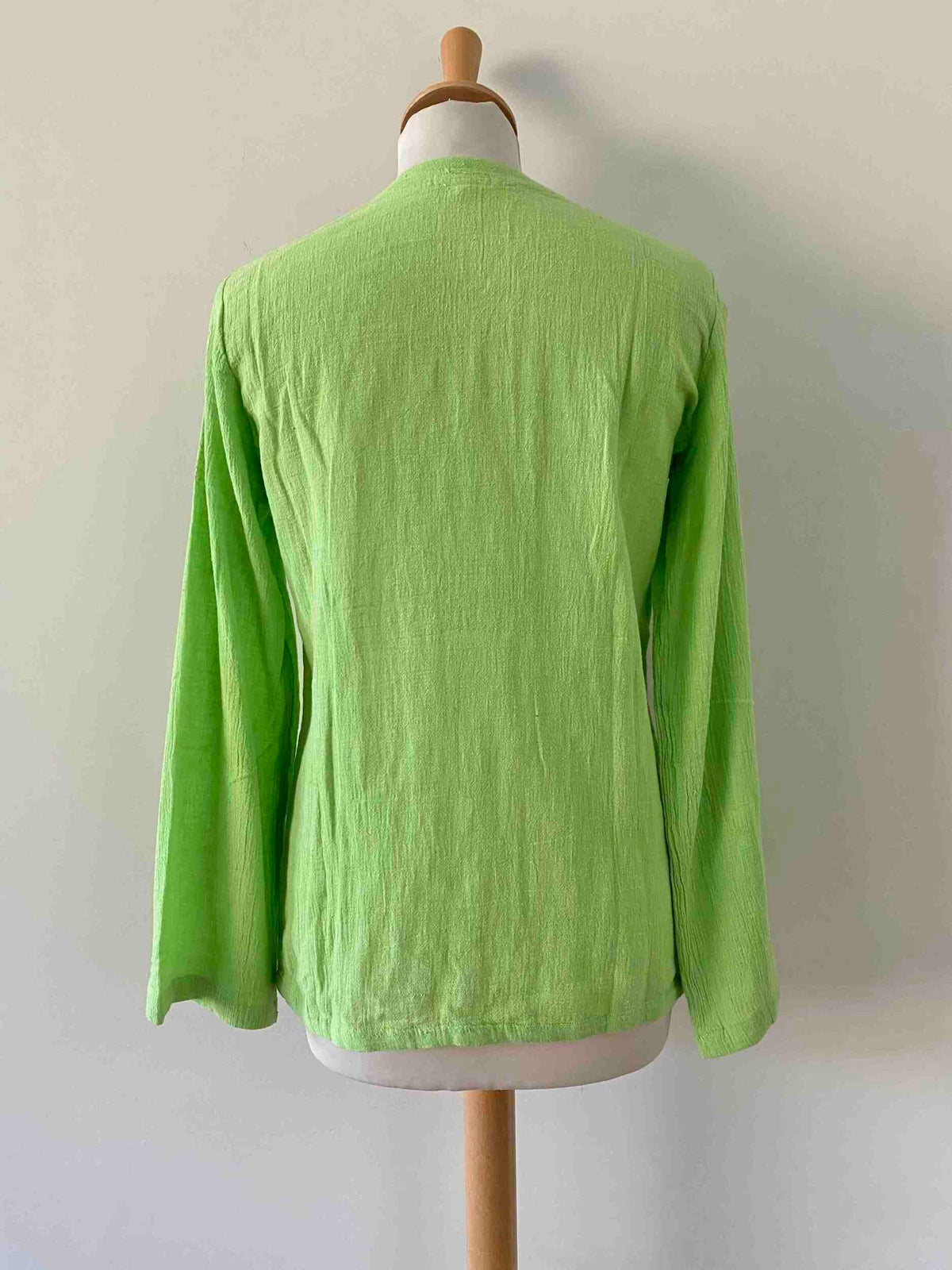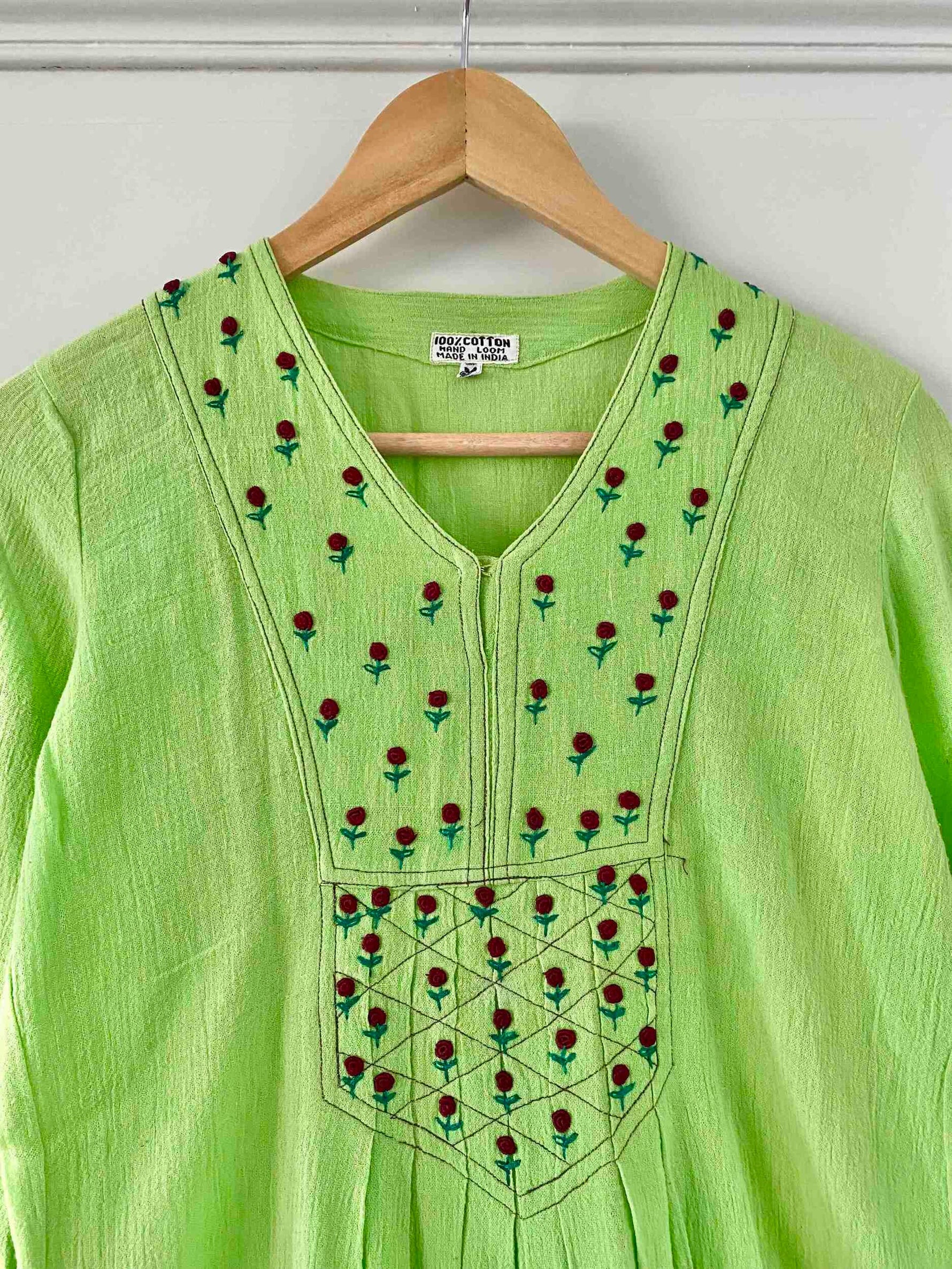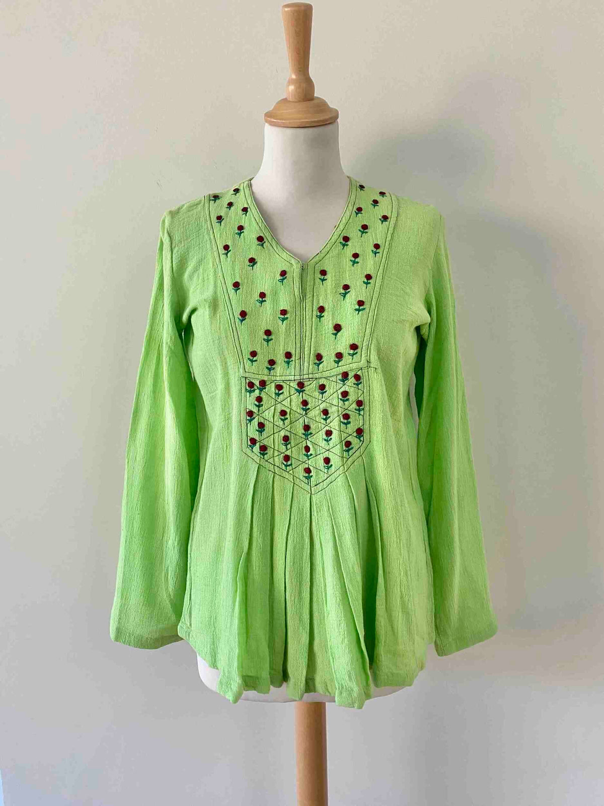 Prix unitaire parBlouse Brodée 70’s en gaze de coton vert pistache vif, plastron brodé de petites roses rouges, manches évasées, forme trapèze, fabriquée et brodée mains en Inde.