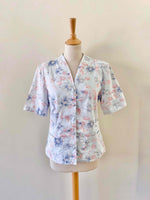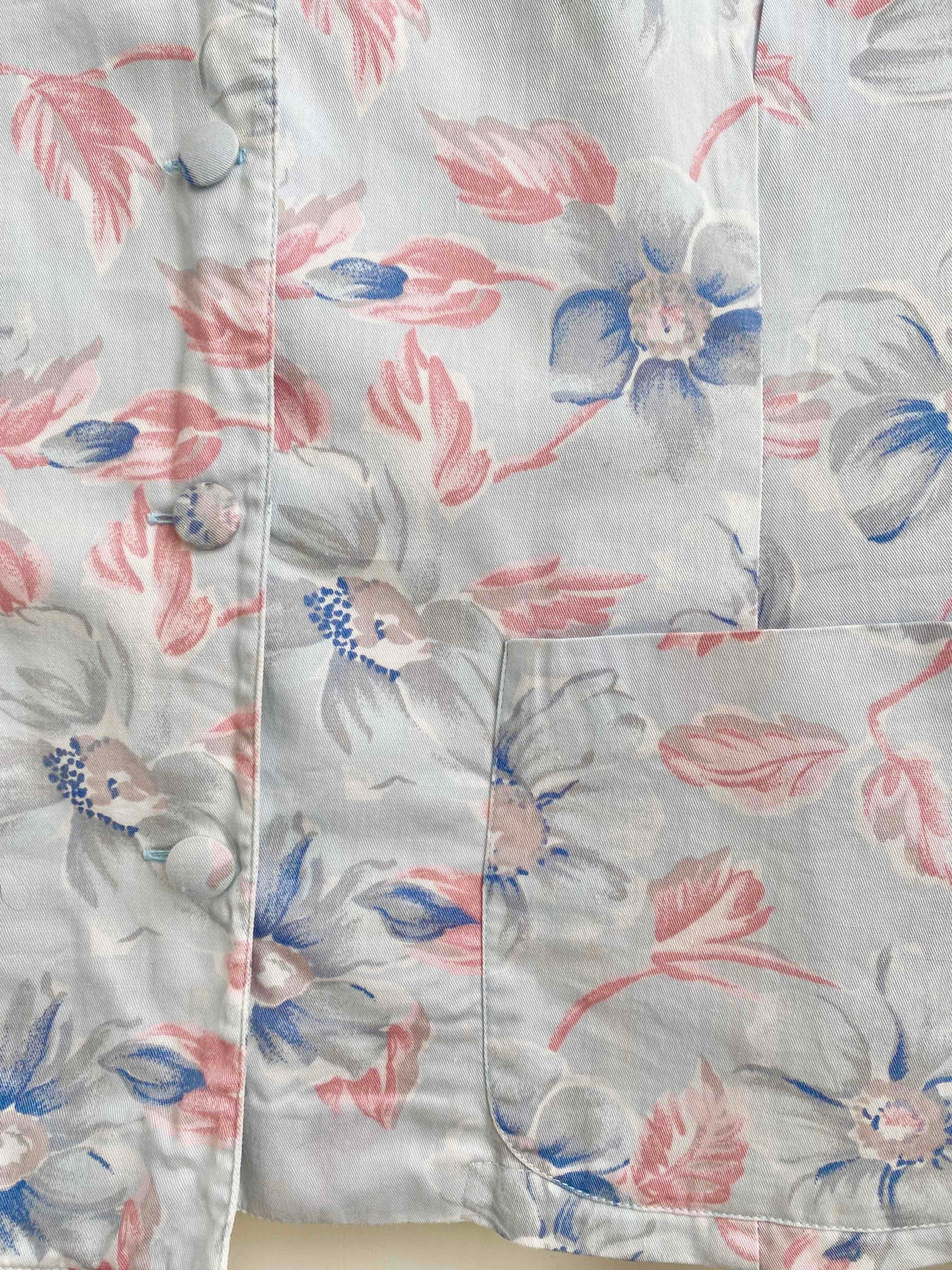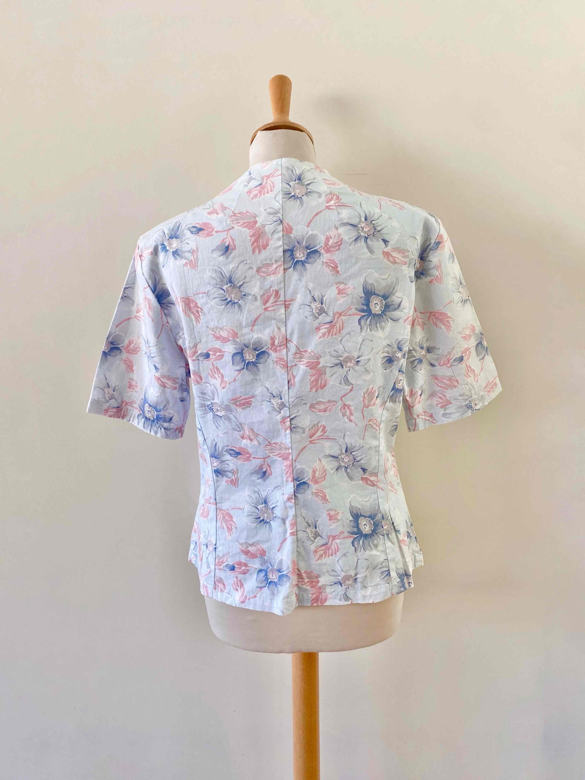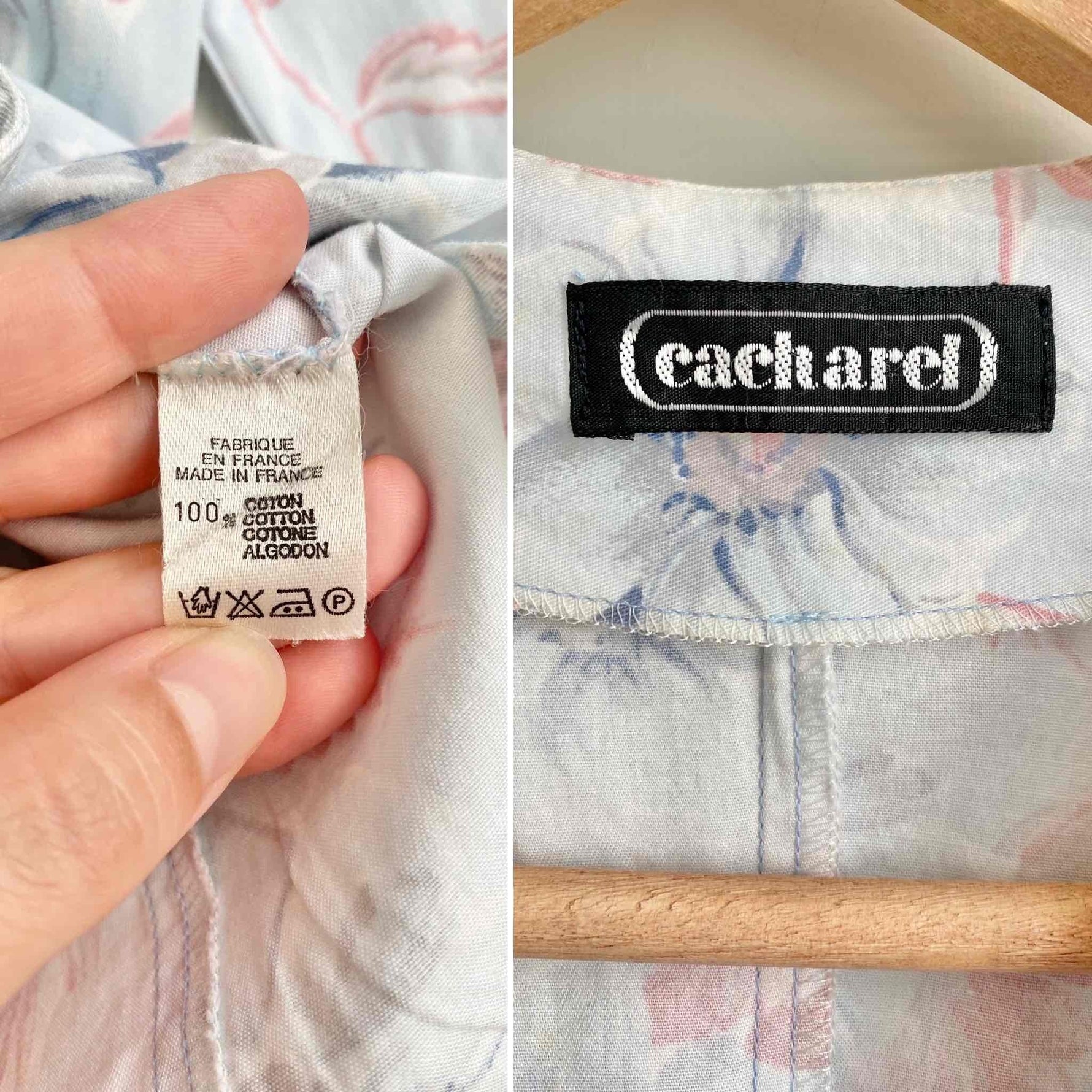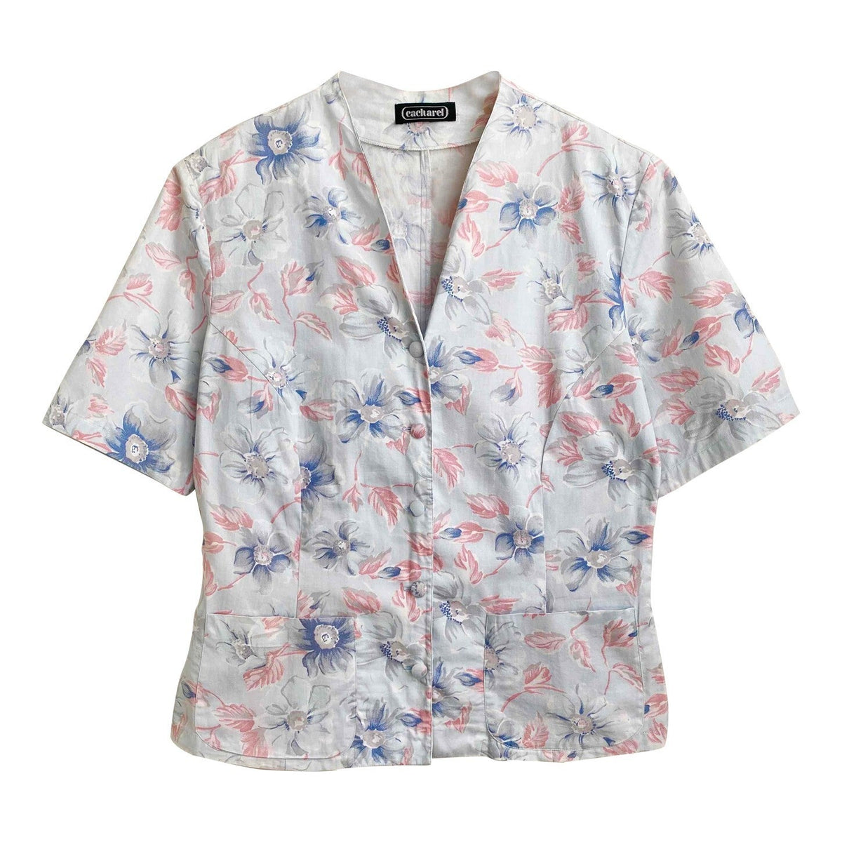 Prix unitaire parBlouse Cacharel à fleurs en 100% coton made in France bleu ciel imprimé fleurs pastels roses, bleues et blanches, col V, manches courtes, boutons recouverts, taille 36 porté ici sur un mannequin T36.