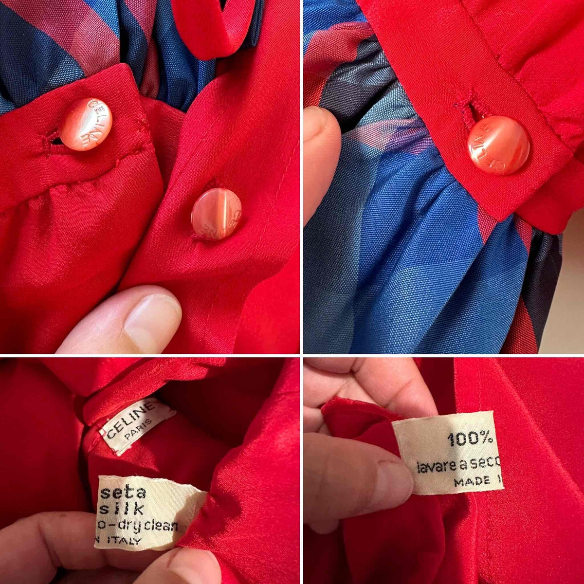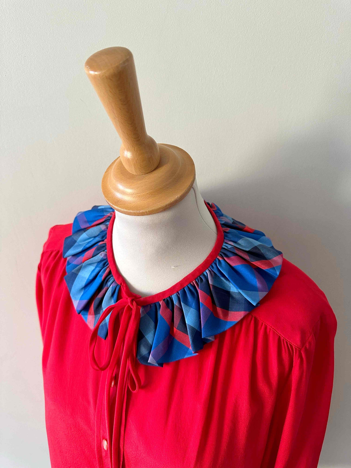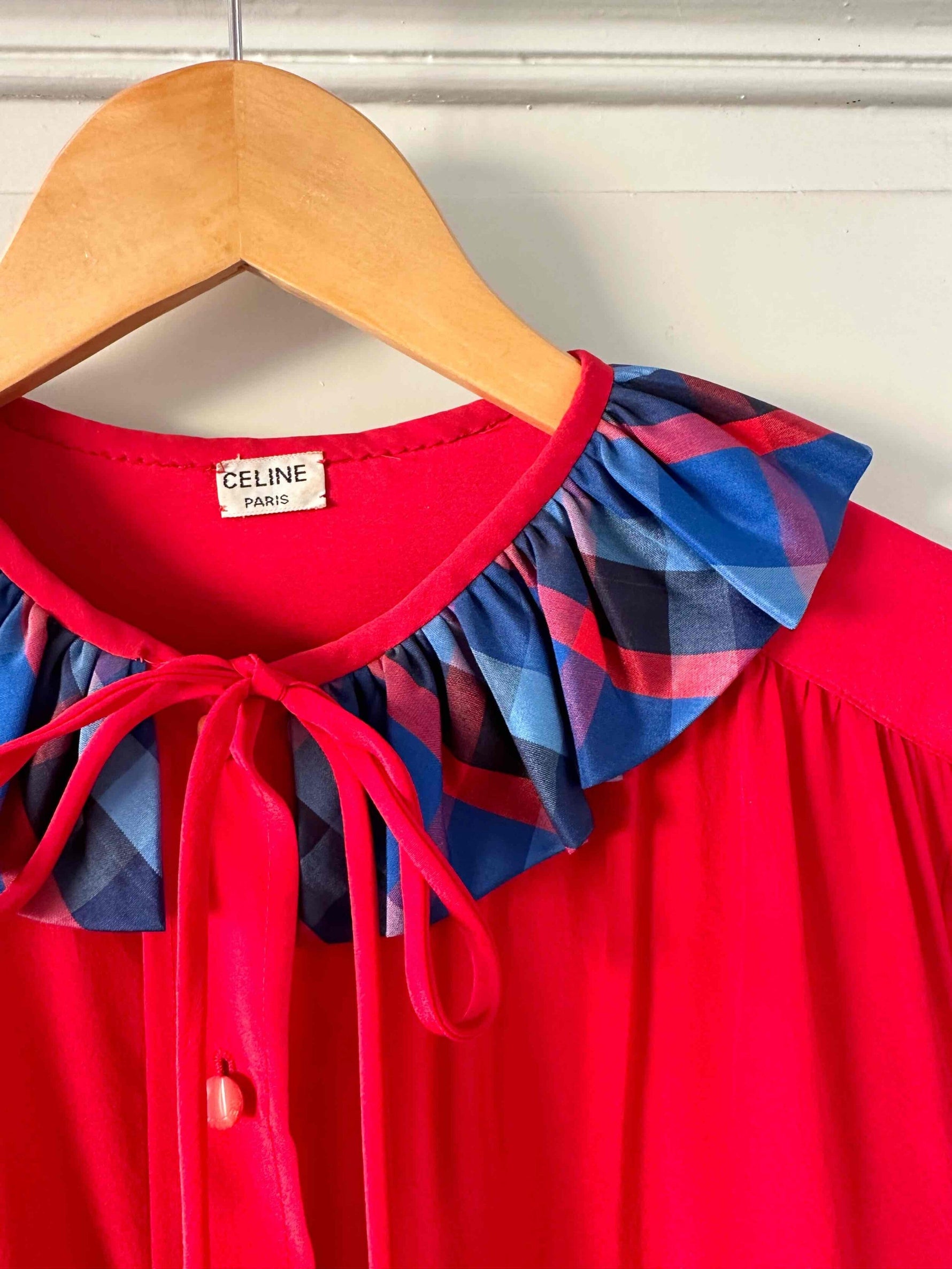 Prix unitaire parBlouse en soie Celine, 100% soie rouge, colerette et poignets plissés à carreaux vichy bleus et rouges, lien à nouer col, boutons gravés Celine, fabriquée en Italie, taille 36 portée ici sur un mannequin T36.