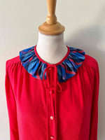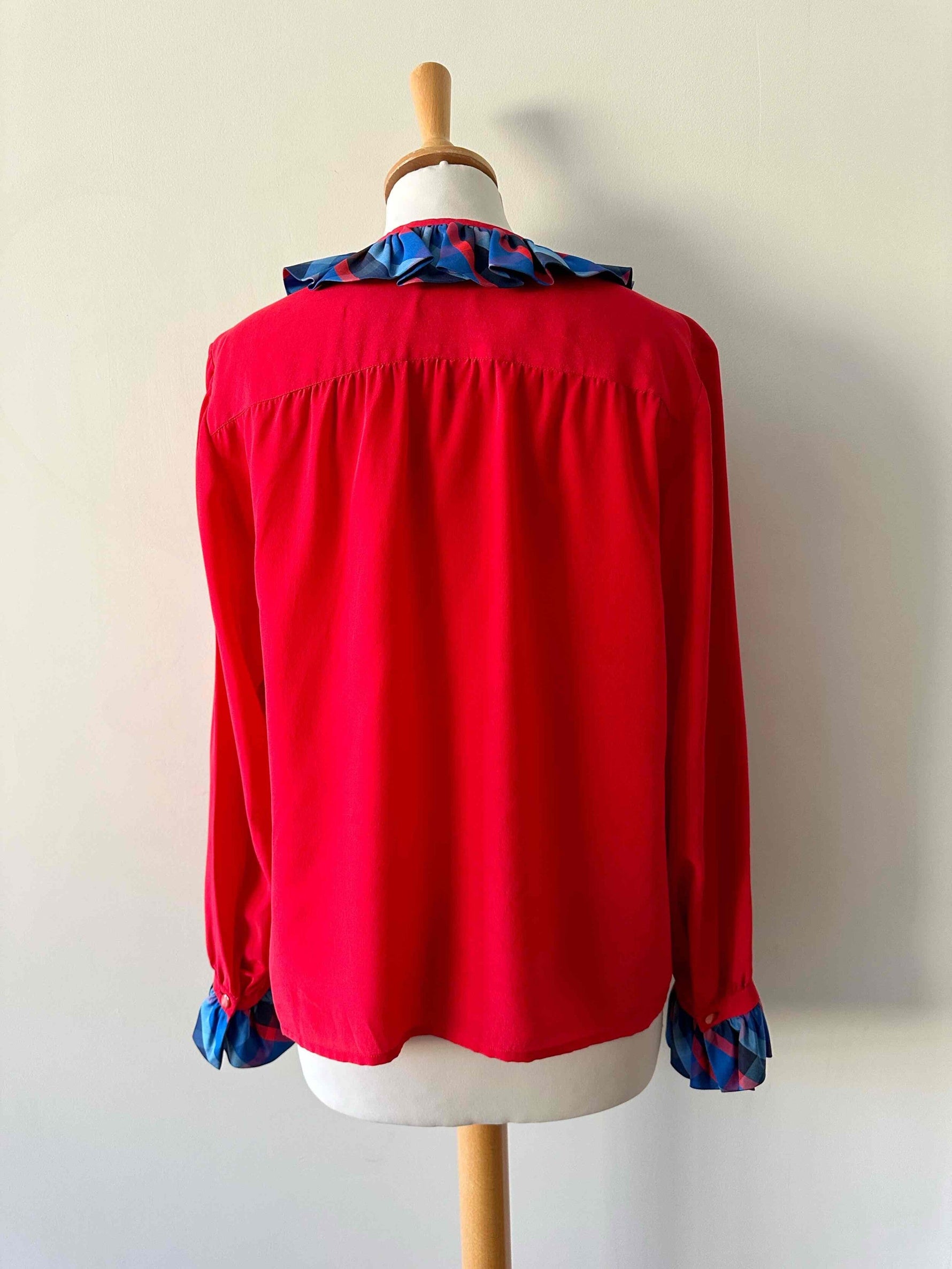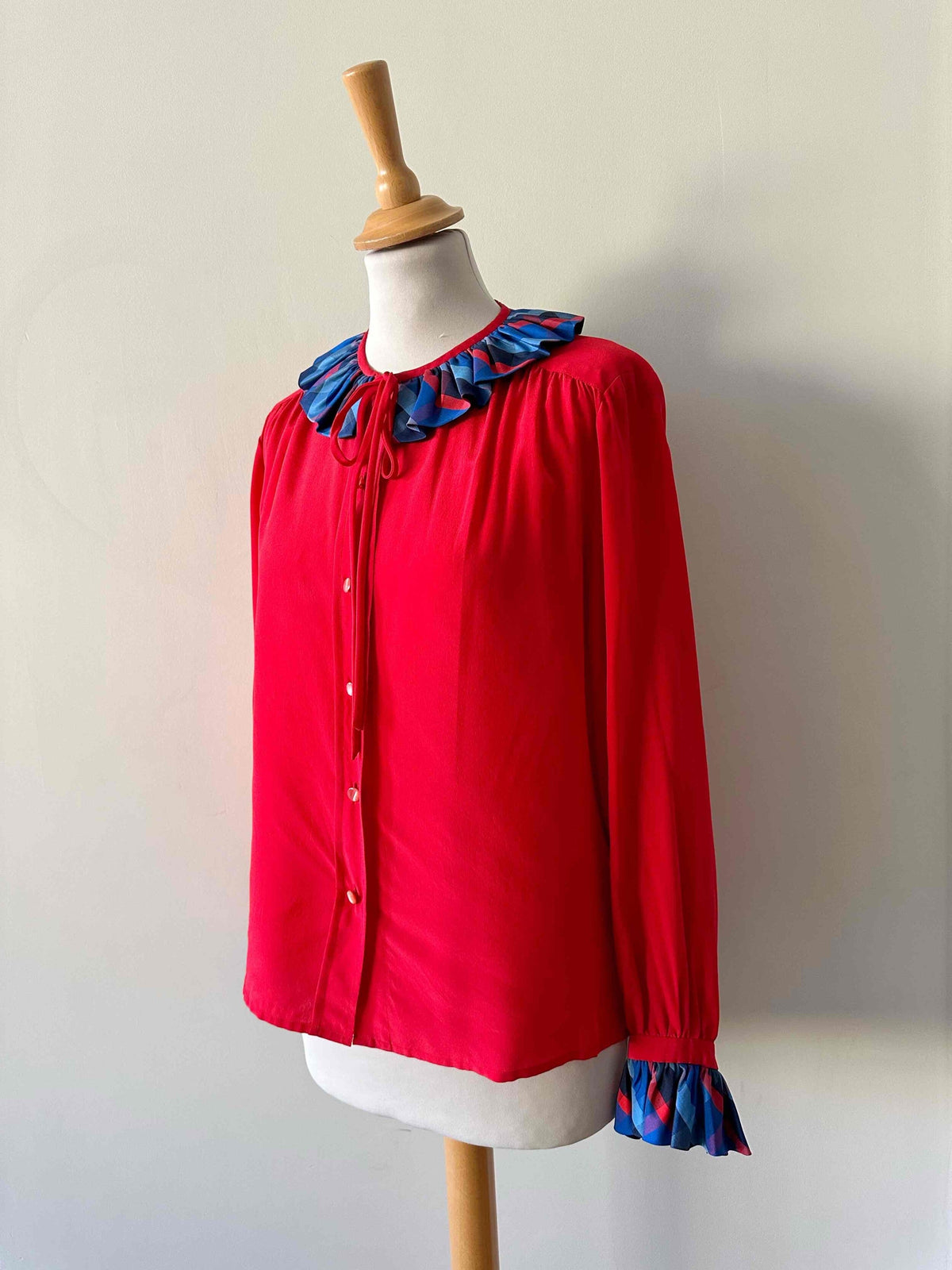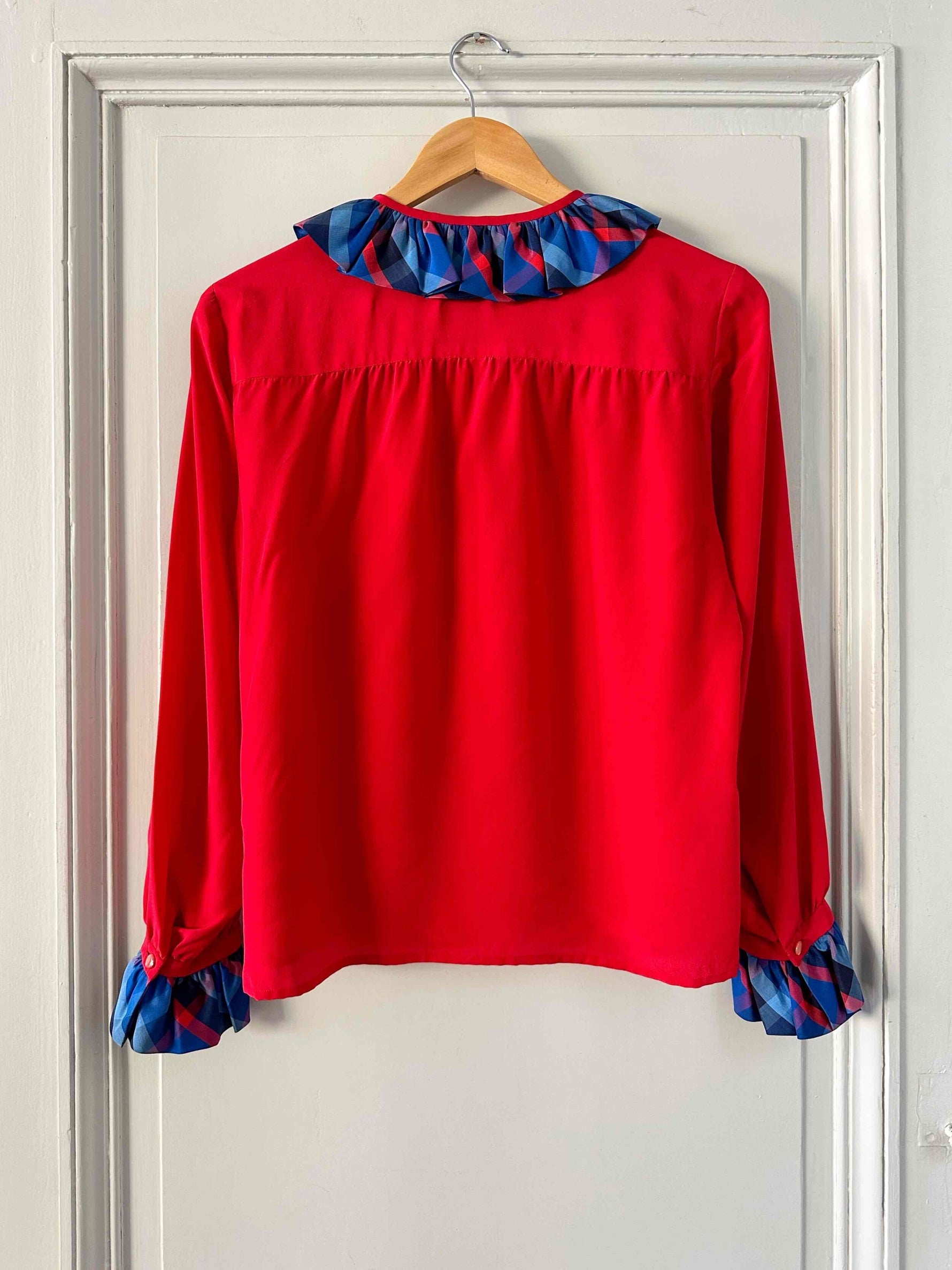 Prix unitaire parBlouse en soie Celine, 100% soie rouge, colerette et poignets plissés à carreaux vichy bleus et rouges, lien à nouer col, boutons gravés Celine, fabriquée en Italie, taille 36 portée ici sur un mannequin T36.