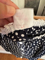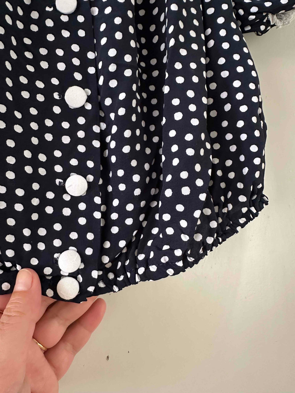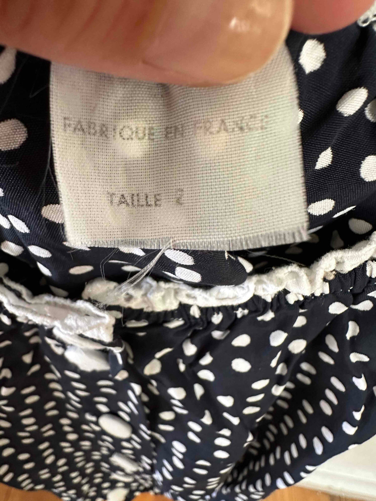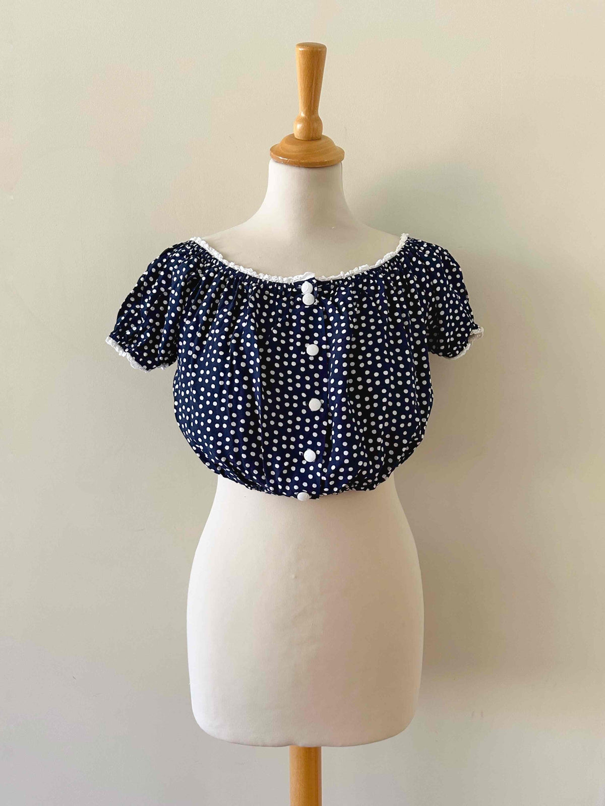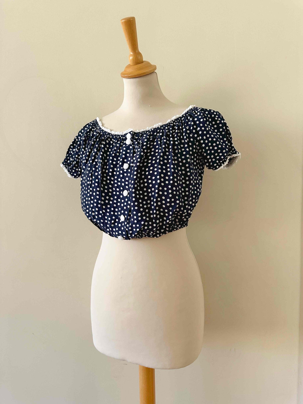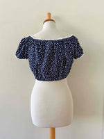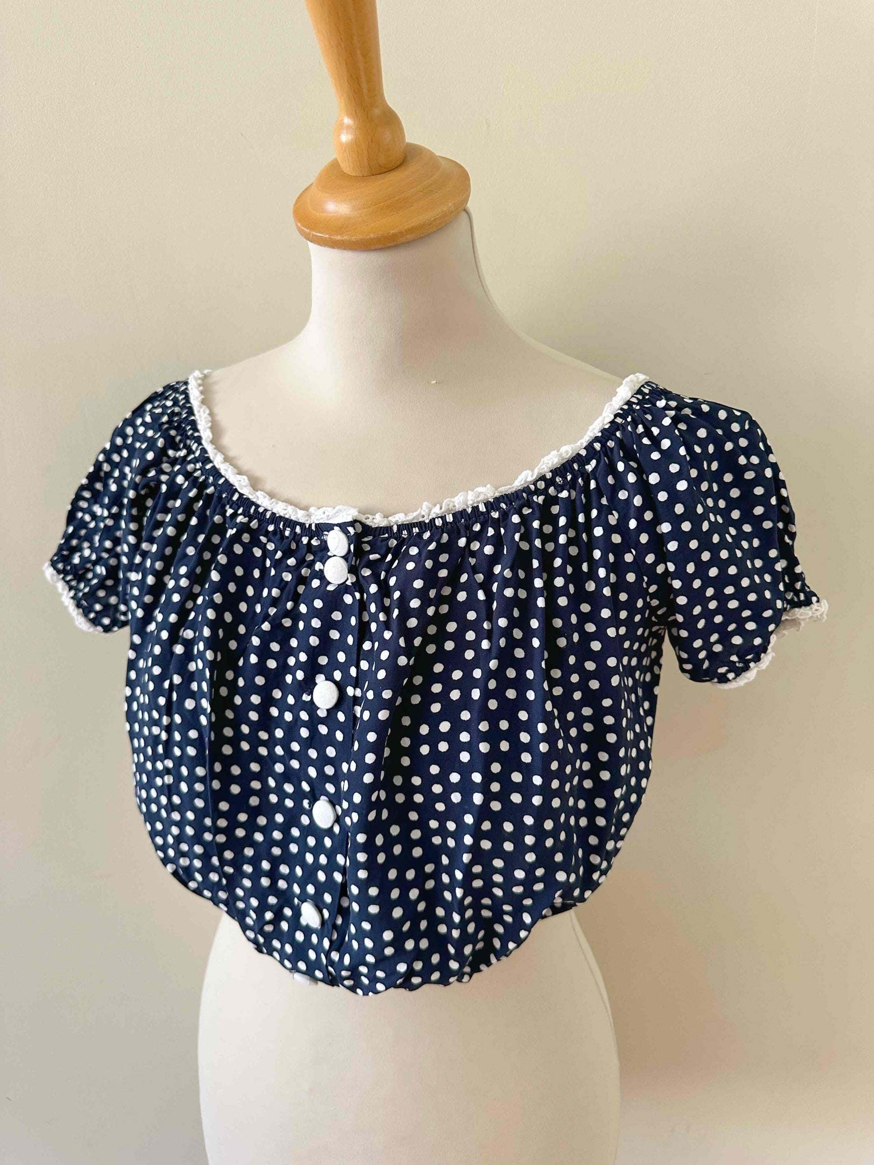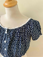 Prix unitaire parBlouse crop à pois, en viscose bleu foncé imprimée pois blancs, bordures en broderies anglaises blanches, élastiques, boutons blancs devant, fabriquée en France, taille 36 portée ici sur un mannequin T36.