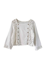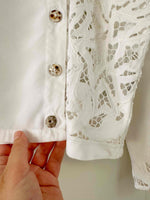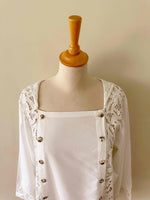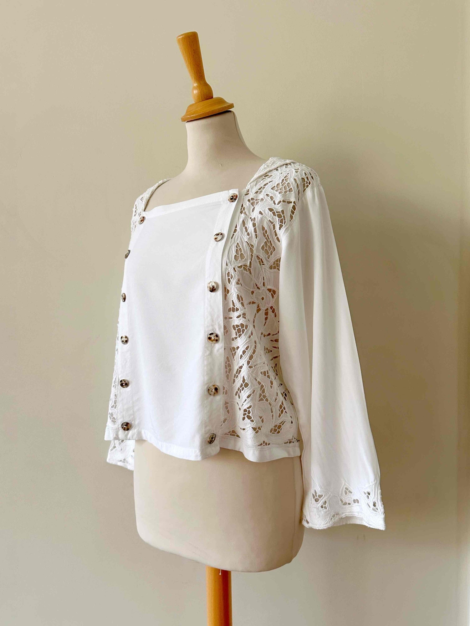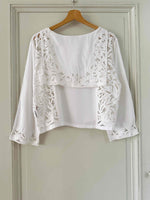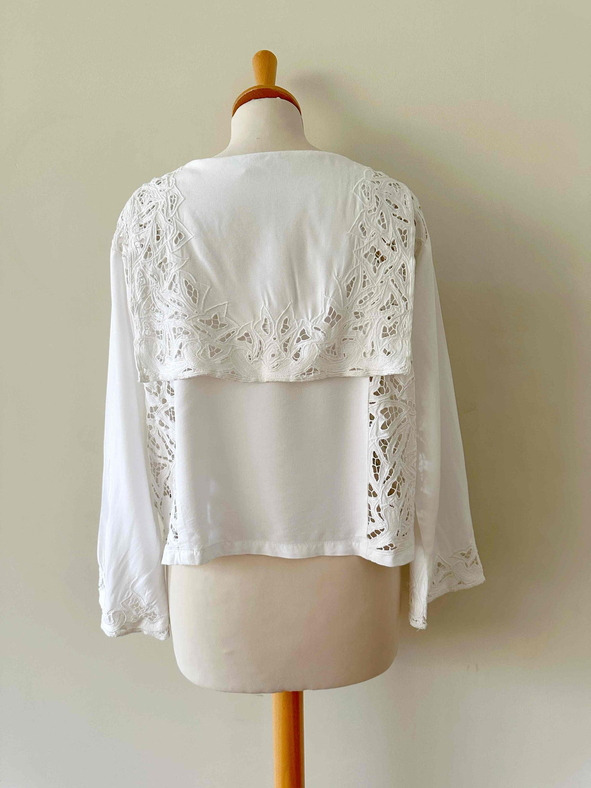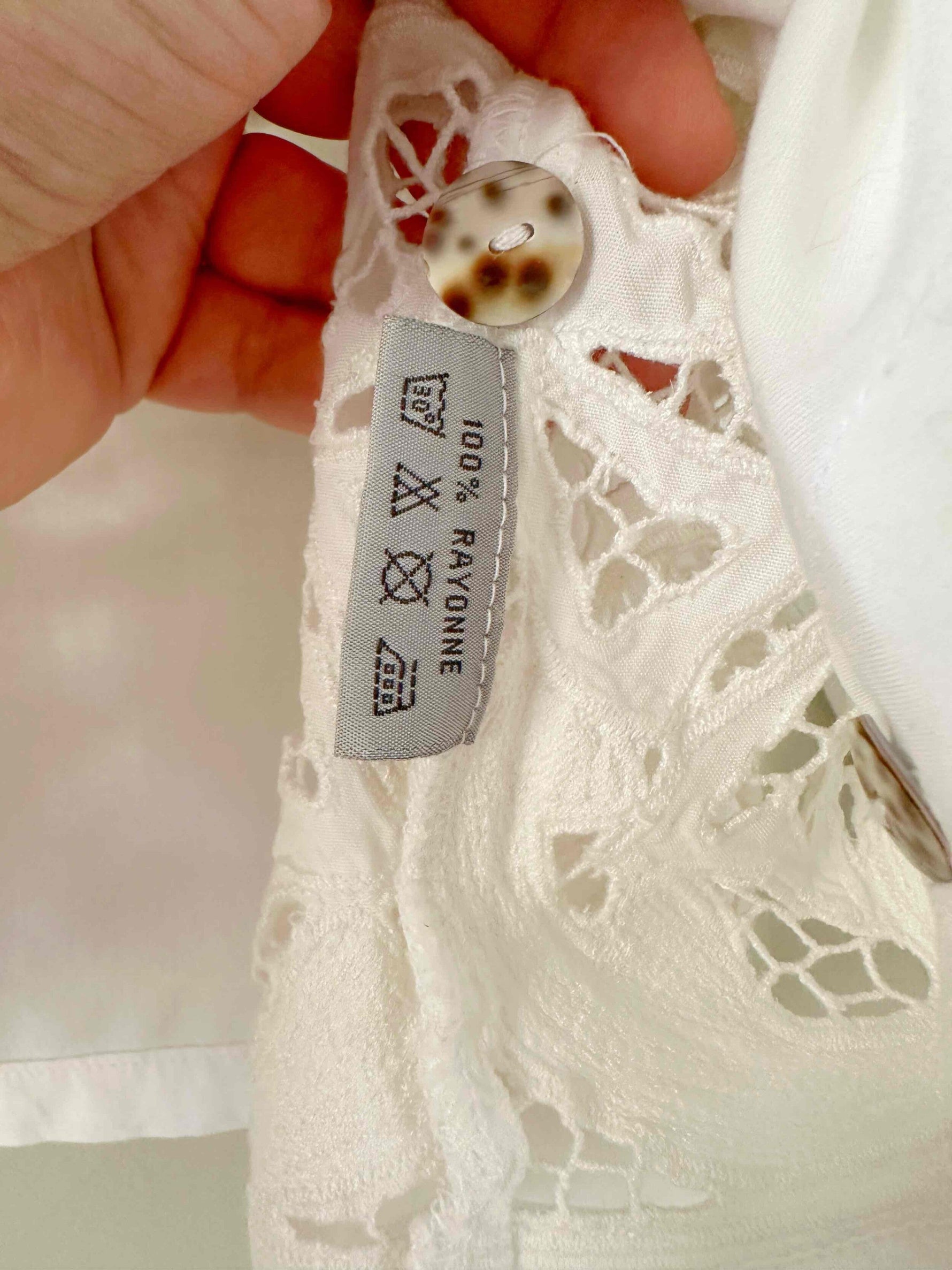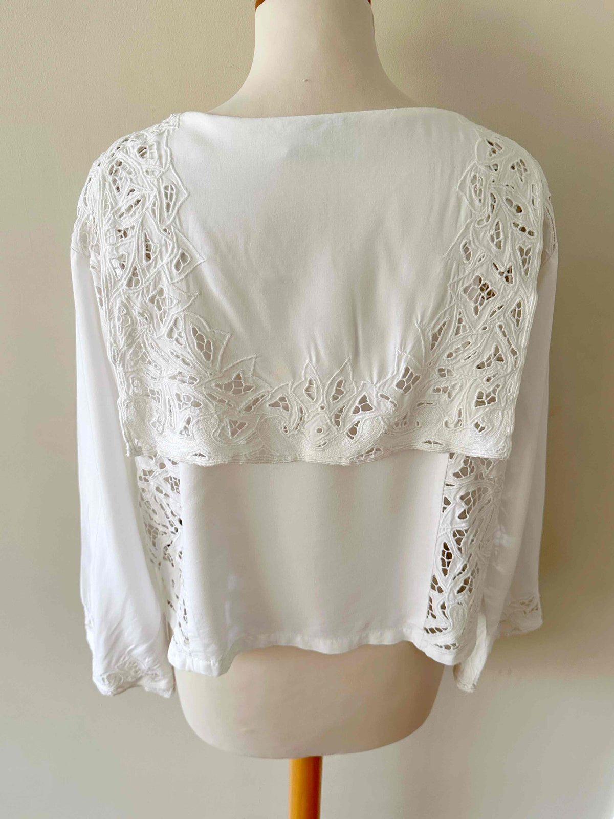 Prix unitaire parBlouse brodée à col, en viscose blanche ajouréde broderies anglaises florales, devant à pont avec boutons écailles de tortue, grand col colerette esprit marin au dos, manches évasées, taille 36 portée ici sur un mannequin T36.
