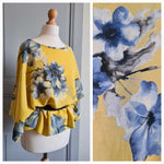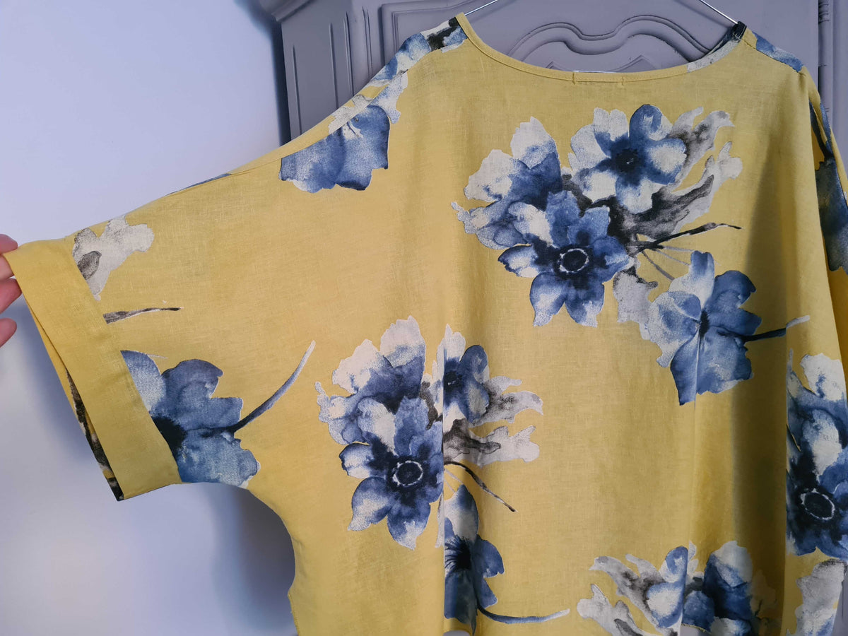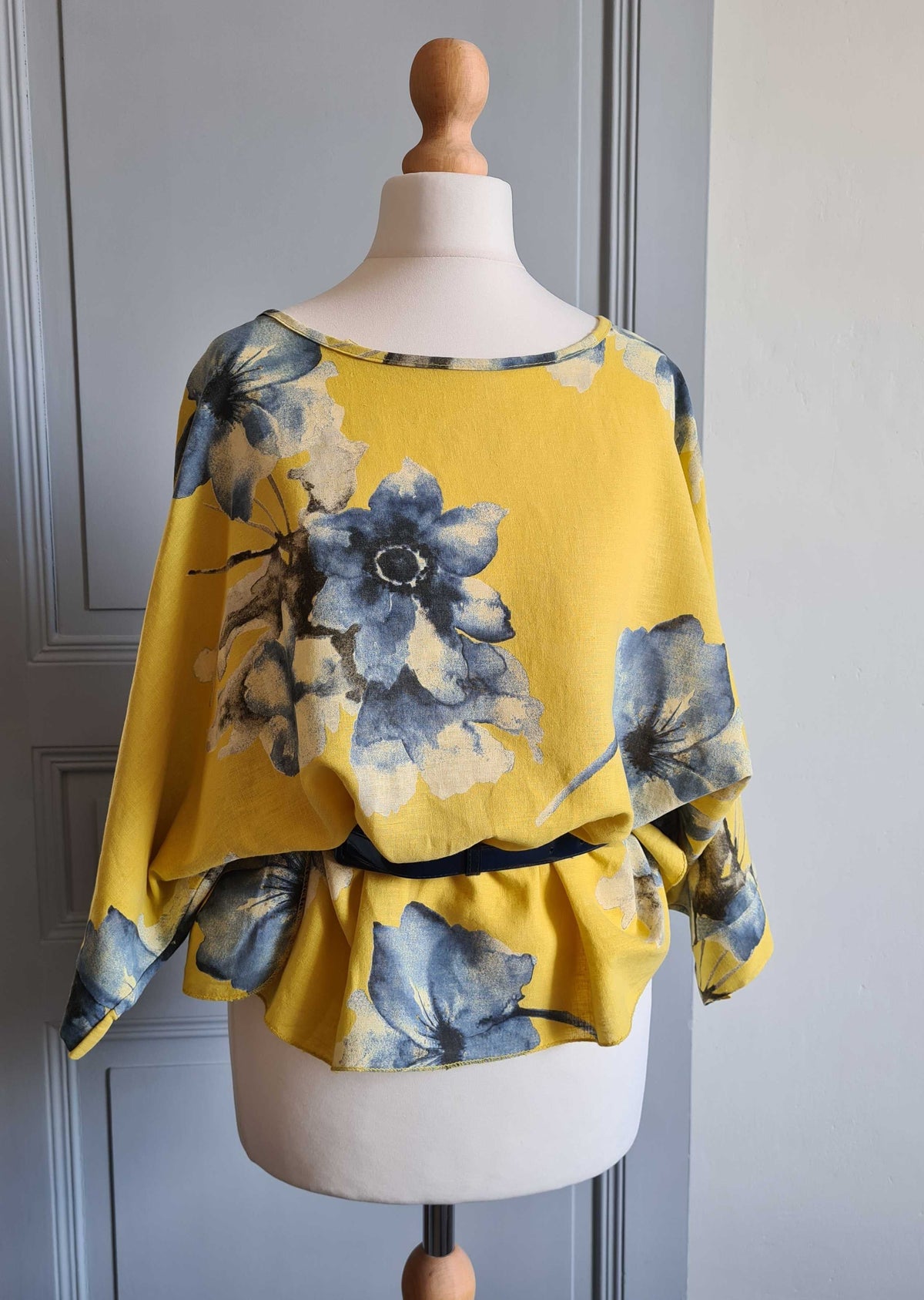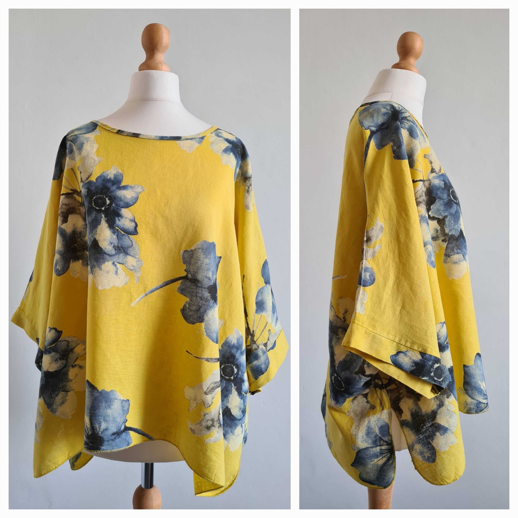 Prix unitaire parBlouse en lin jaune à motif floral aquarelle, encolure ronde, coupe droite fluide maxi oversize, petites fentes côtés. À porter ceinturé, effet blousant. Pièce 100% lin, fabriquée en Italie.