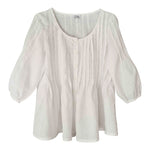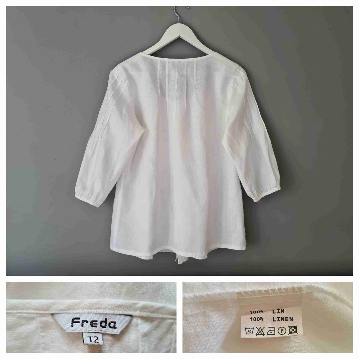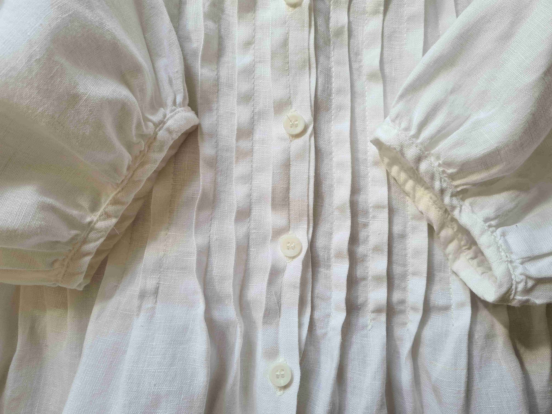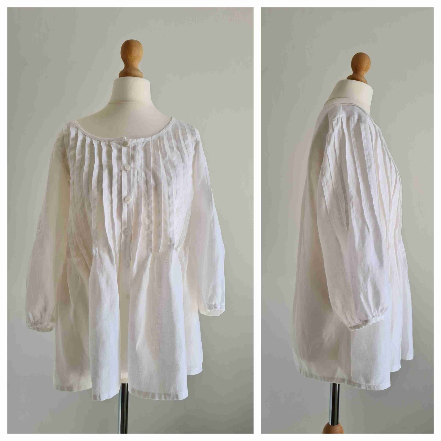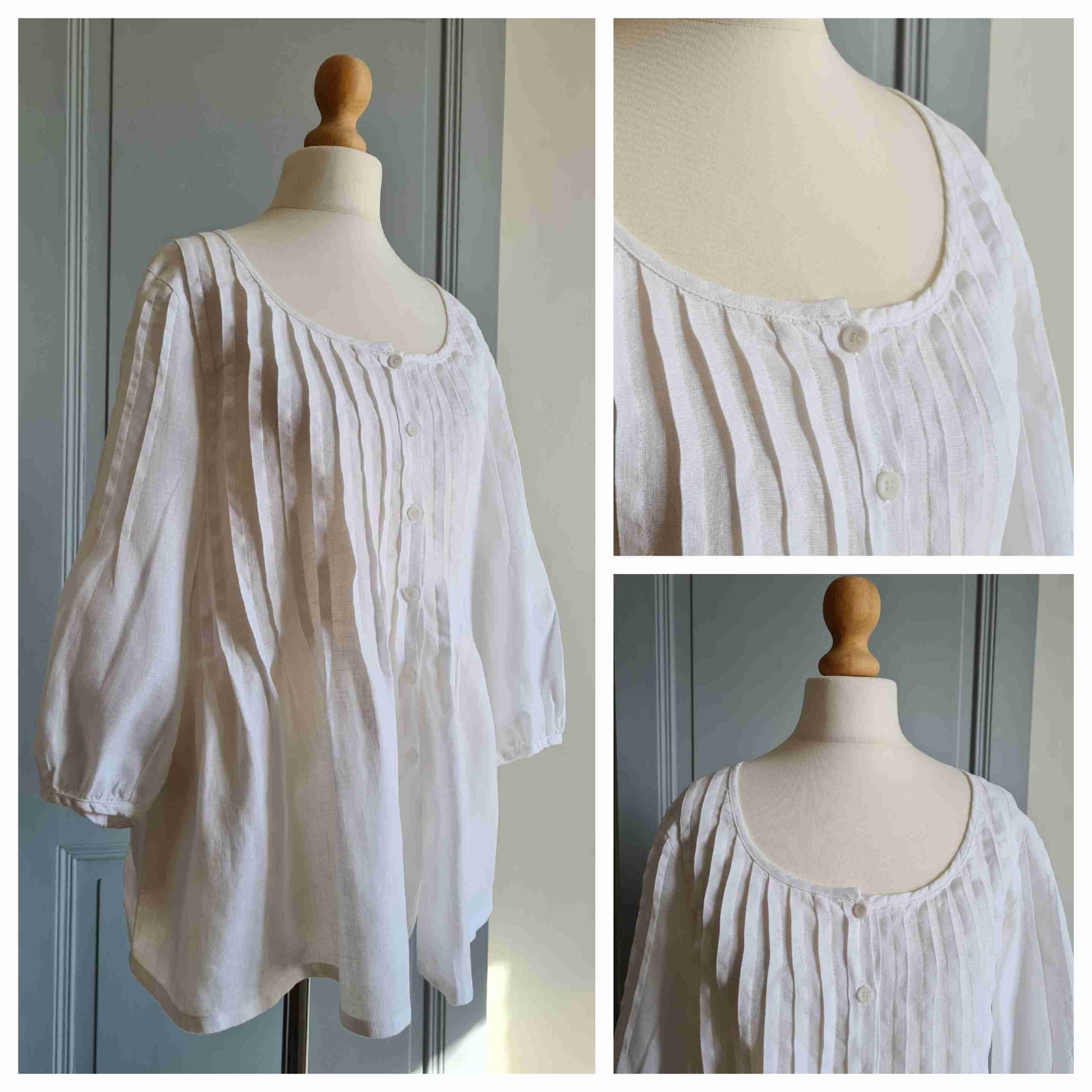 Prix unitaire parBlouse 100% lin blanc à petits plis plats cousus, large encolure, boutonnée, coupe ample avec bas ondulant, manches 3/4 à poignets froncés. Porté sur les photos par une taille 36.