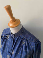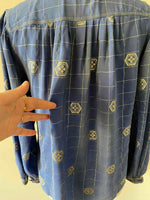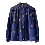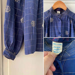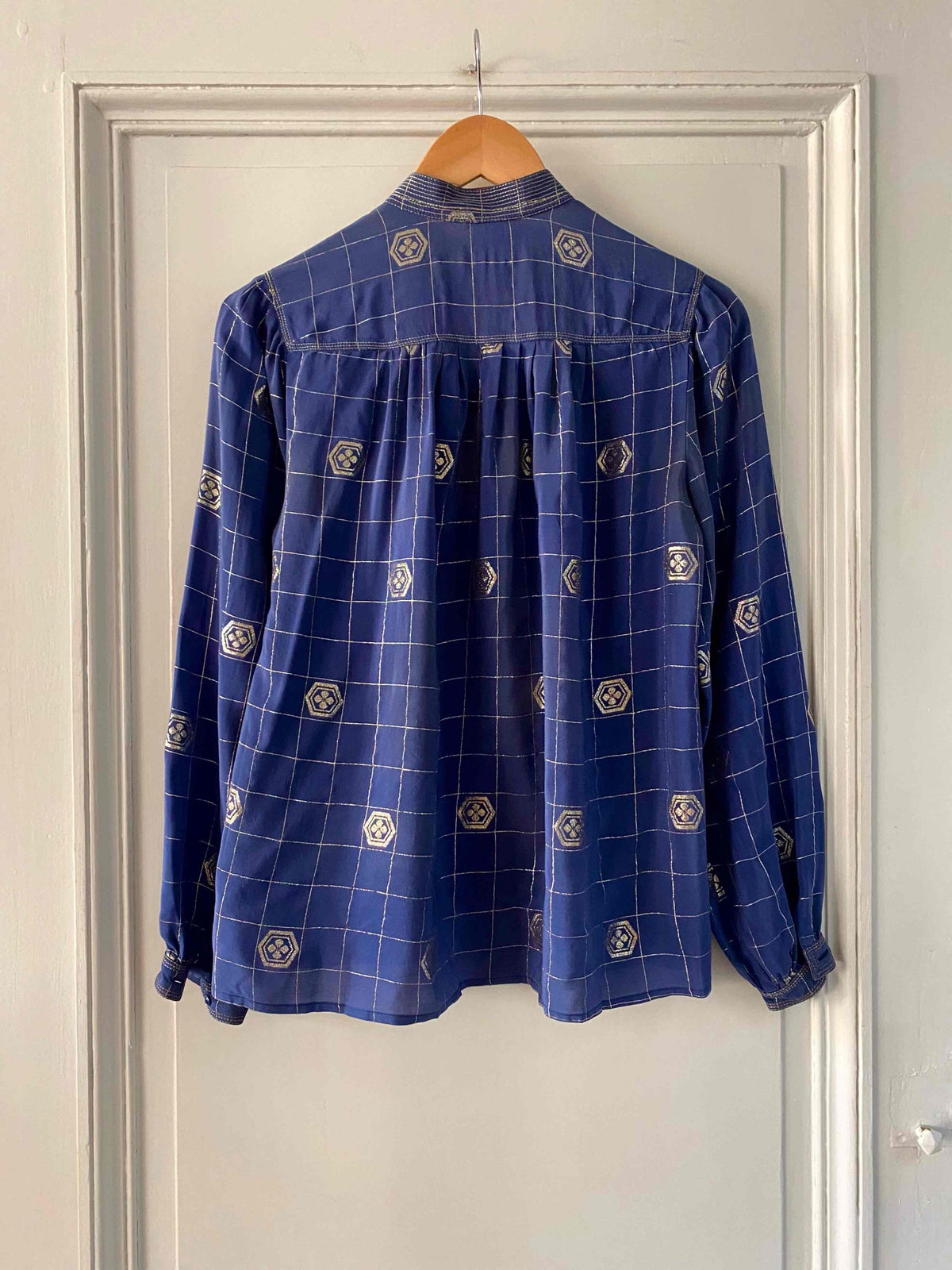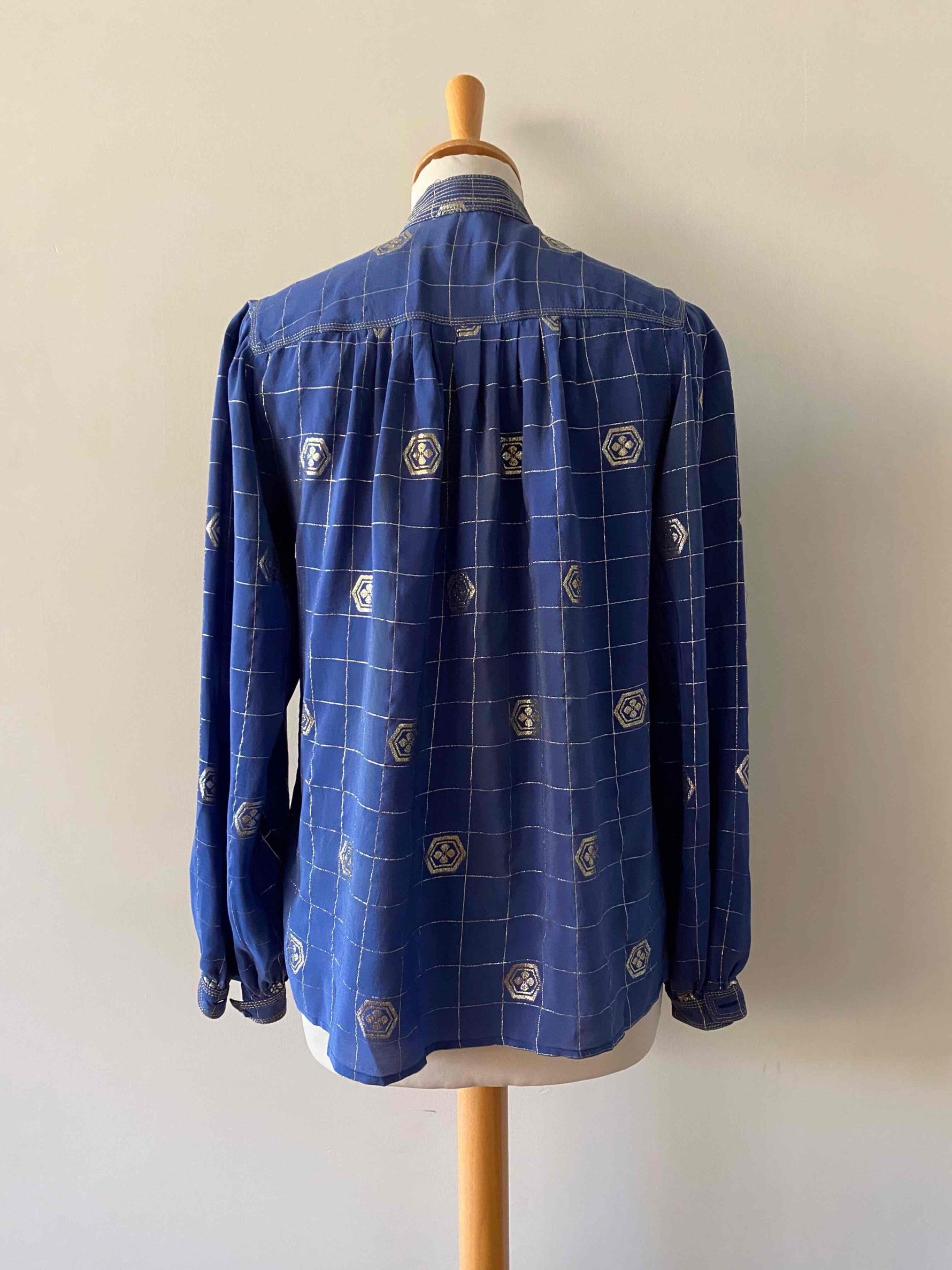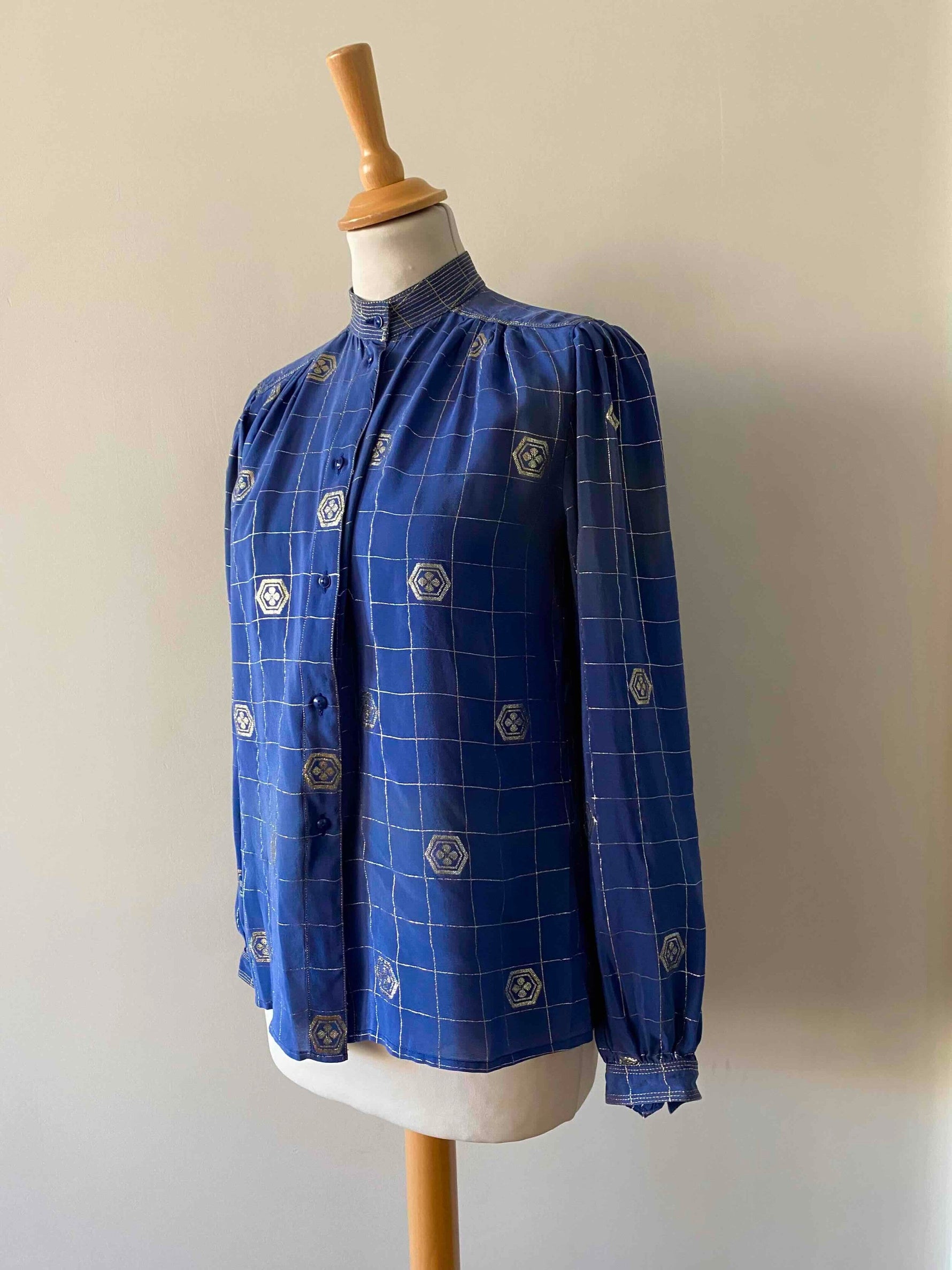 Prix unitaire parBlouse en soie et lurex, bleue nuit à carreaux et motifs lurex doré, col mao montant, manches ballons, forme légèrement trapèze, fabriquée en France, pièce rare des années 80’s, taille 34 et 36 portée ici sur un mannequin T36.