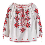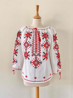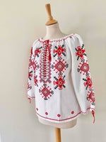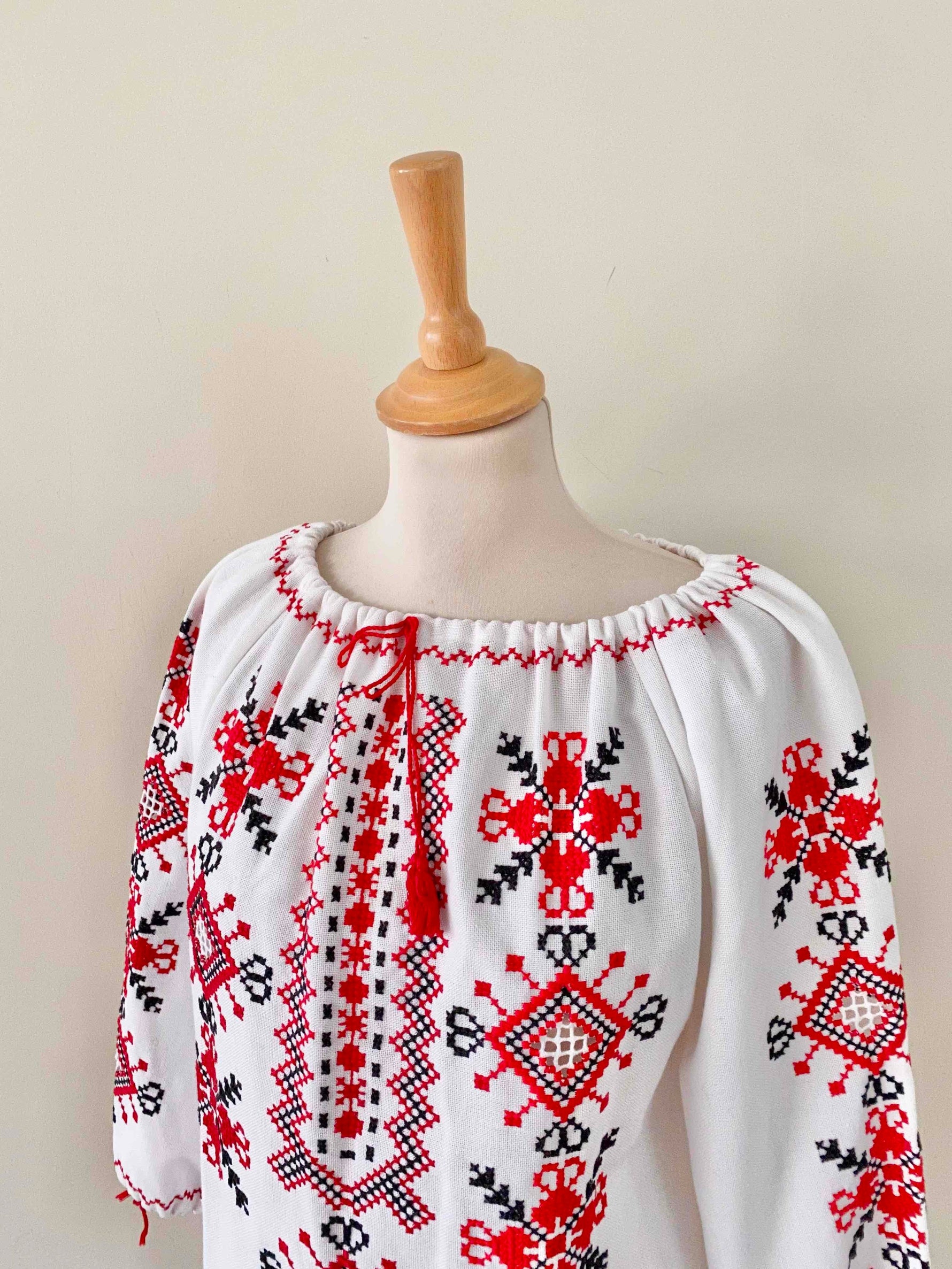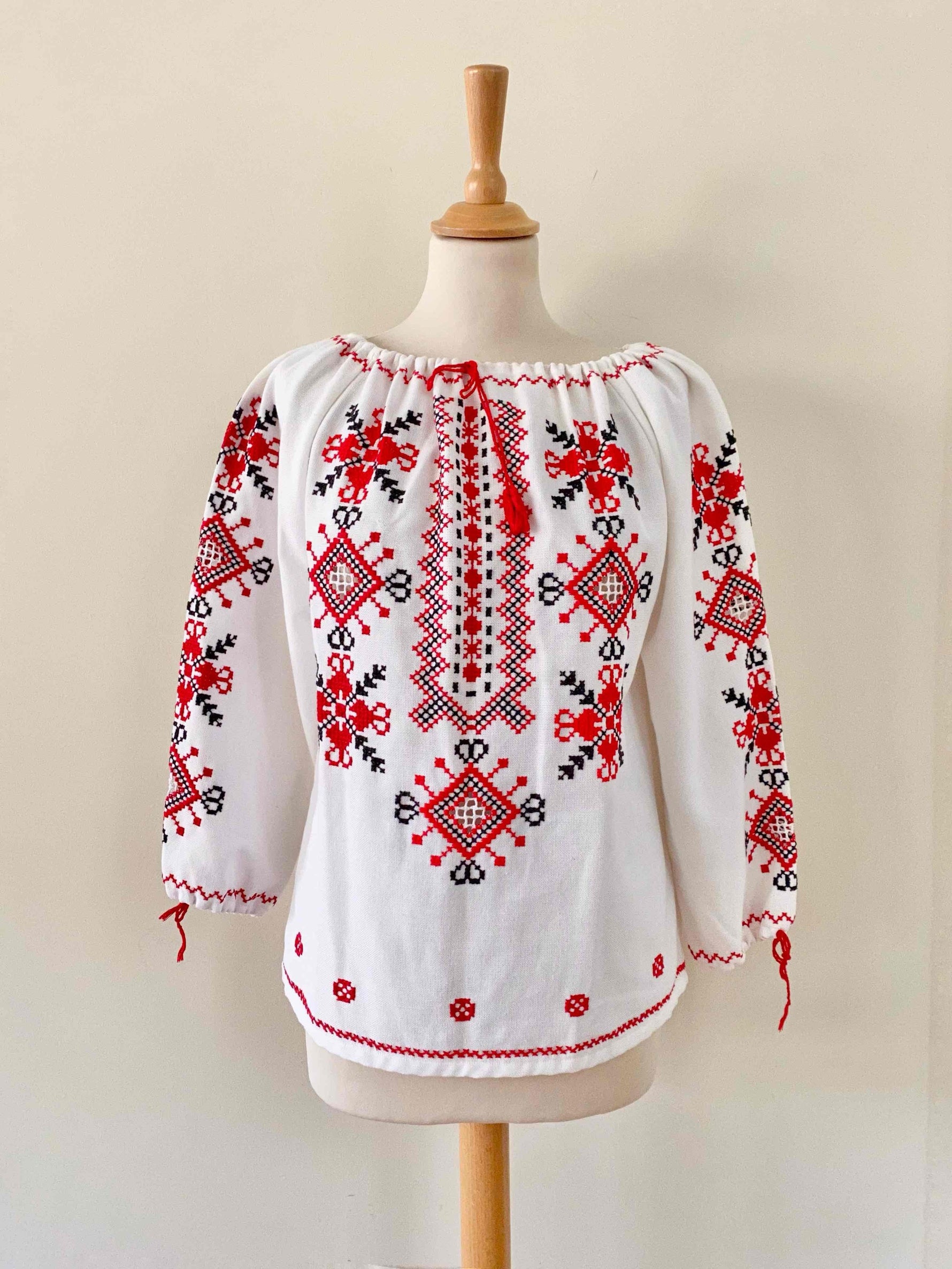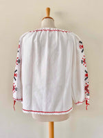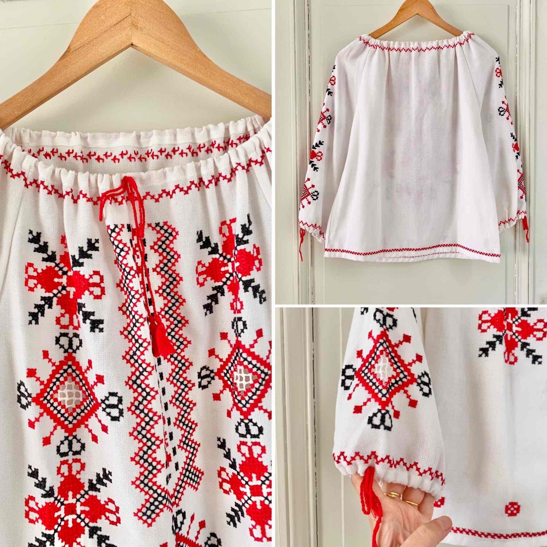 Prix unitaire parBlouse Hongroise en coton gaze blanc brodé de motifs au point de croix rouges et noirs, motifs ajourés dentelle, manches ballons à nouer par des pompons rouges, encolure bateau à froncer et nouer, fabriquée et brodée mains en Hongrie, années 70’s, taille 36/38 portée ici sur un mannequin T36.