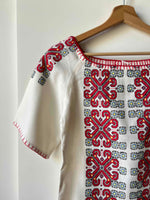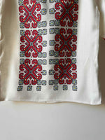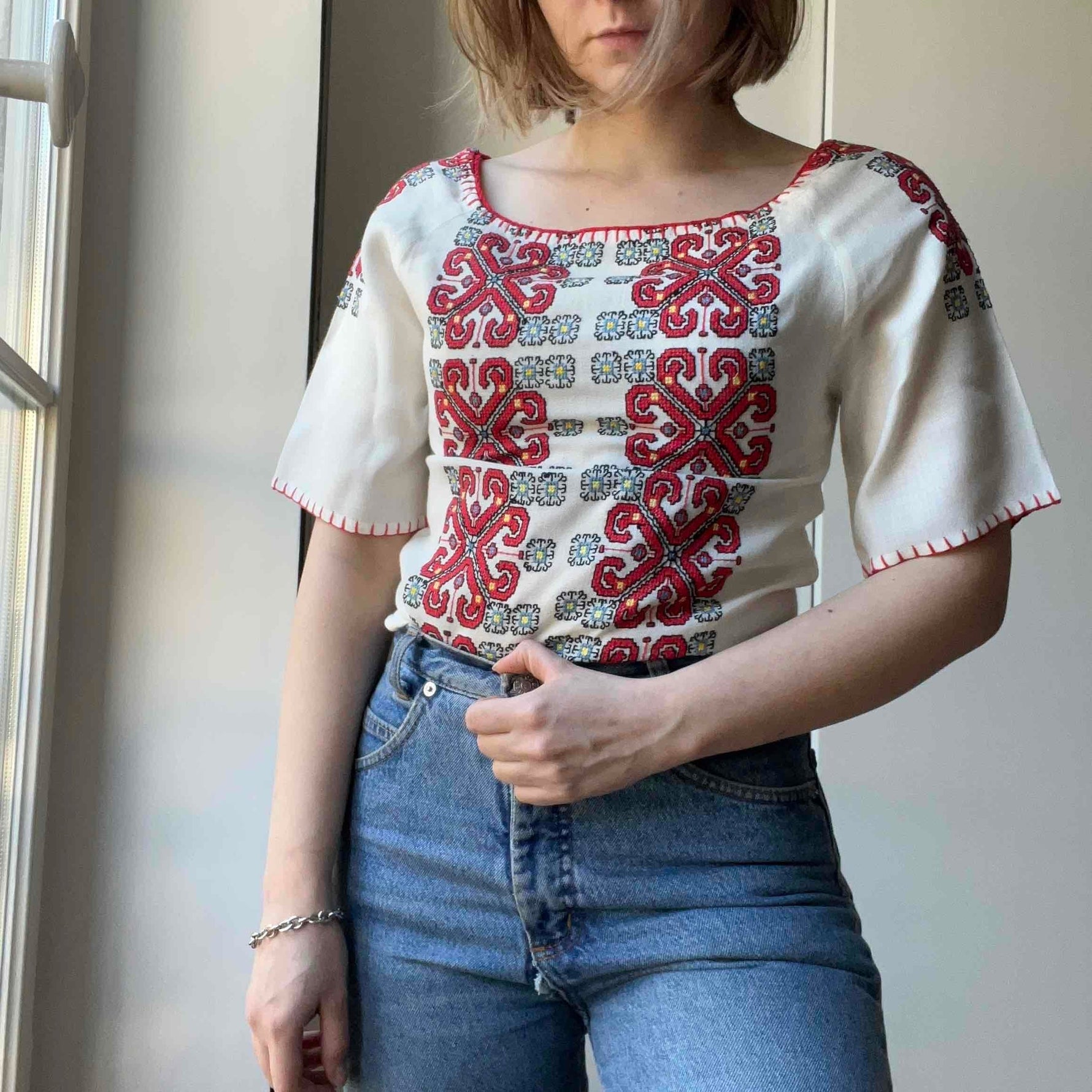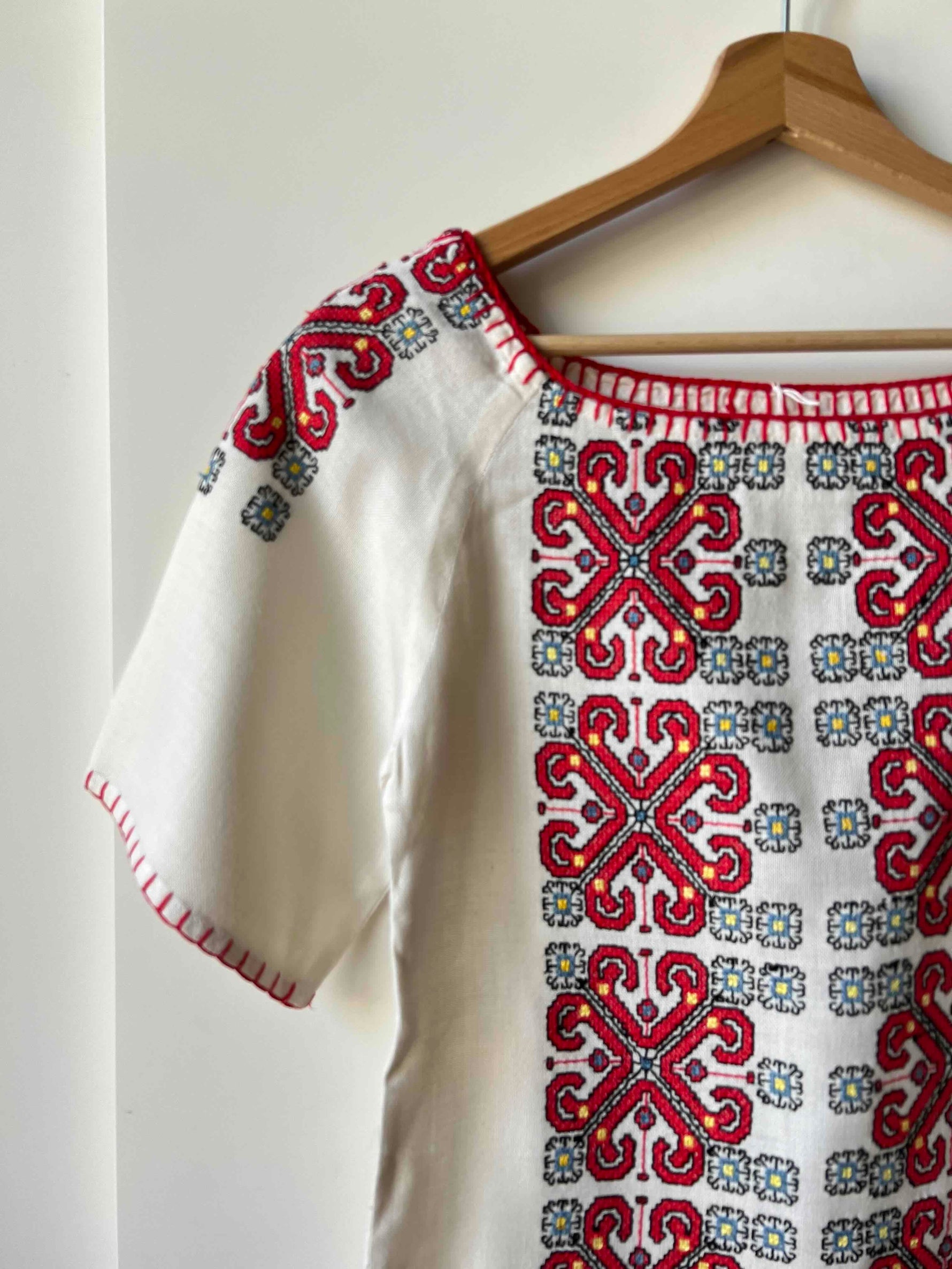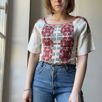 Prix unitaire parBlouse hongroise en coton et lin brodée de rouge. Manches courtes. Taille 34 (petite poitrine). Années 70.