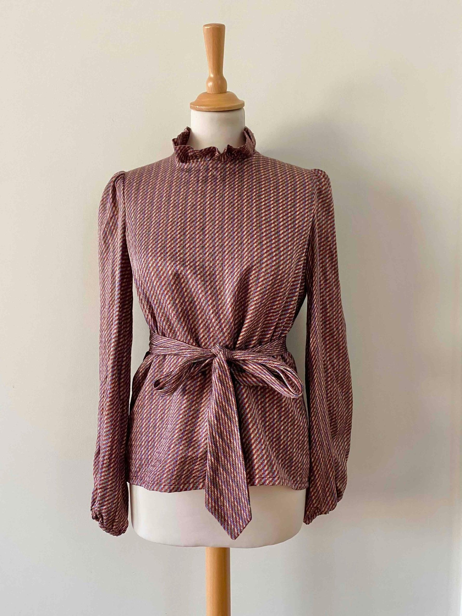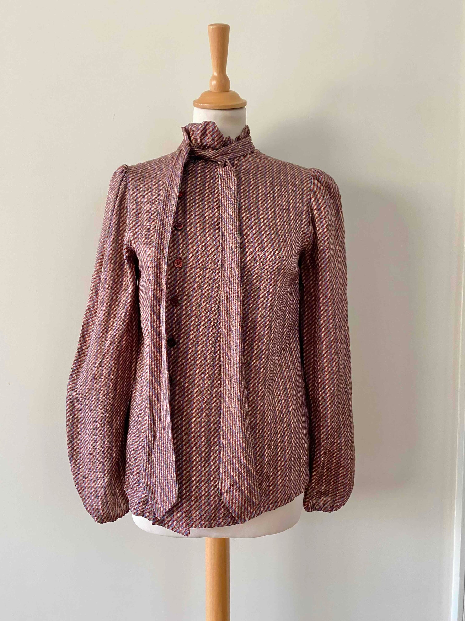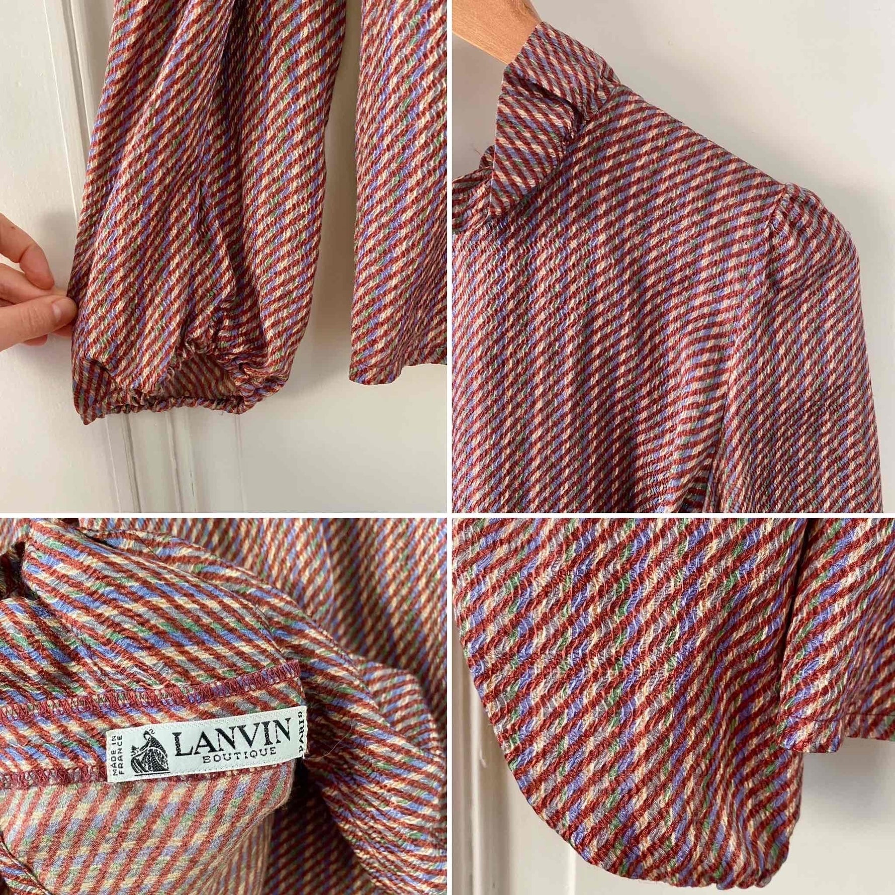 Prix unitaire parBlouse Lanvin en soie plumetis chevrons multicolores rose, vert pistache, bleu ciel, manches ballons élastique aux poignets, boutons asymétriques à porter devant ou dos, porté multi-positions, foulard coordonné à nouer au col ou taille en ceinture, col volanté, fabriqué en France, taille 36 porté ici sur un mannequin T36.