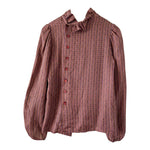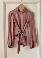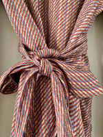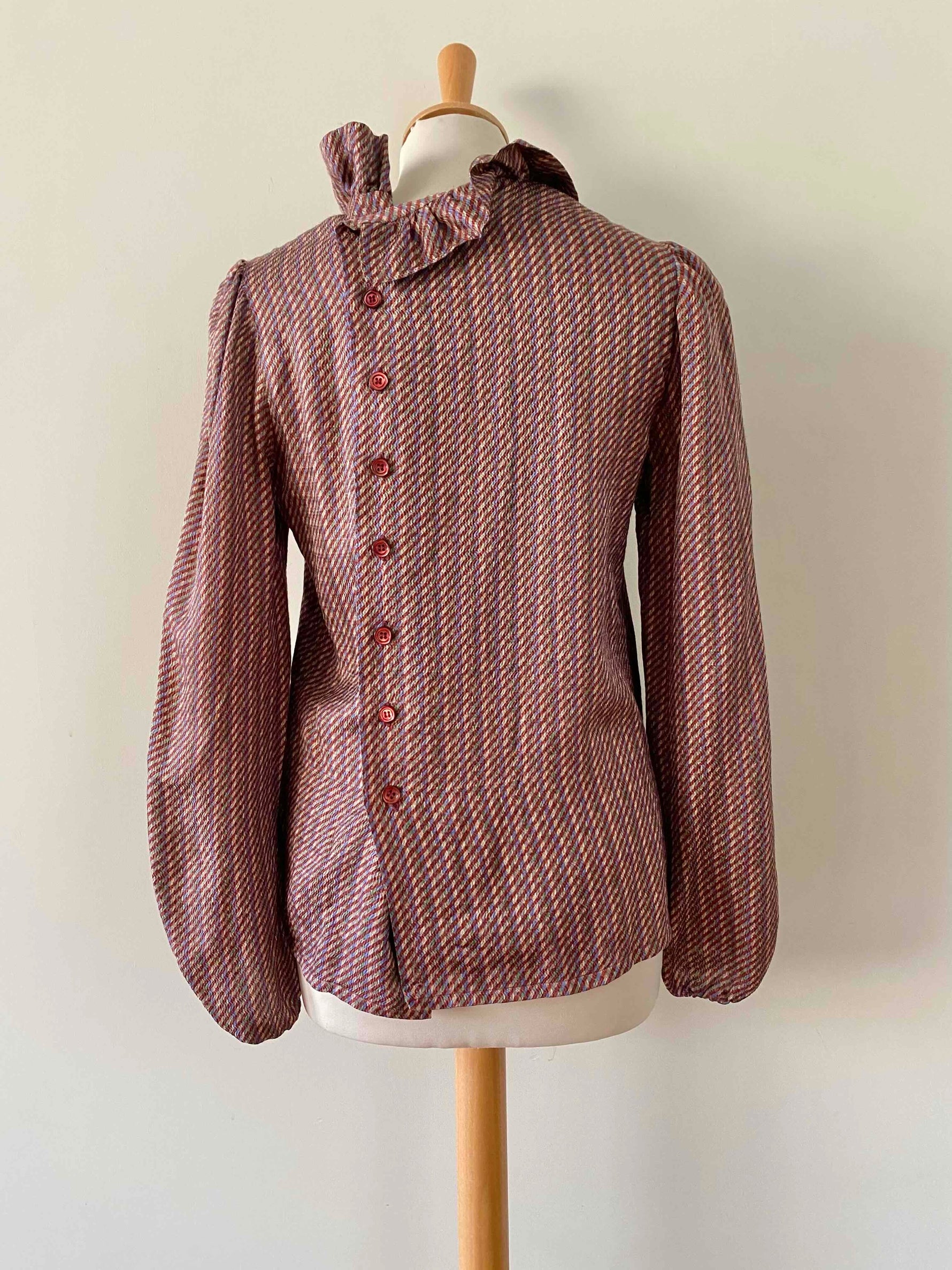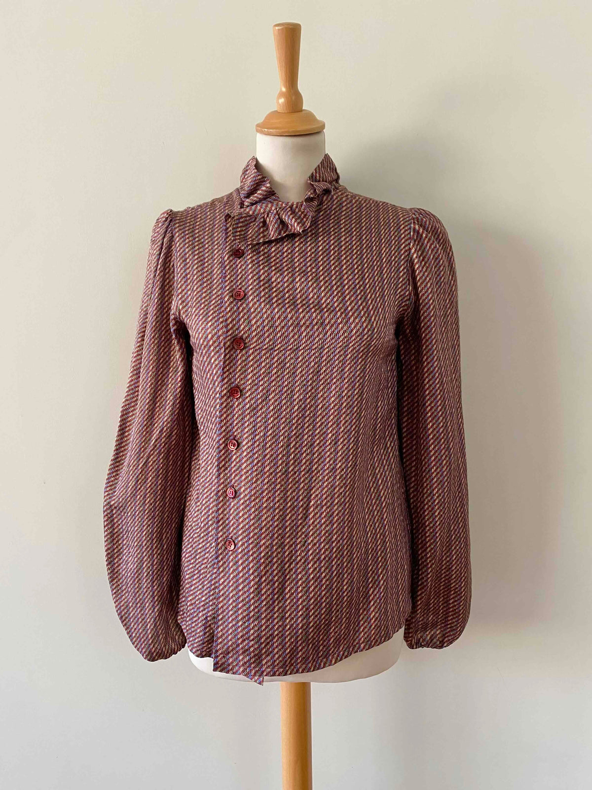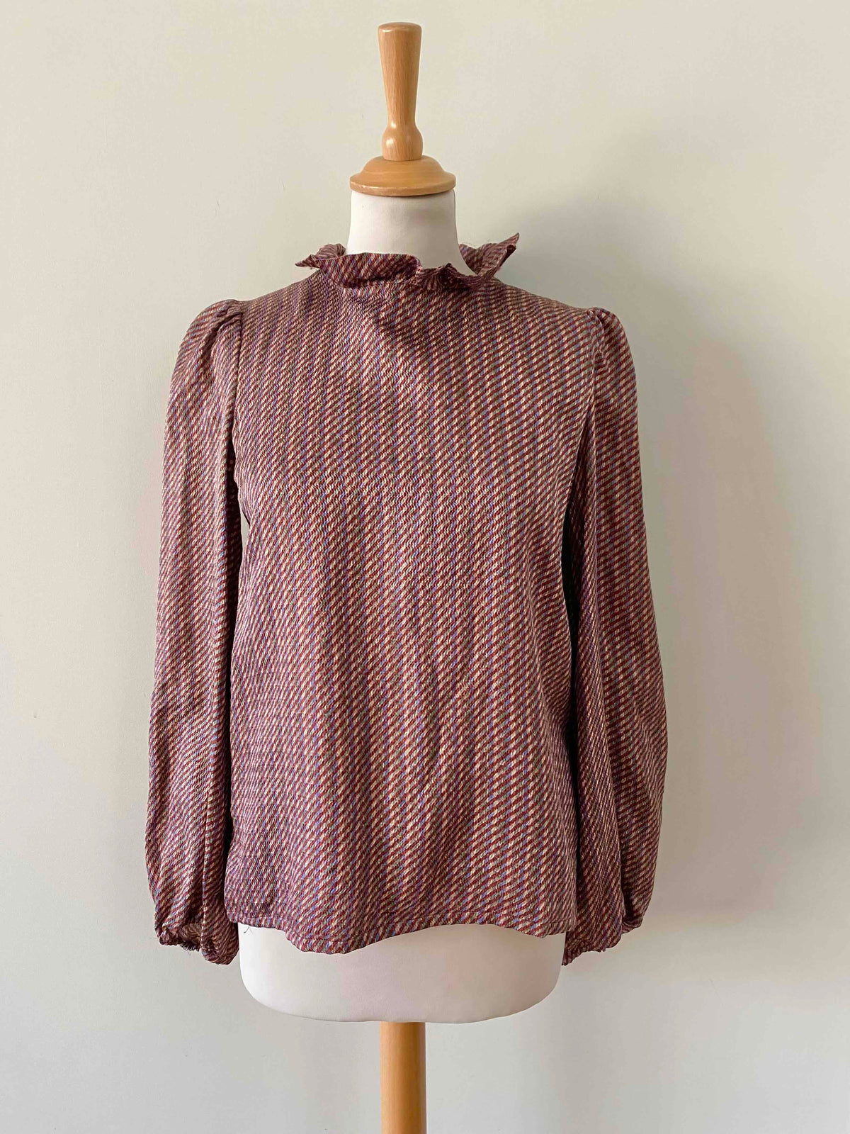 Prix unitaire parBlouse Lanvin en soie plumetis chevrons multicolores rose, vert pistache, bleu ciel, manches ballons élastique aux poignets, boutons asymétriques à porter devant ou dos, porté multi-positions, foulard coordonné à nouer au col ou taille en ceinture, col volanté, fabriqué en France, taille 36 porté ici sur un mannequin T36.