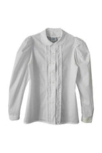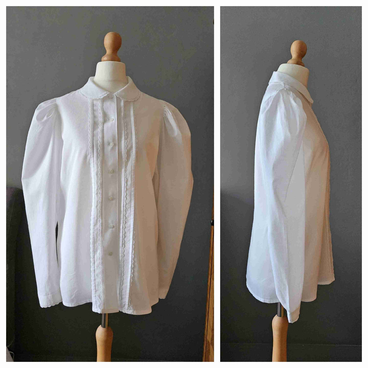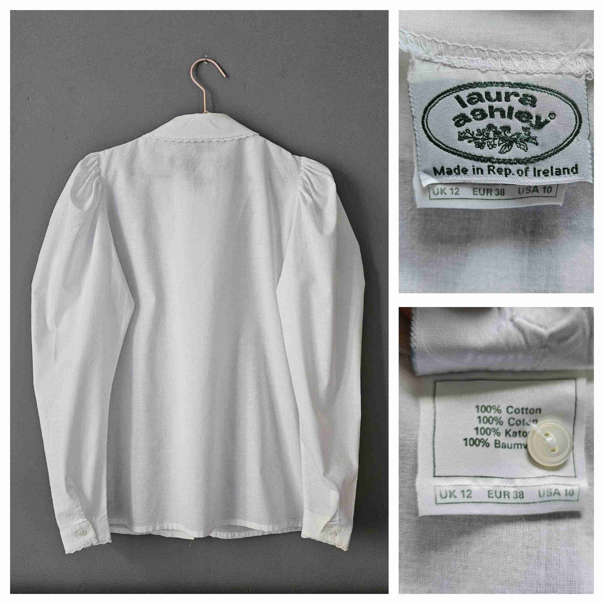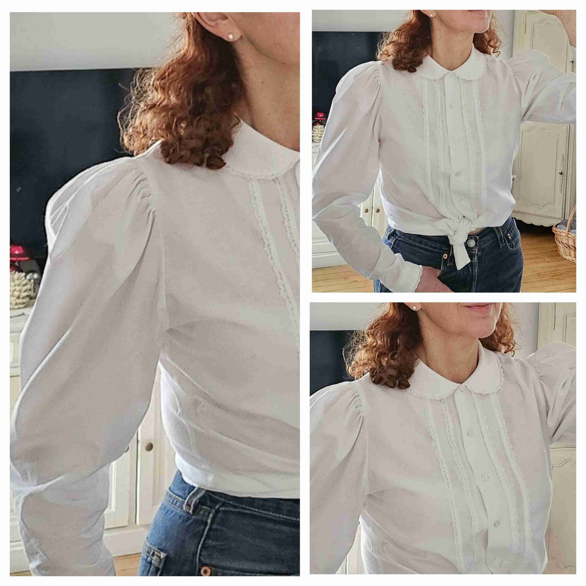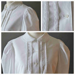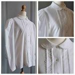 Prix unitaire parChemise en coton blanc à manches bouffantes, col Claudine, plis et détails de dentelle, poignets et boutonnière en nacre naturelle. Porté sur les photos par une personne T36. Marque Laura Ashley. Fabriqué en République d'Irlande.