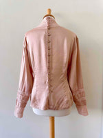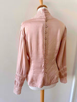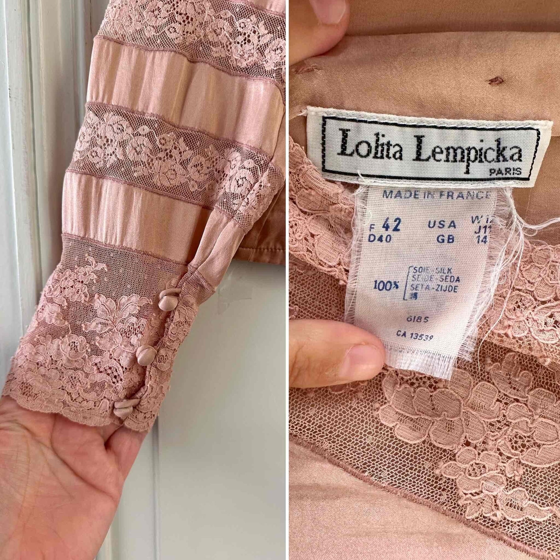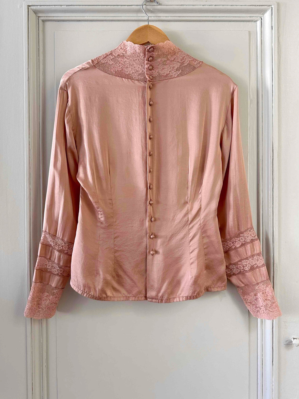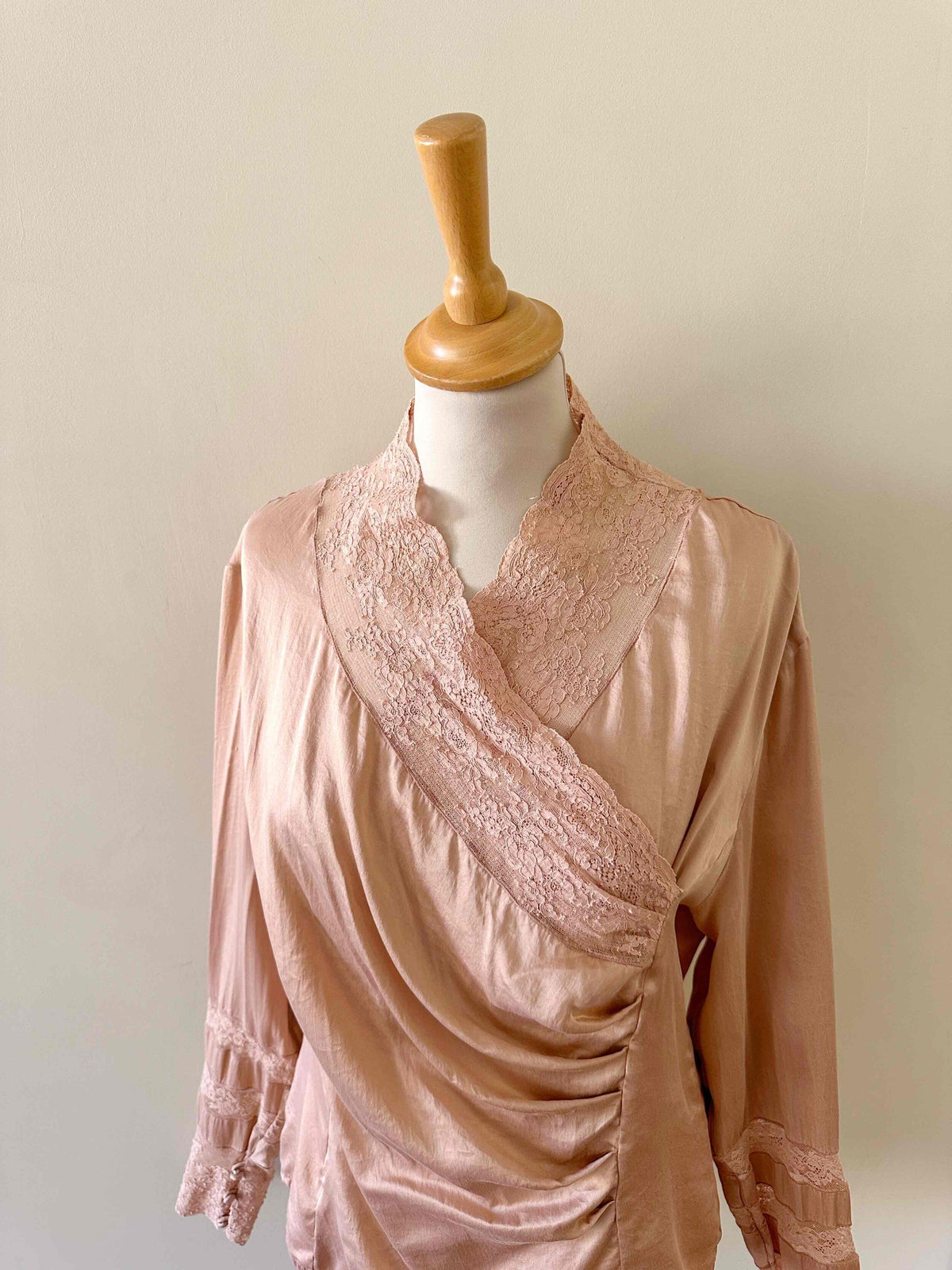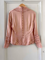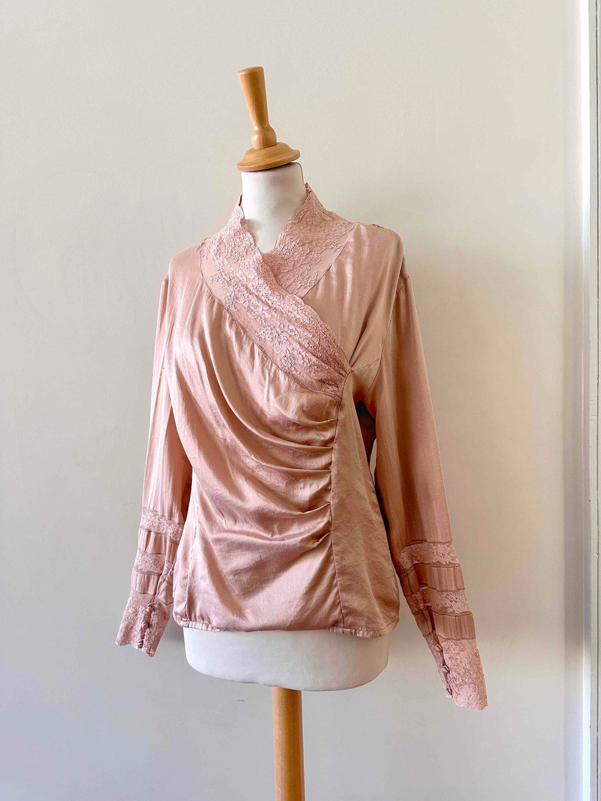 Prix unitaire parBlouse en soie Lolita Lempicka, satin de soie vieux rose, brodée et ajourée de dentelle chantilly, forme cache coeur croisé et drapée devant, boutons recouverts au dos, fabriquée en France, taille 36 portée ici sur un mannequin T36.