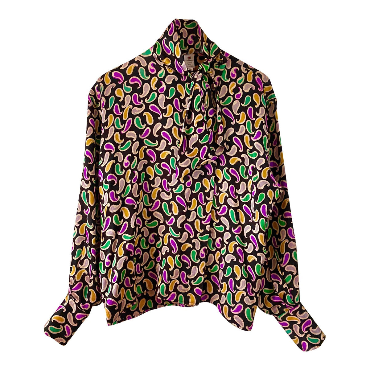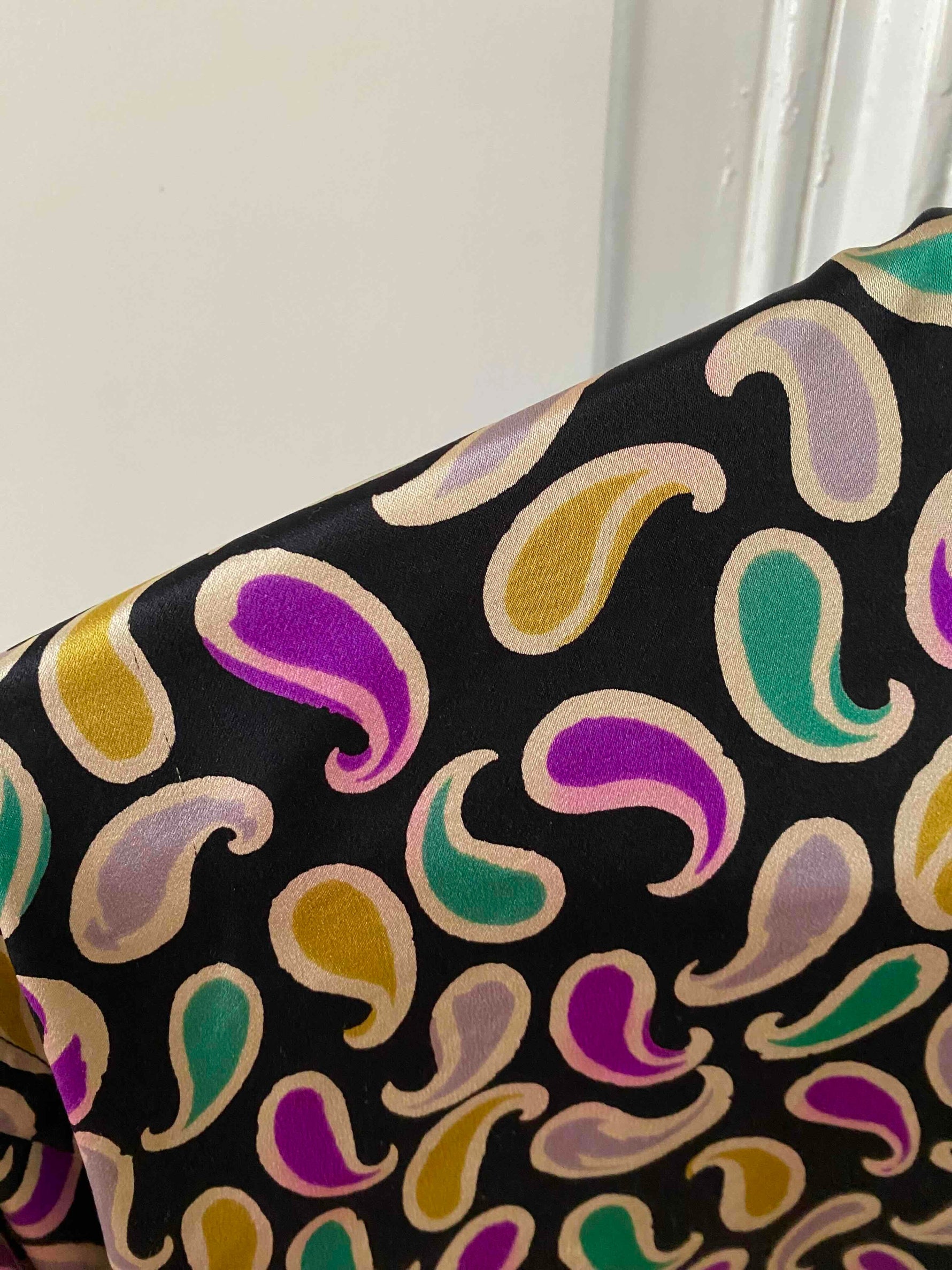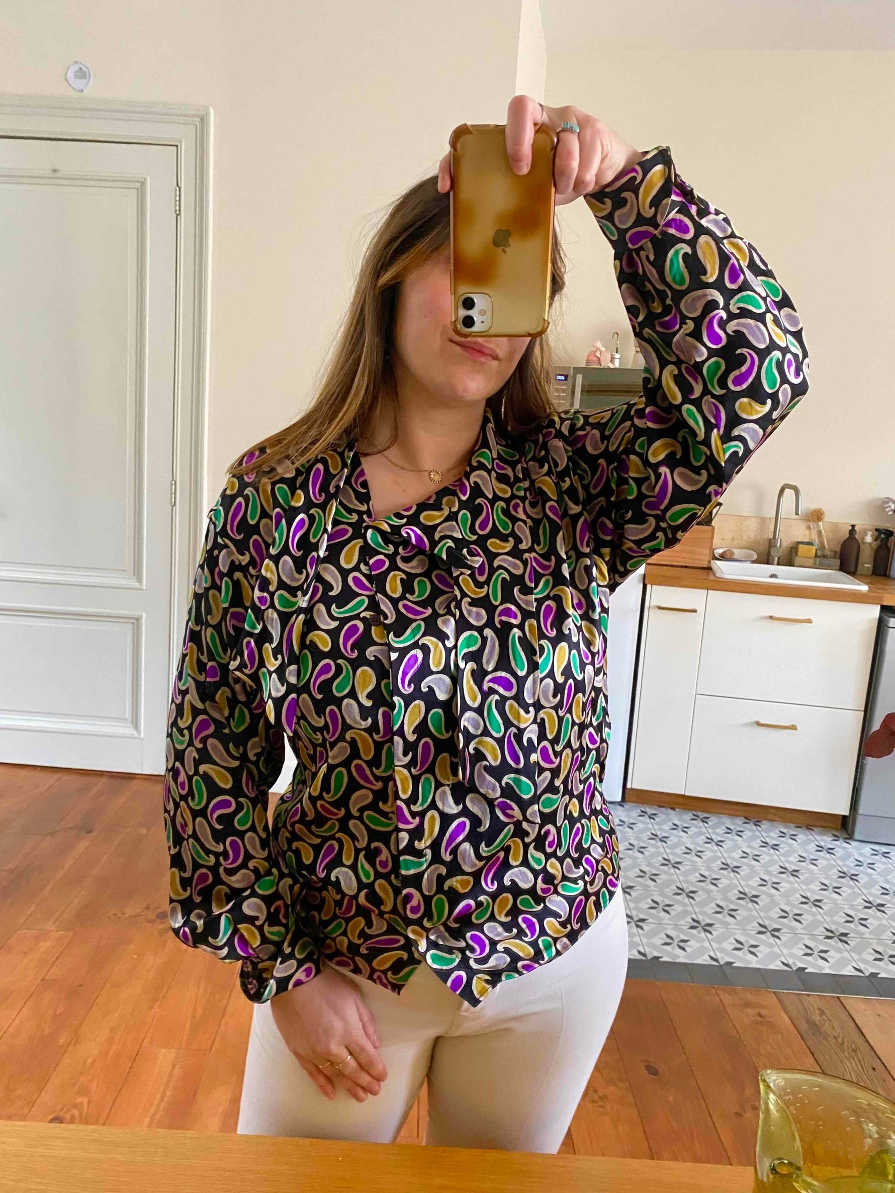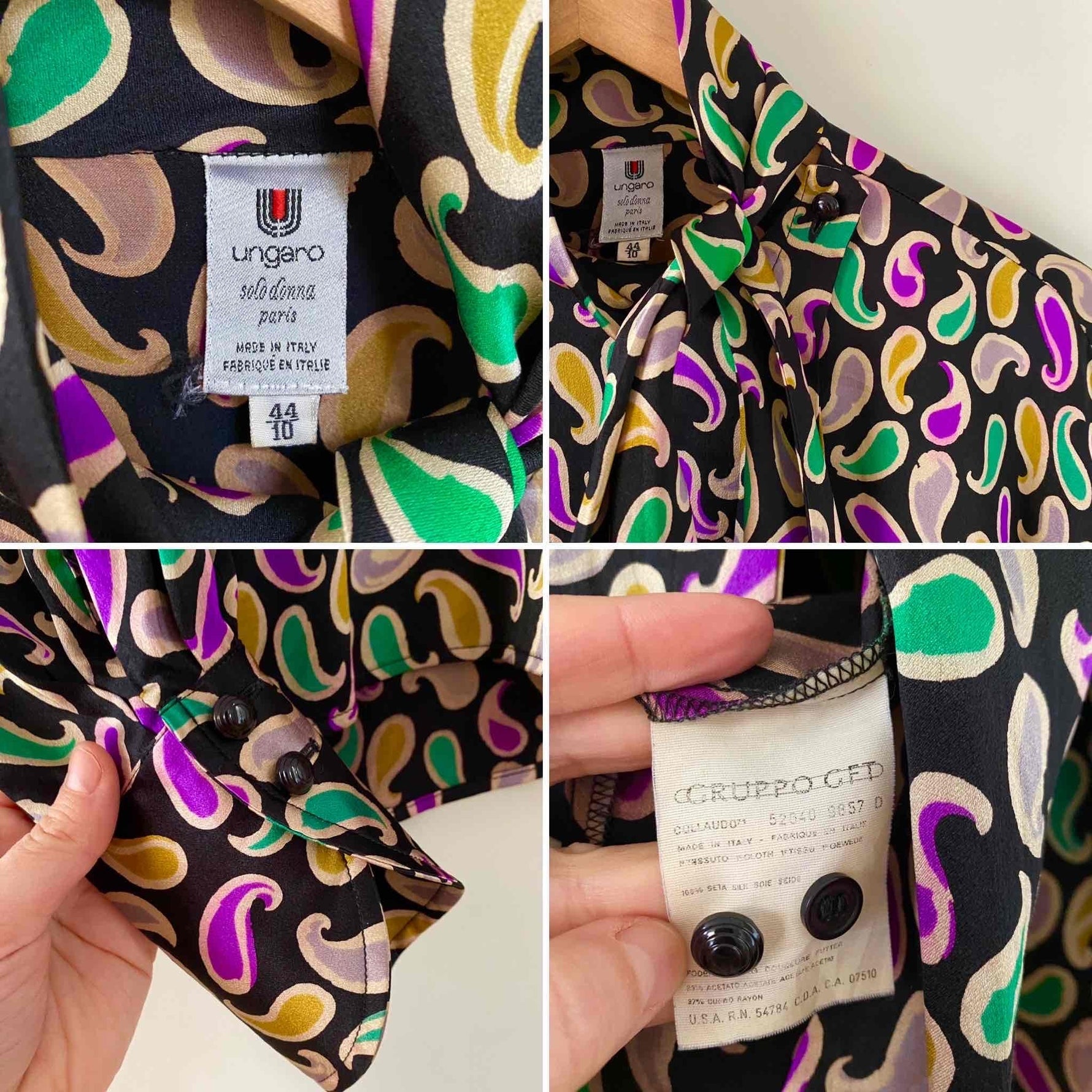 Prix unitaire parBlouse Ungaro en soie satin, motifs paisley multicolores violet, lilas, verts, jaunes fond noir et blanc, boutonnage asymétrique sur le côté, col foulard à nouer lavaliere, manches ballons à poignets longs à revers, fabriquée en Italie, taille 38 et 40 portée ici sur une personne T40.
