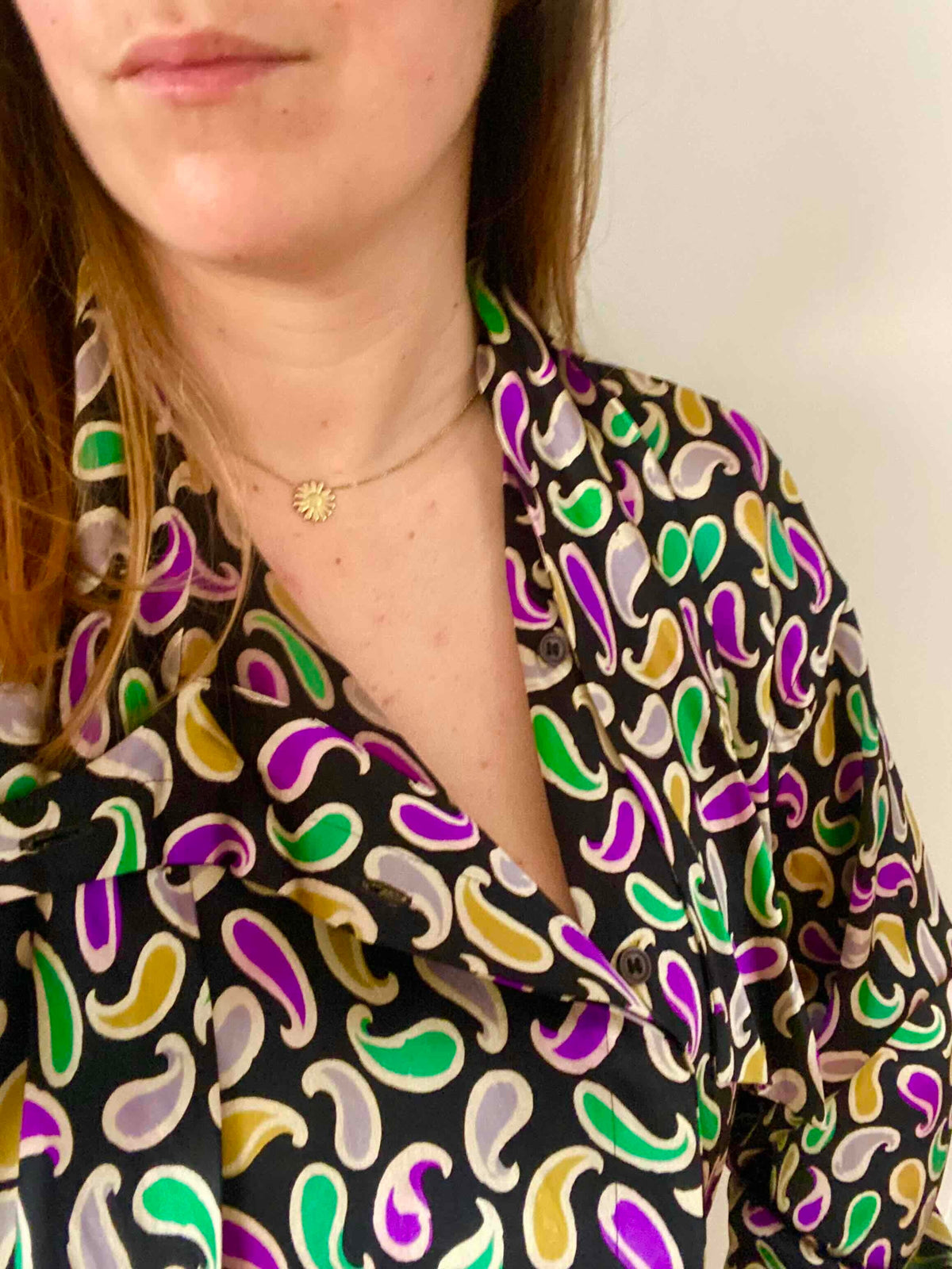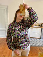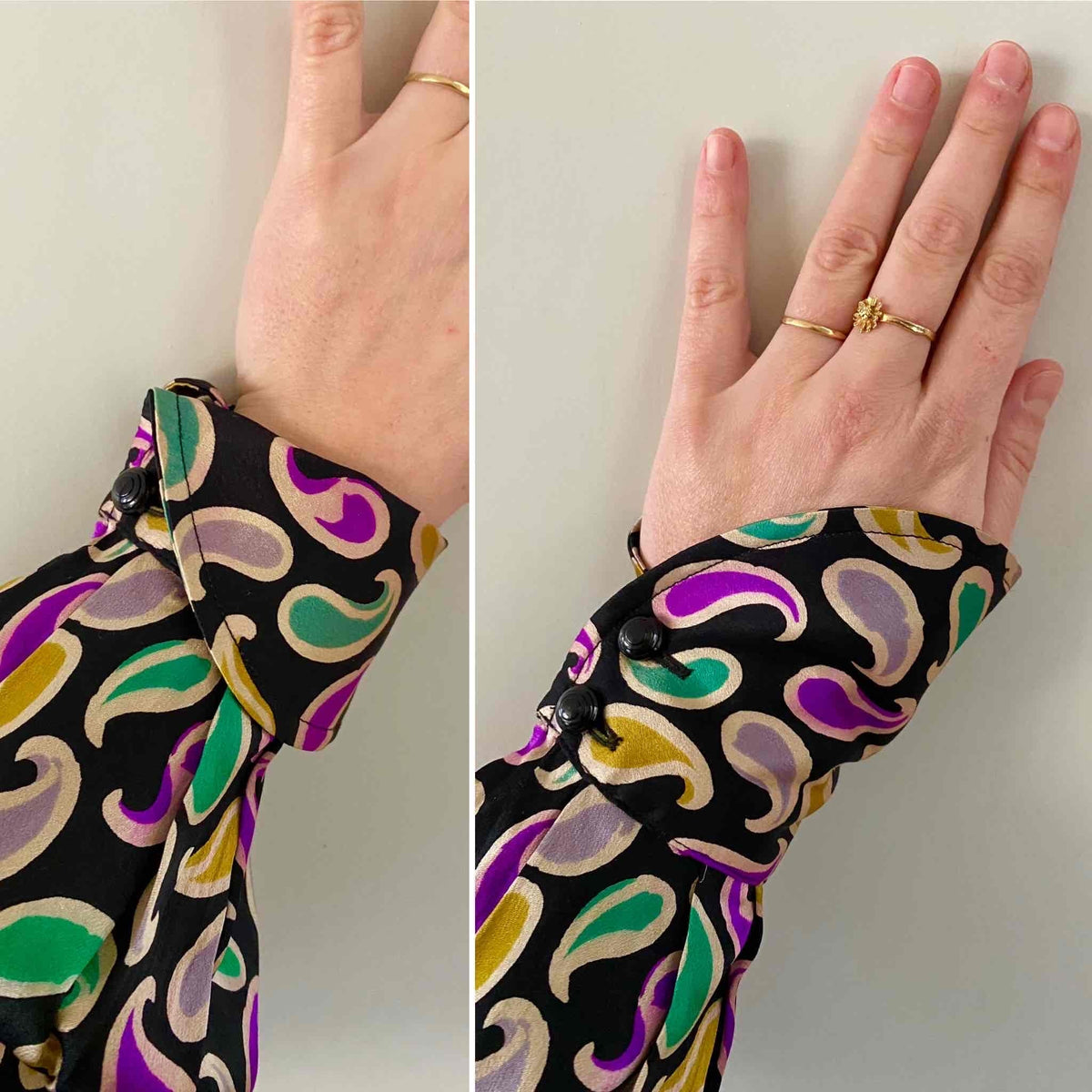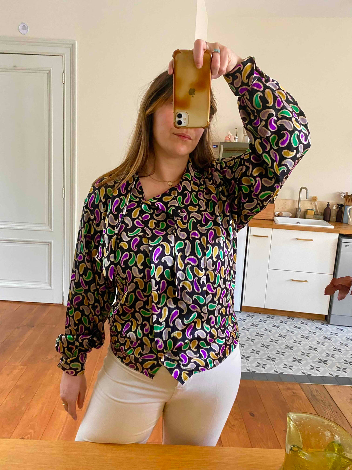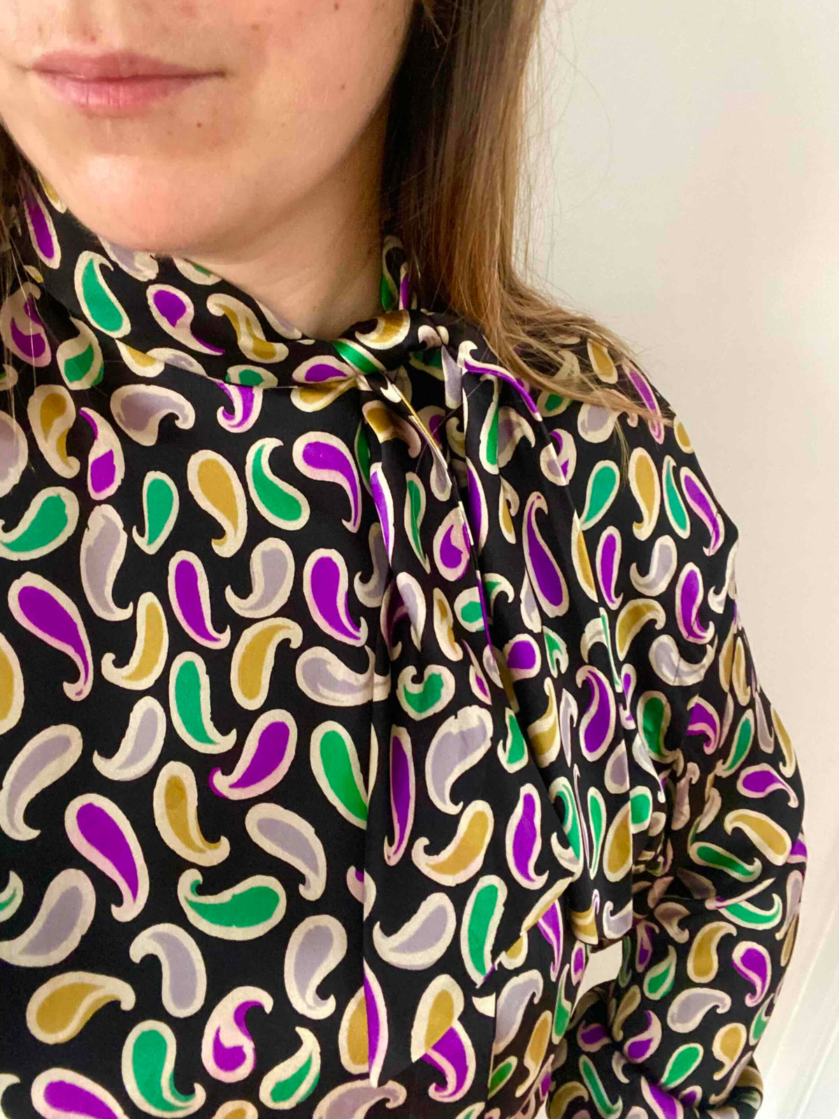 Prix unitaire parBlouse Ungaro en soie satin, motifs paisley multicolores violet, lilas, verts, jaunes fond noir et blanc, boutonnage asymétrique sur le côté, col foulard à nouer lavaliere, manches ballons à poignets longs à revers, fabriquée en Italie, taille 38 et 40 portée ici sur une personne T40.