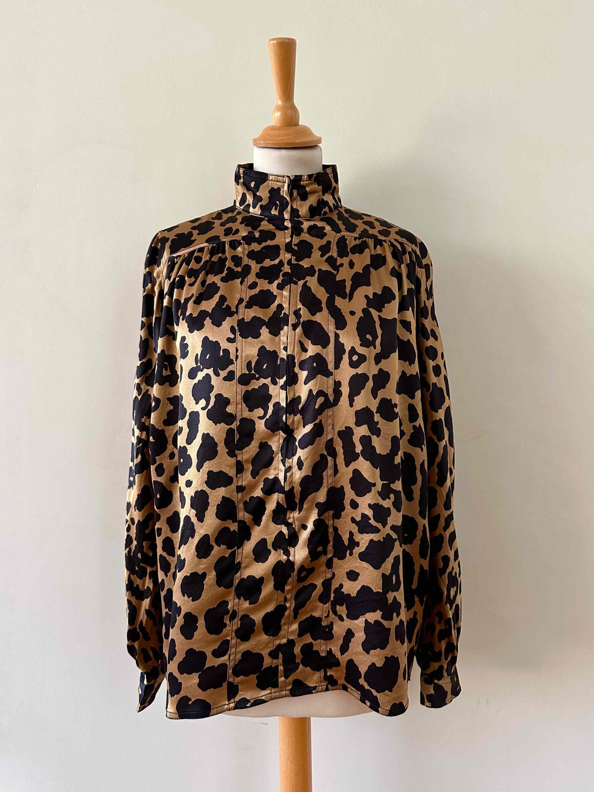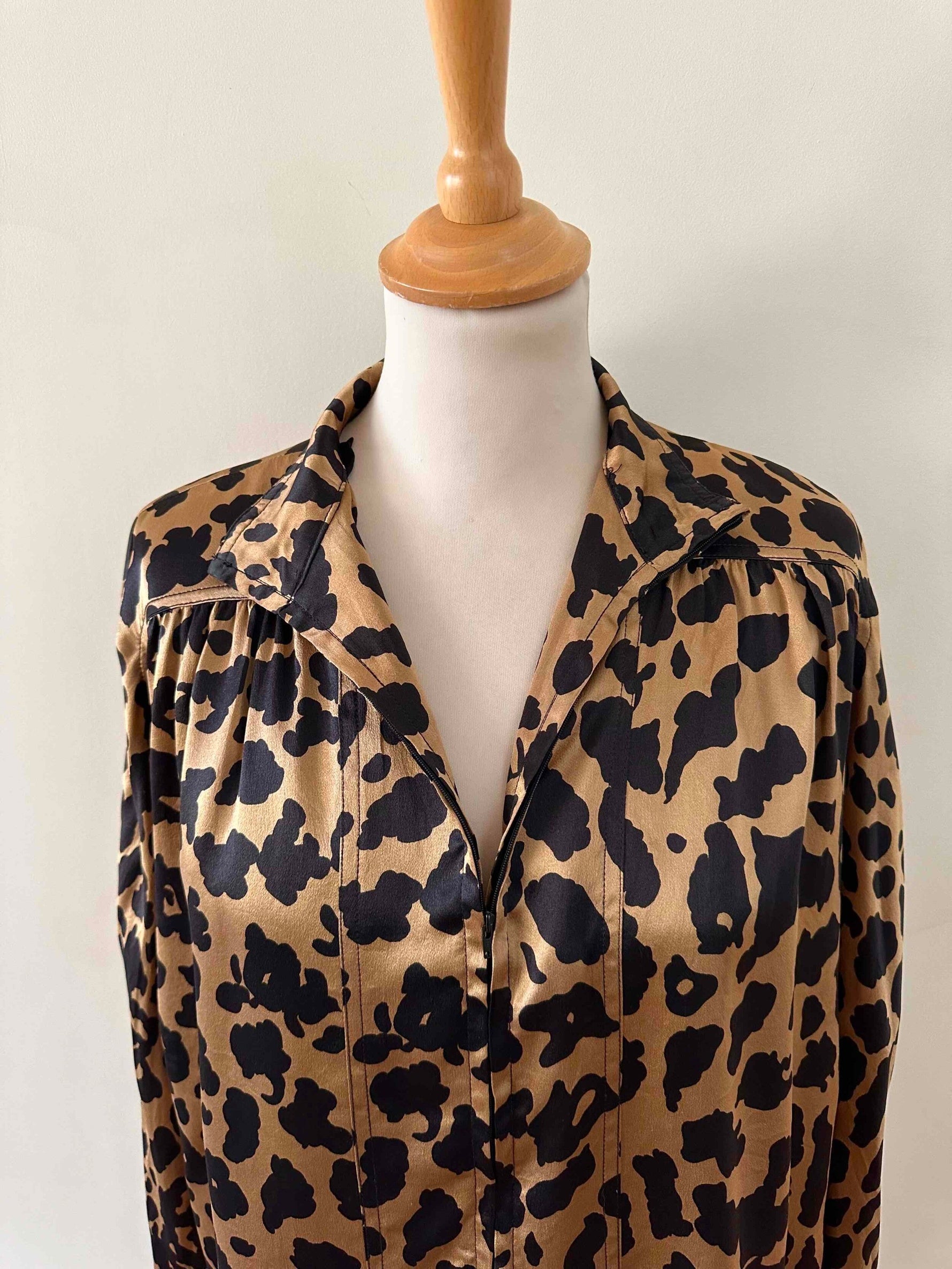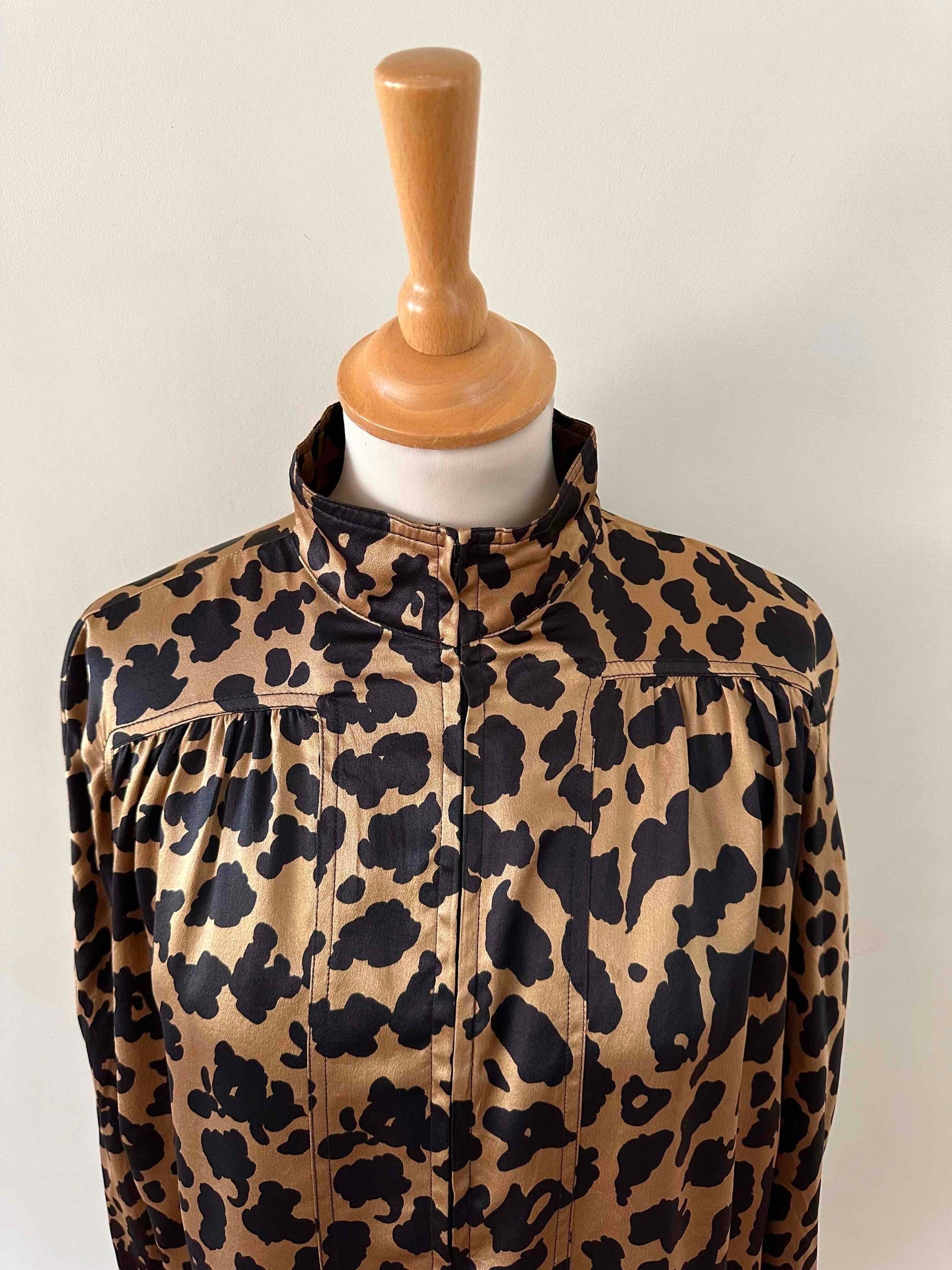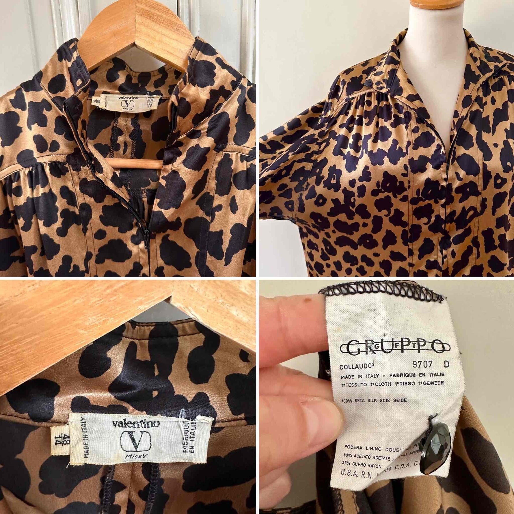Prix unitaire parBlouse en soie Valentino, satin de soie caramel imprimé motifs léopard noirs, col zippé à ouvrir ou col montant, manches chauves-souris, fabriquée en Italie, années 80s, convient aux tailles 36 et 38 porté ici sur un mannequin T36. Très Légère décoloration sous une aisselle invisible au porté.