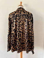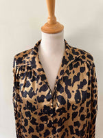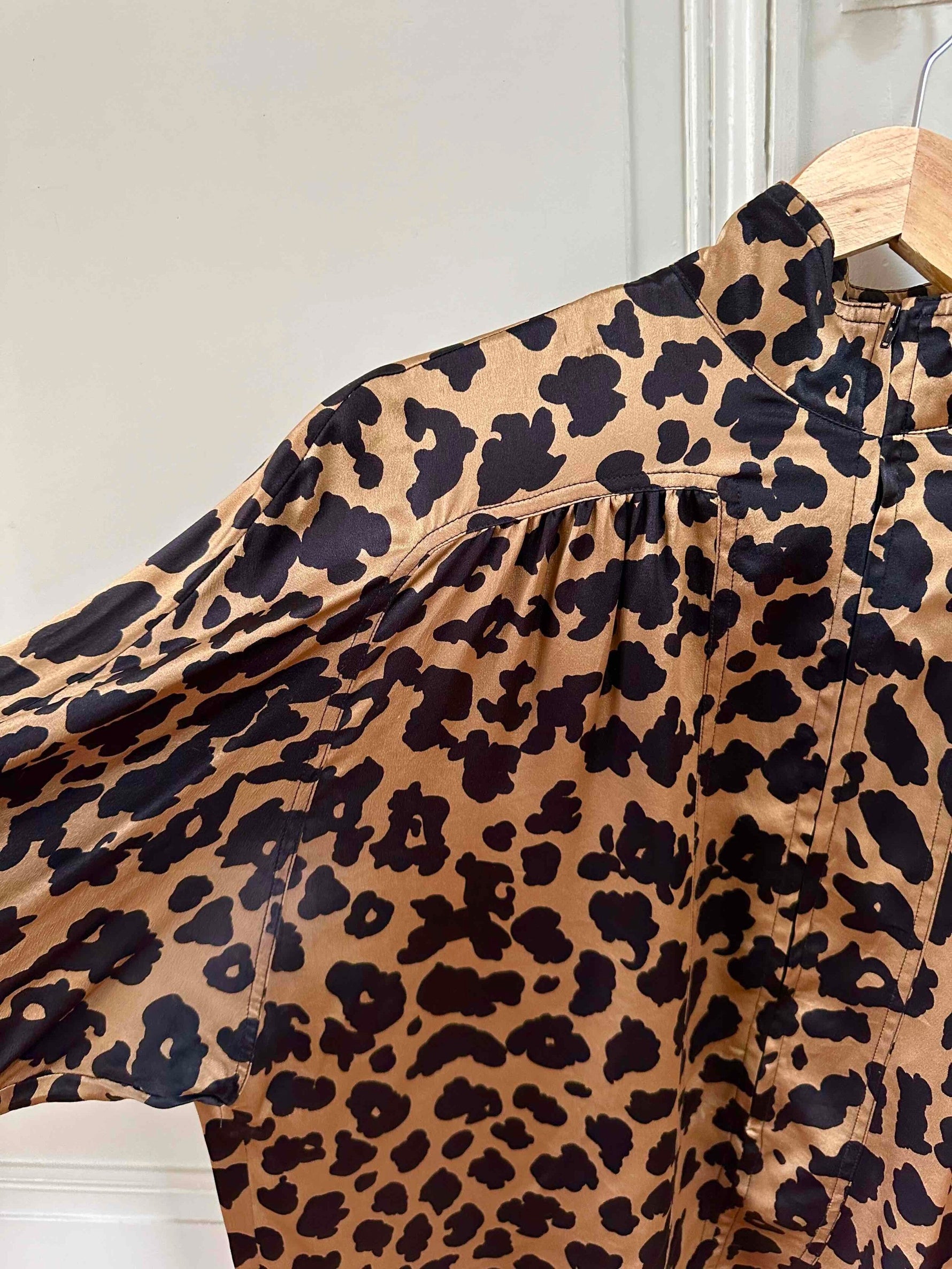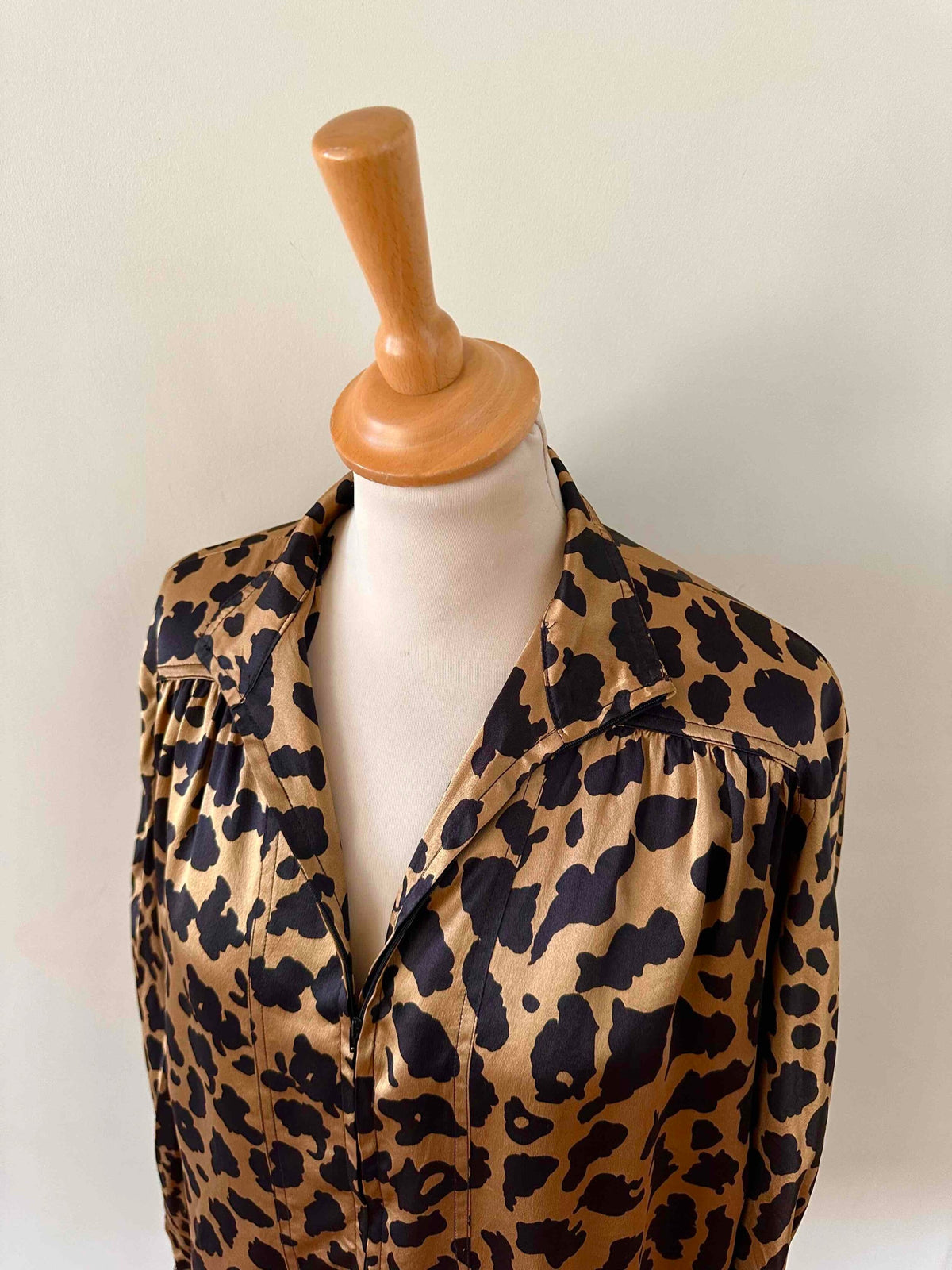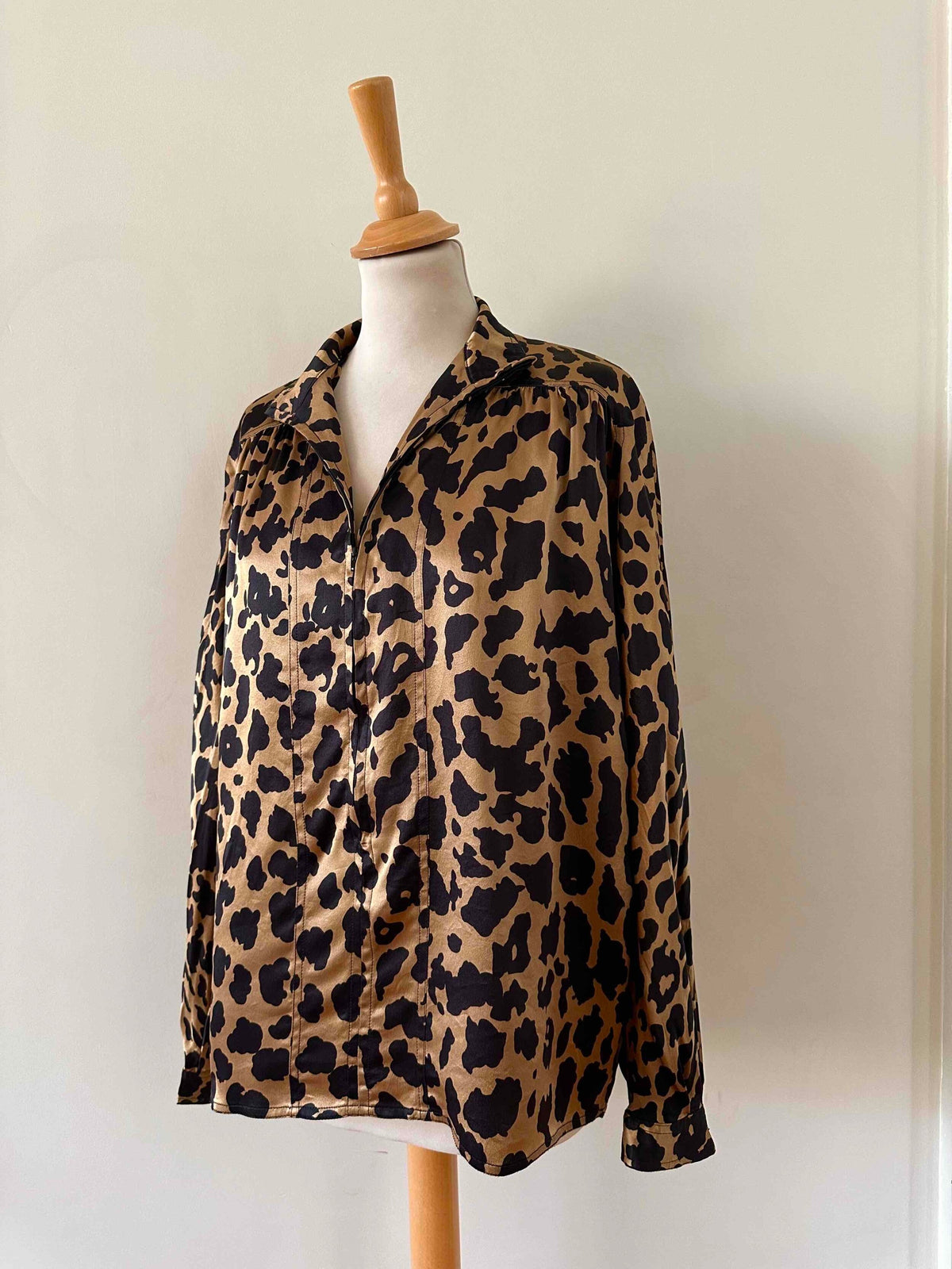 Prix unitaire parBlouse en soie Valentino, satin de soie caramel imprimé motifs léopard noirs, col zippé à ouvrir ou col montant, manches chauves-souris, fabriquée en Italie, années 80s, convient aux tailles 36 et 38 porté ici sur un mannequin T36. Très Légère décoloration sous une aisselle invisible au porté.
