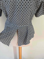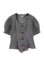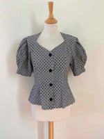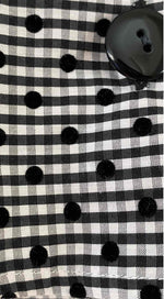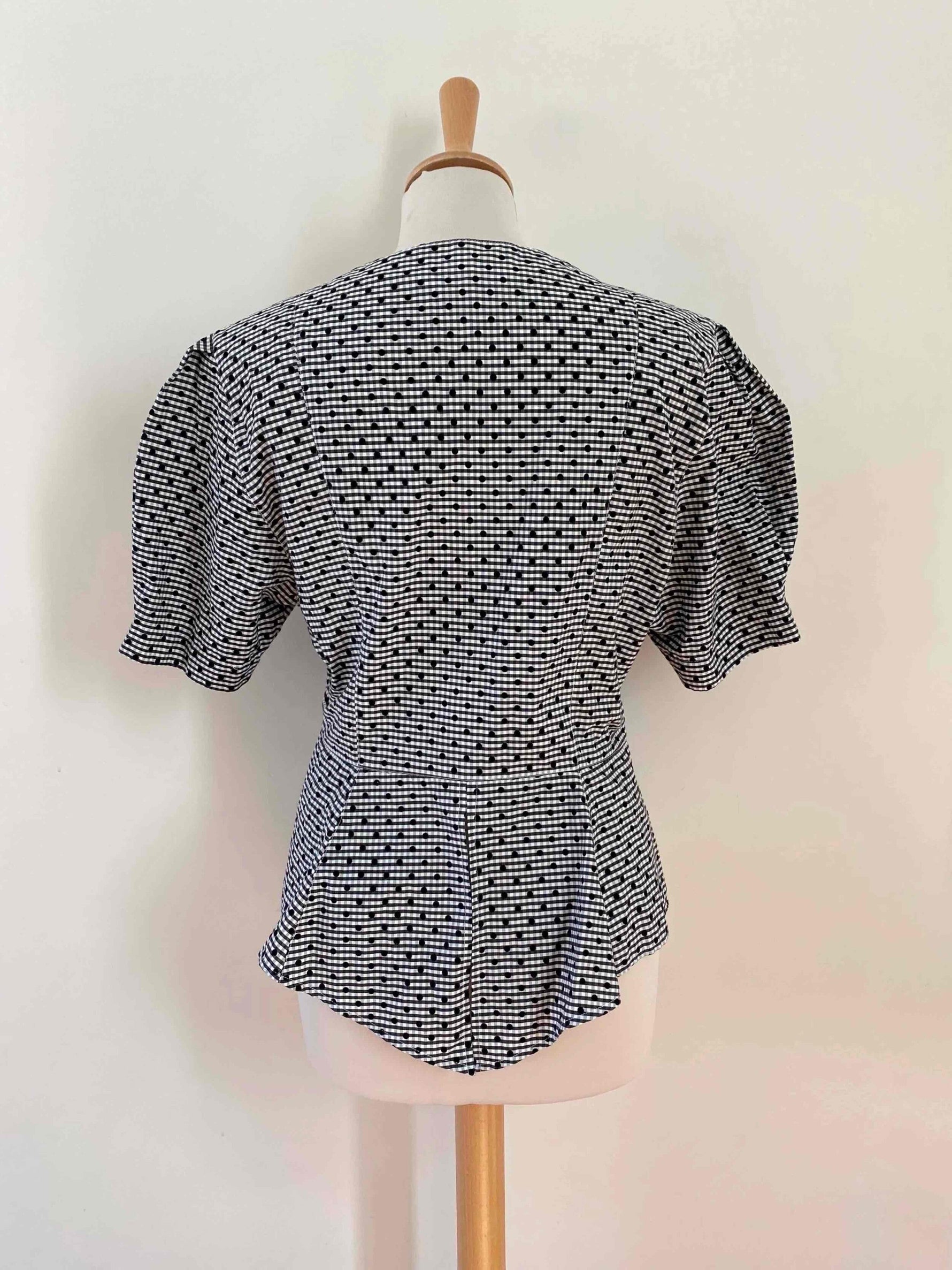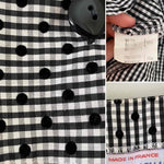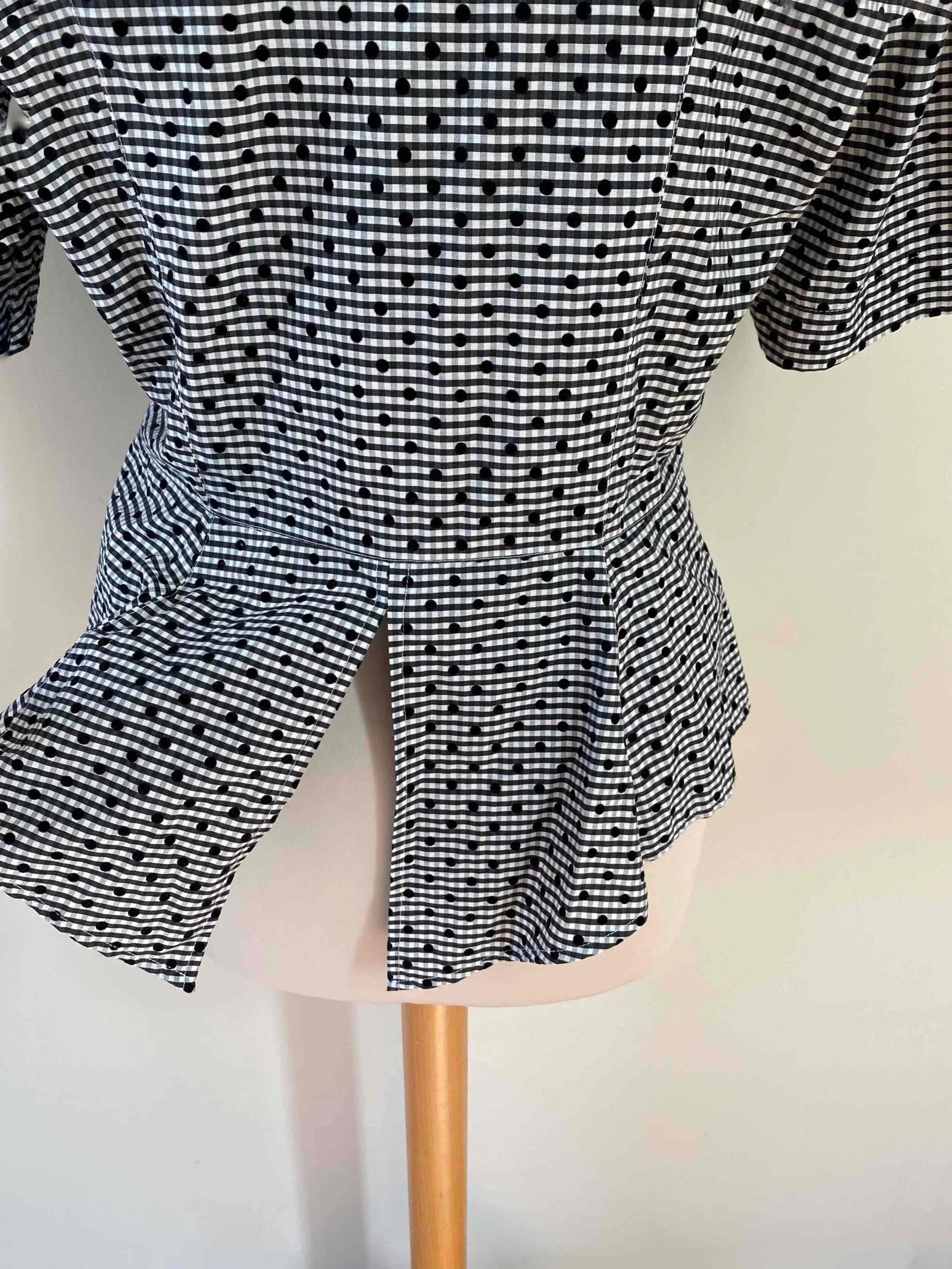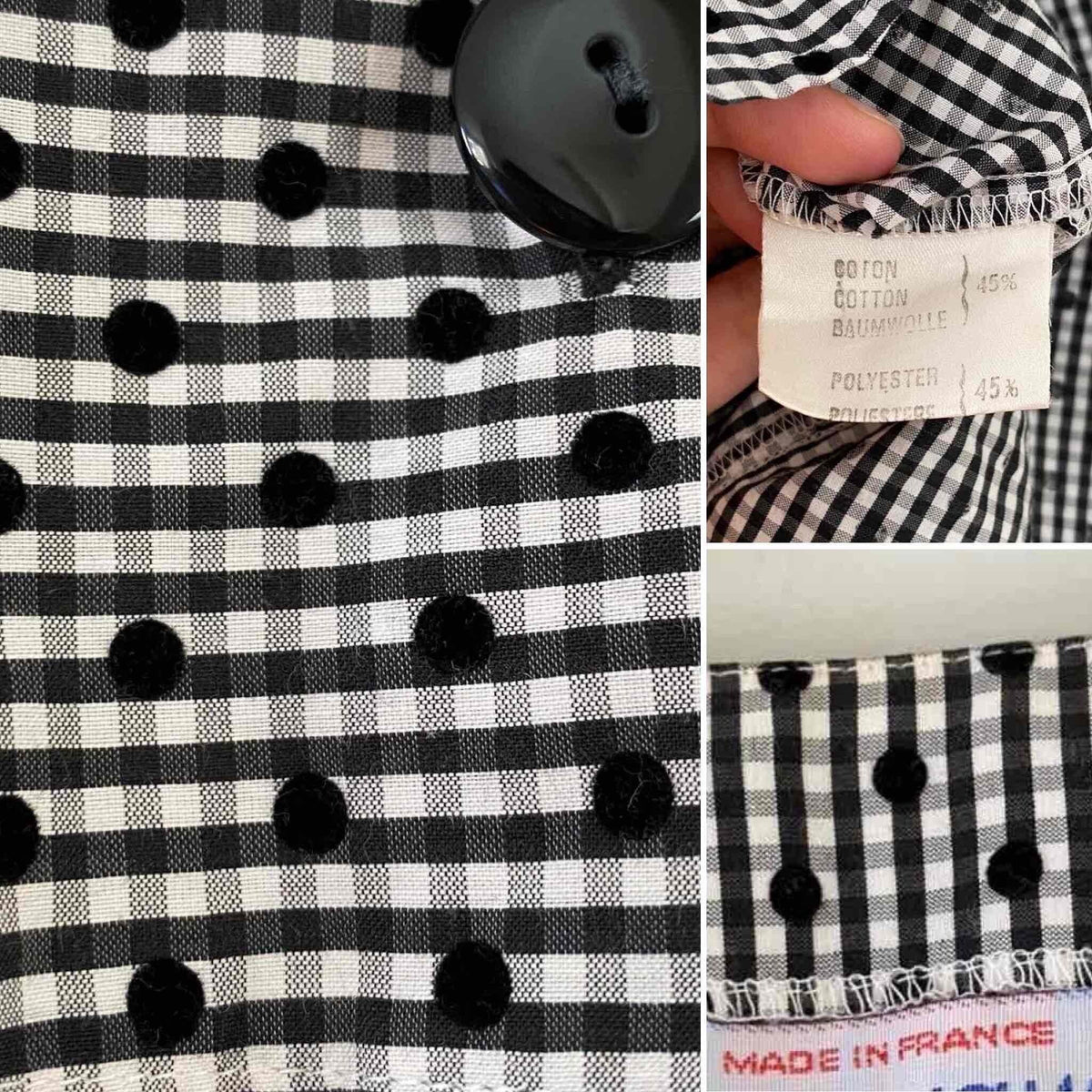 Prix unitaire parBlouse vichy et pois, en coton mélangé à carreaux vichy noirs et blancs, pois floqués velours noirs, manches ballons, taille à basque, fabriquée en France, années 80's, taille 36, portée ici sur un mannequin 136.