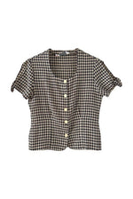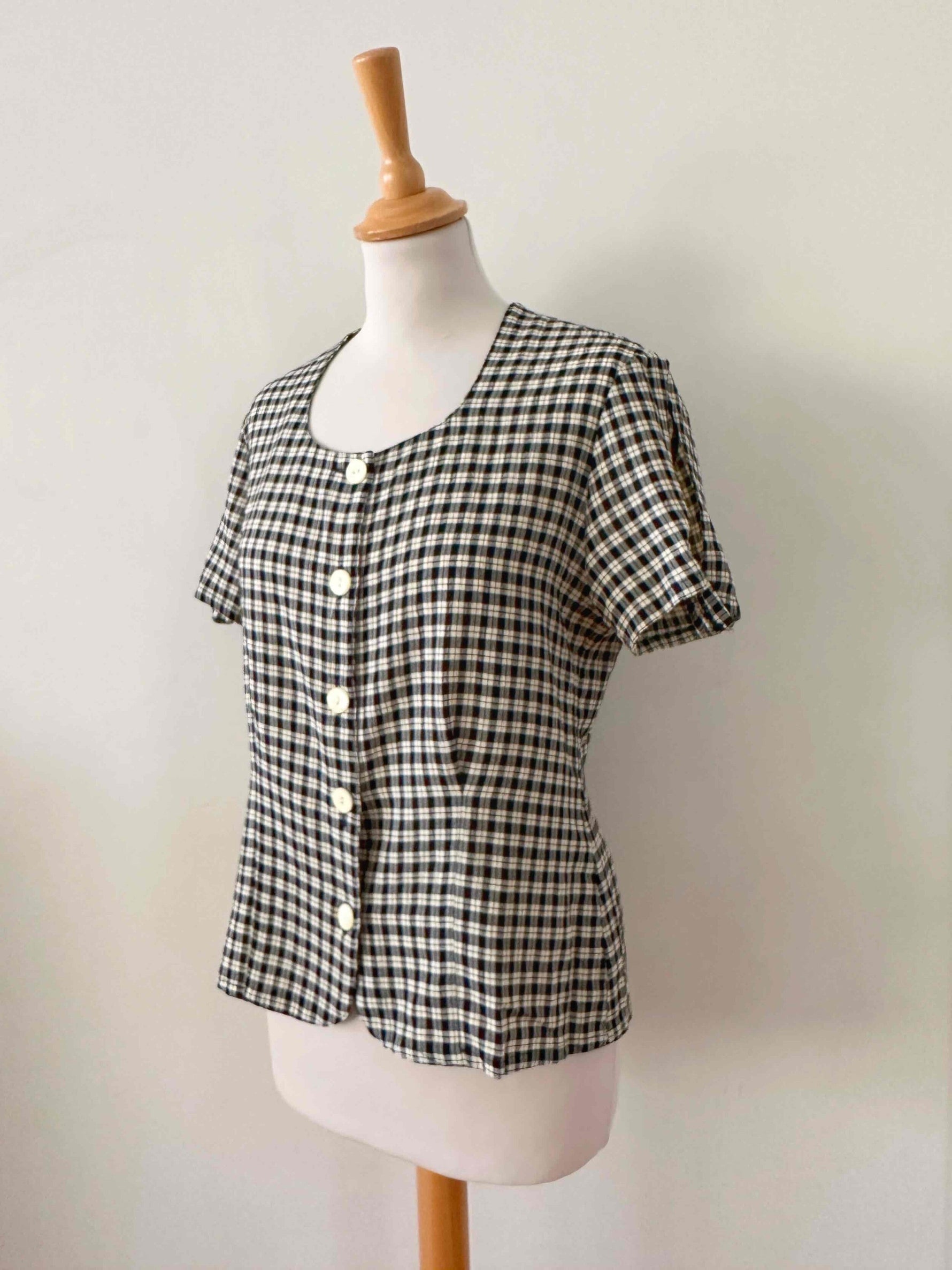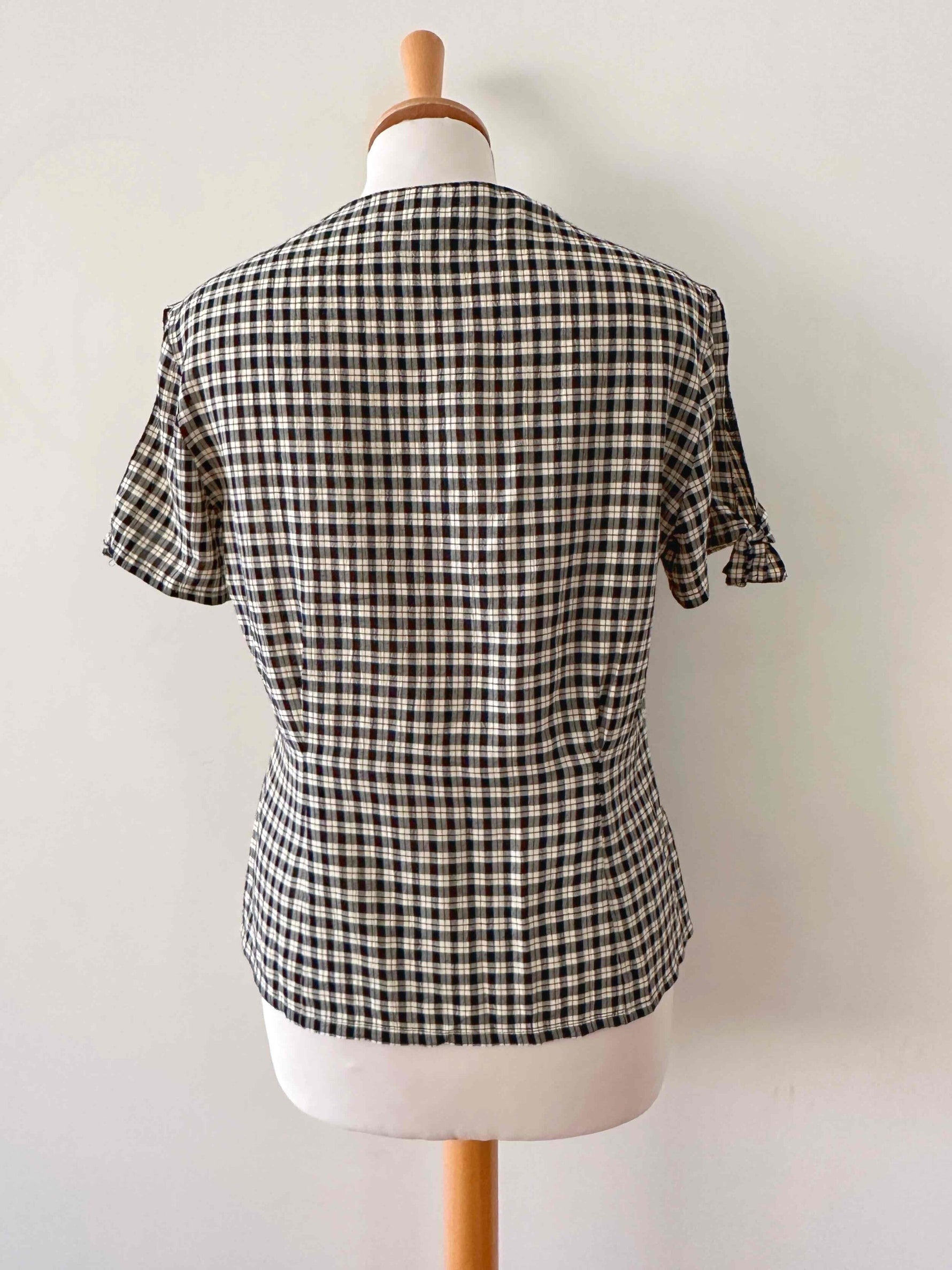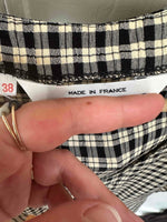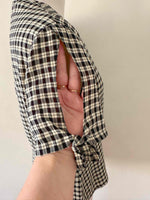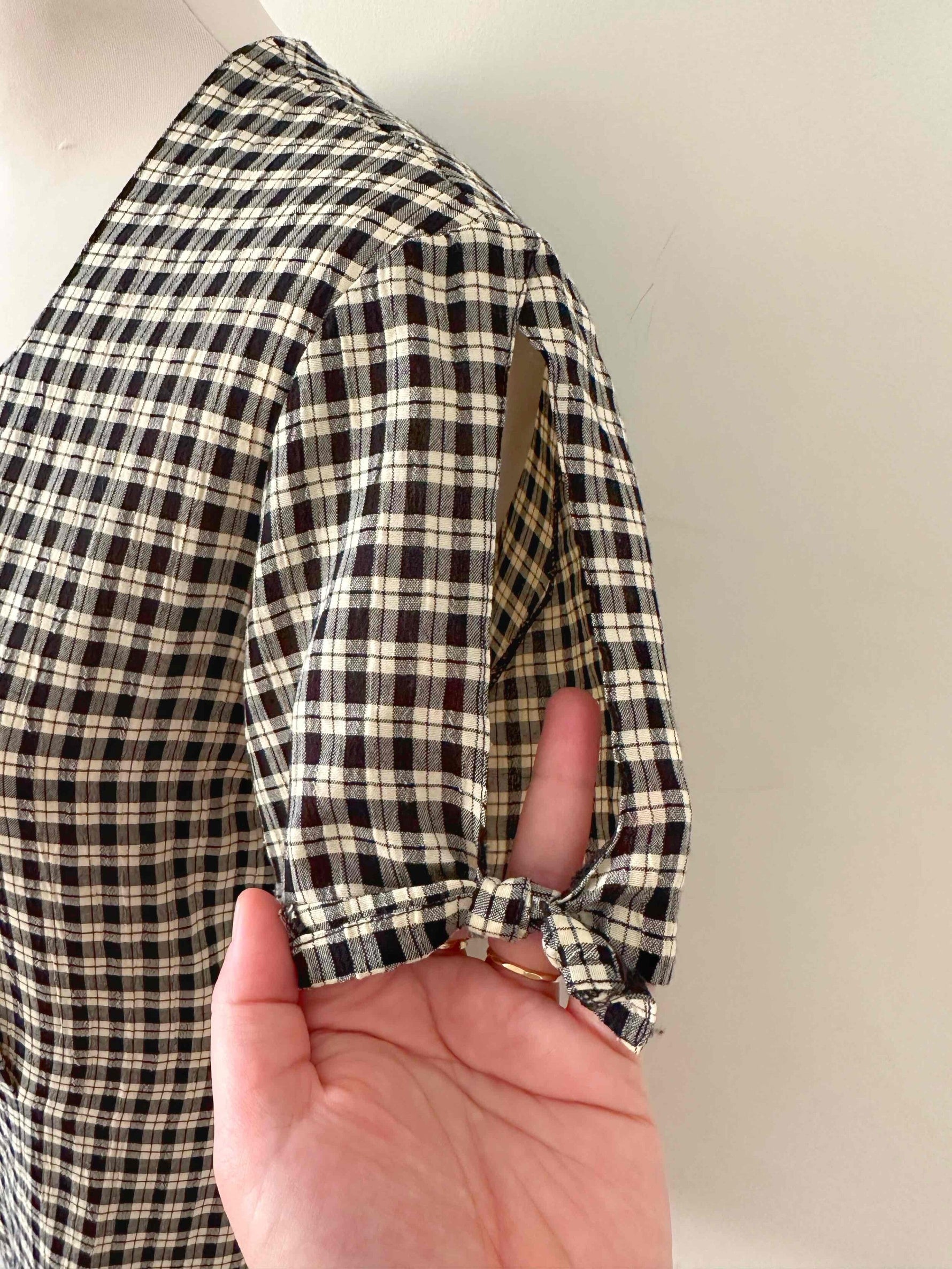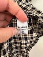 Prix unitaire parBlouse Vichy, en viscose mélangée à carreaux vichy écrus et noirs, manches ballons à nouer et ajourées, fabriquée en France, taille 36 portée ici sur un mannequin T36.