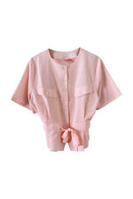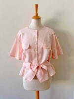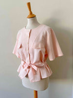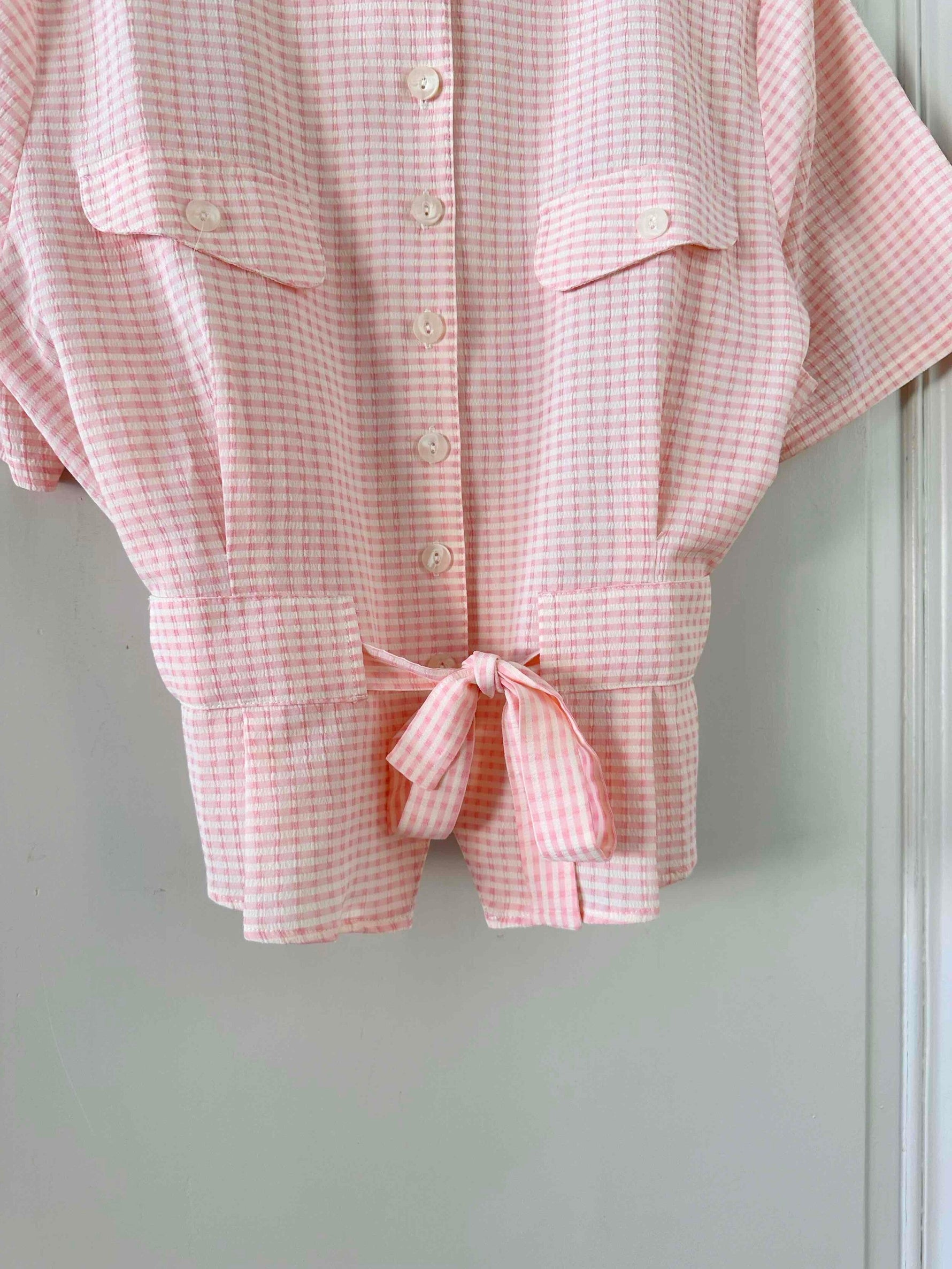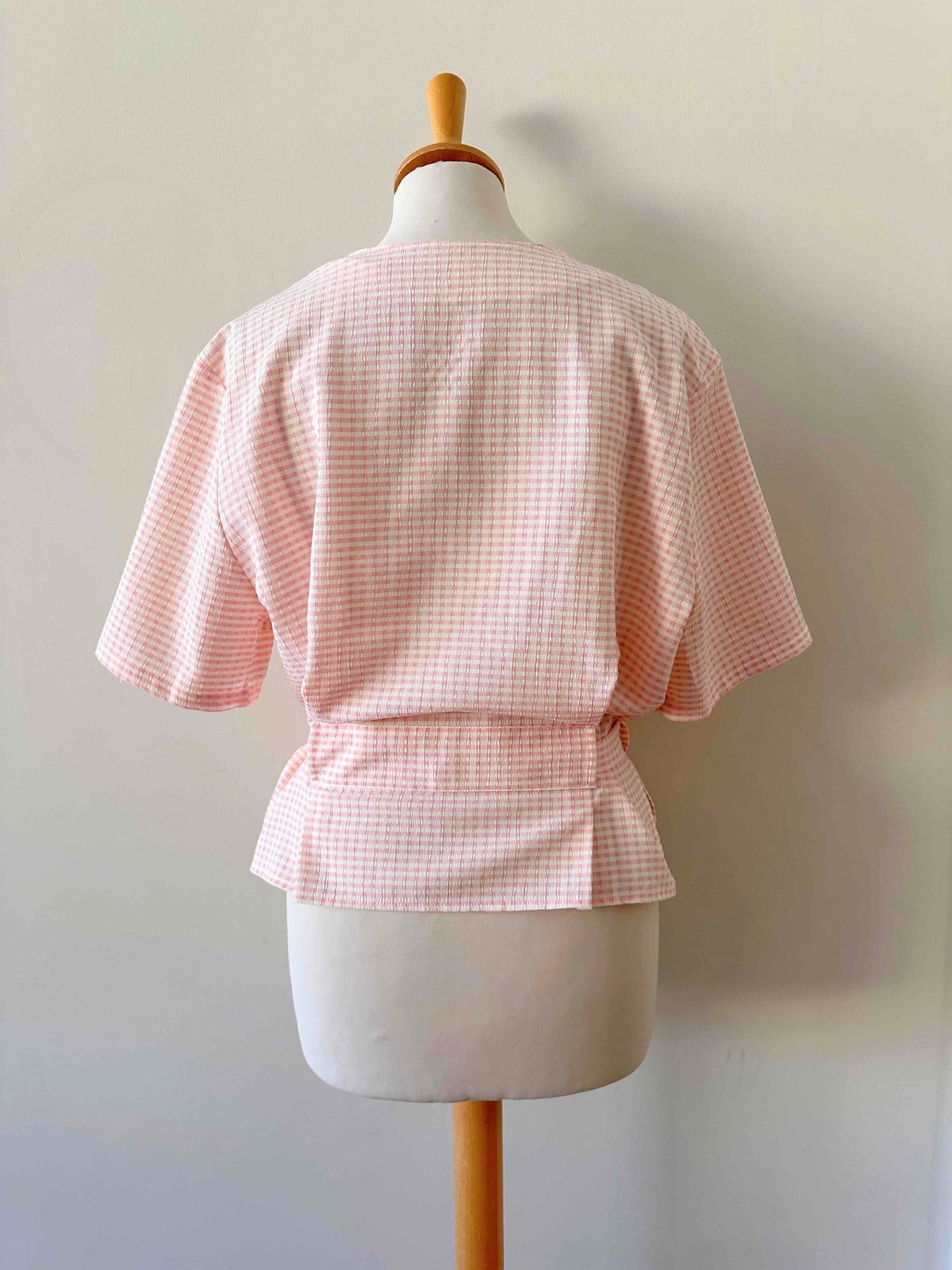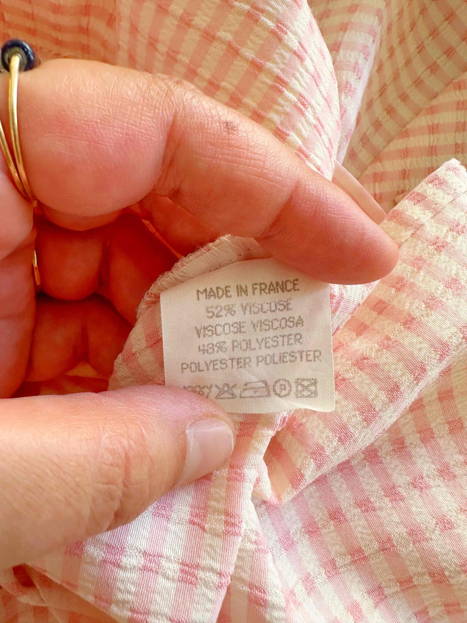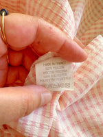 Prix unitaire parBlouse vichy, en viscose mélangée gaufrée rose et blanc, boutonnée, taille à nouer, fabriquée en France, taille 38, portée ici sur un mannequin T36.