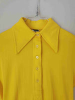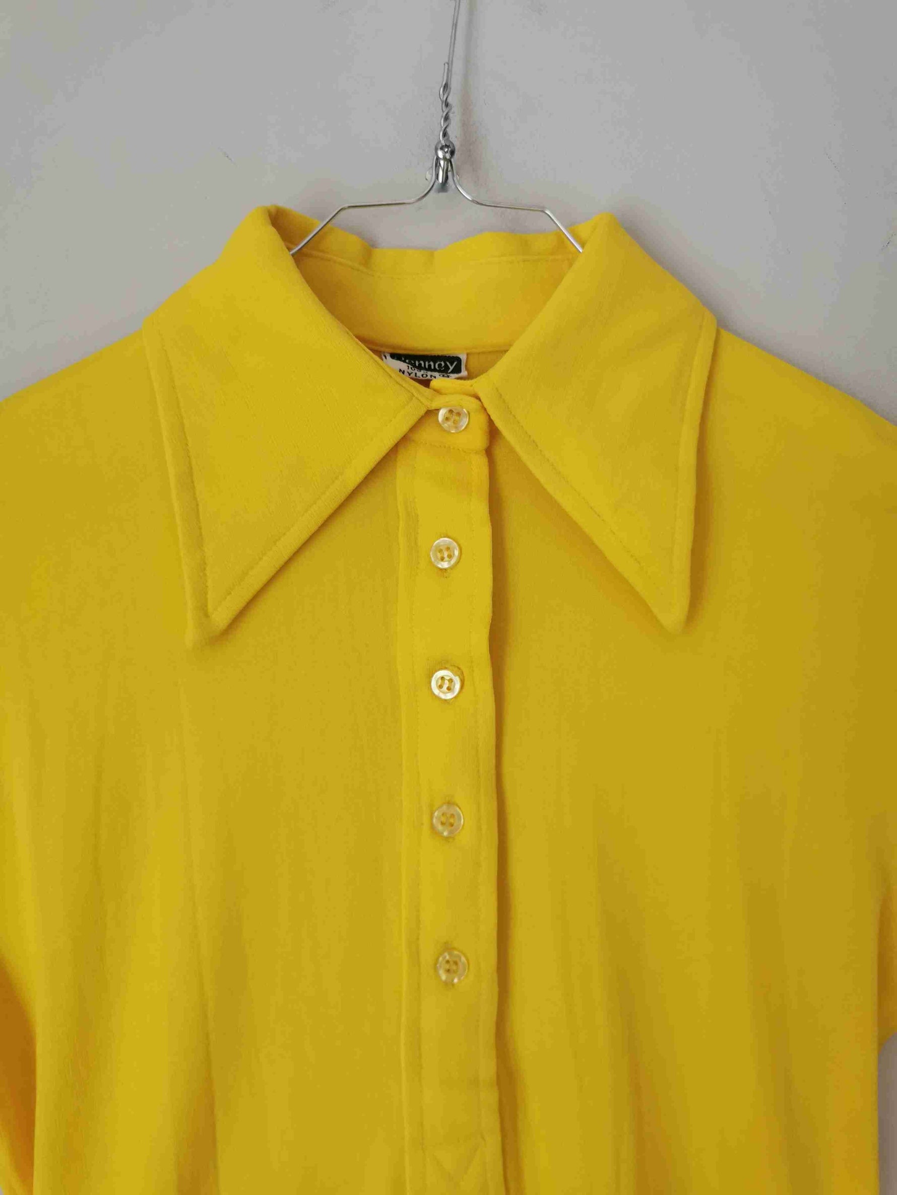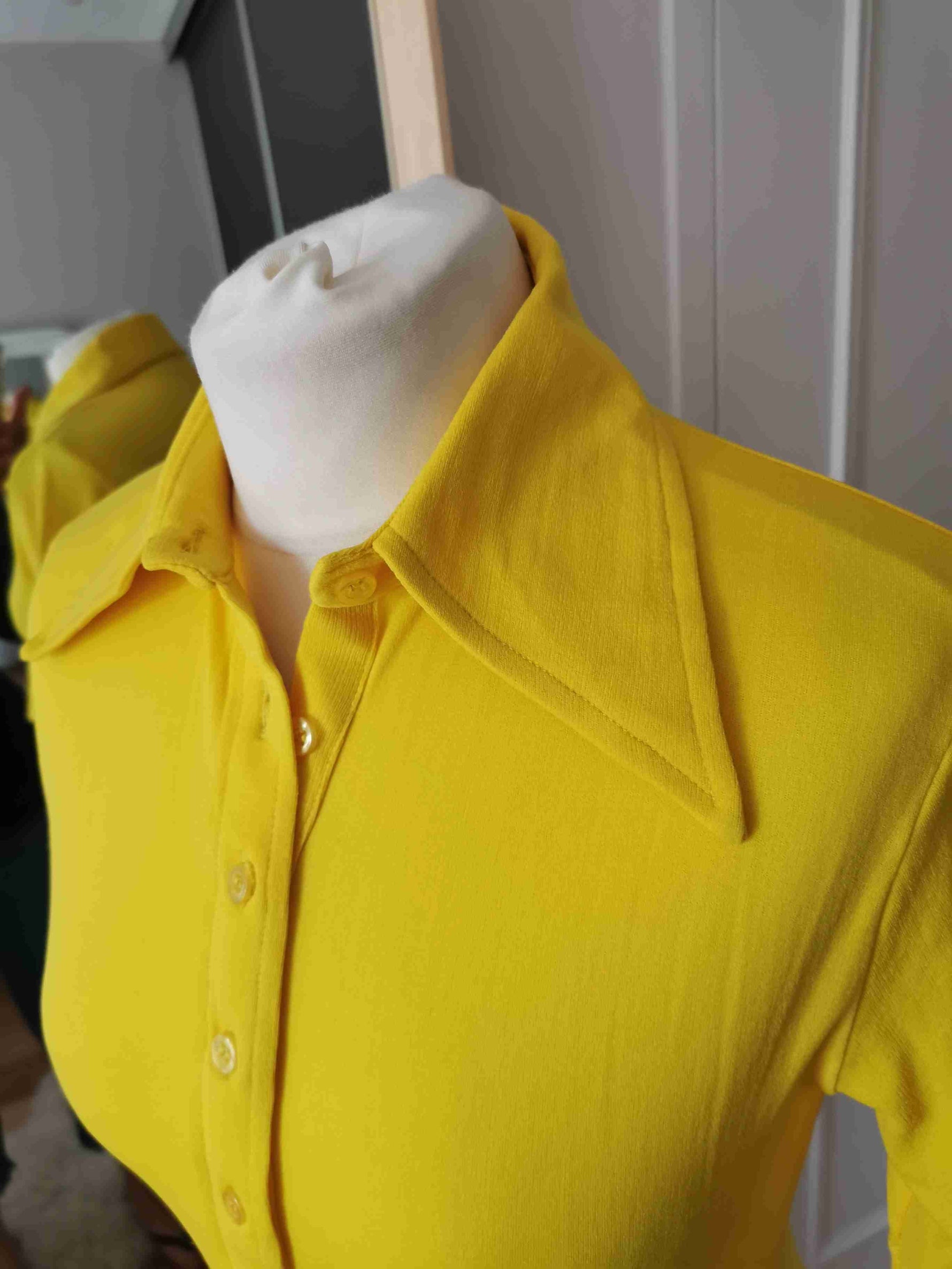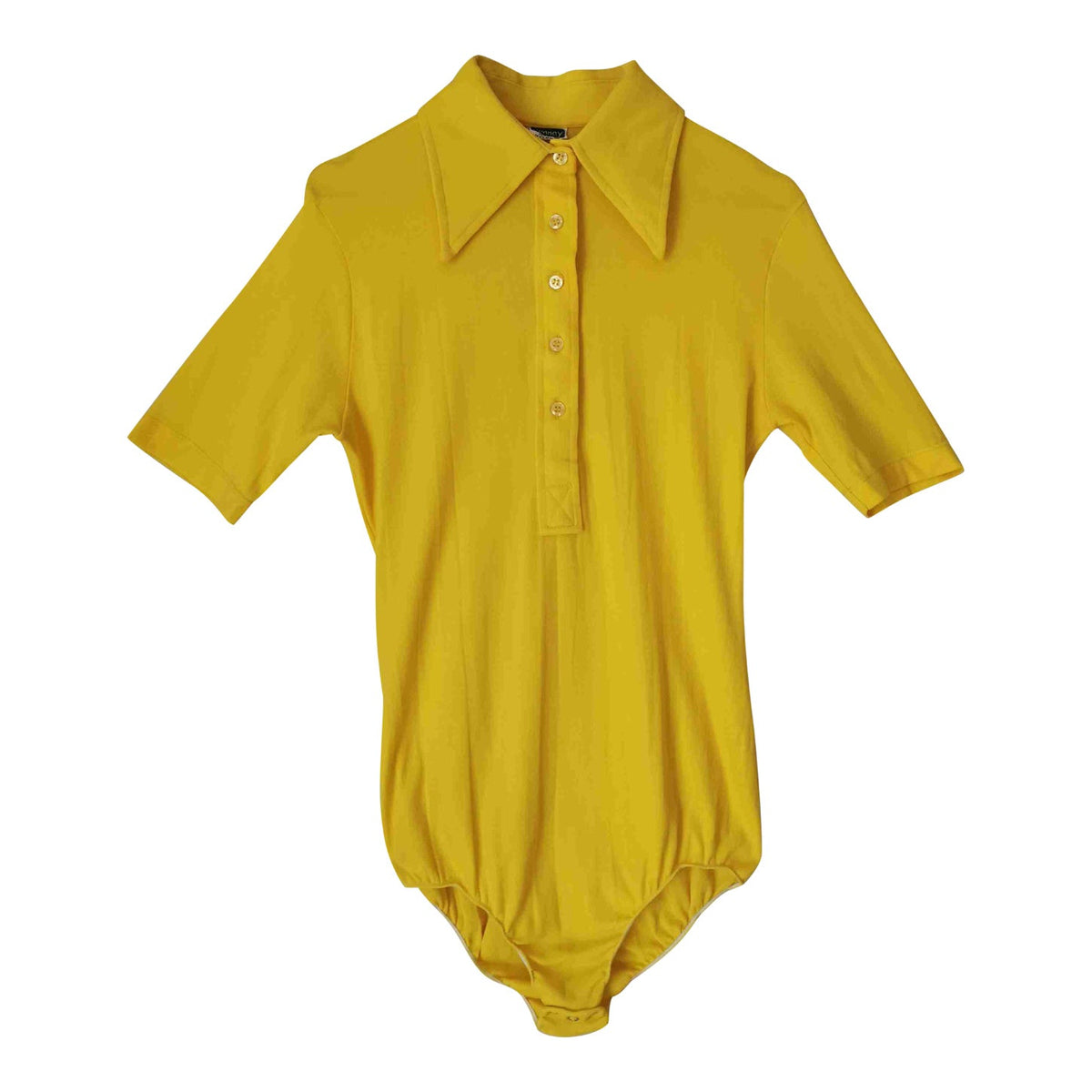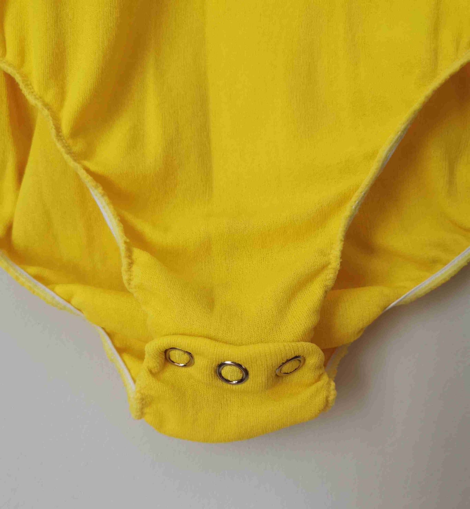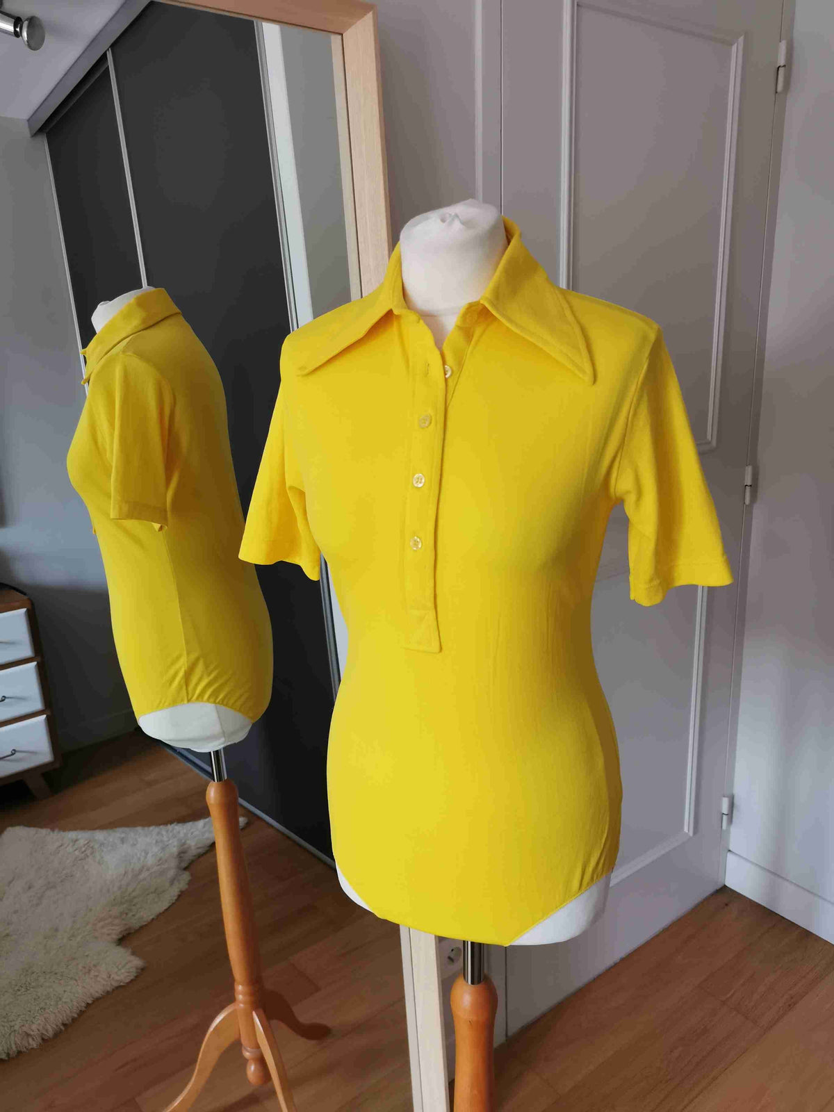 Prix unitaire parBody 70's, col pelle à tarte typique de la période. Boutons en partie haute. A manches courtes. Pressions à l'entrejambe. Matière nylon souple et de belle qualité. Porté ici sur un mannequin taille 40