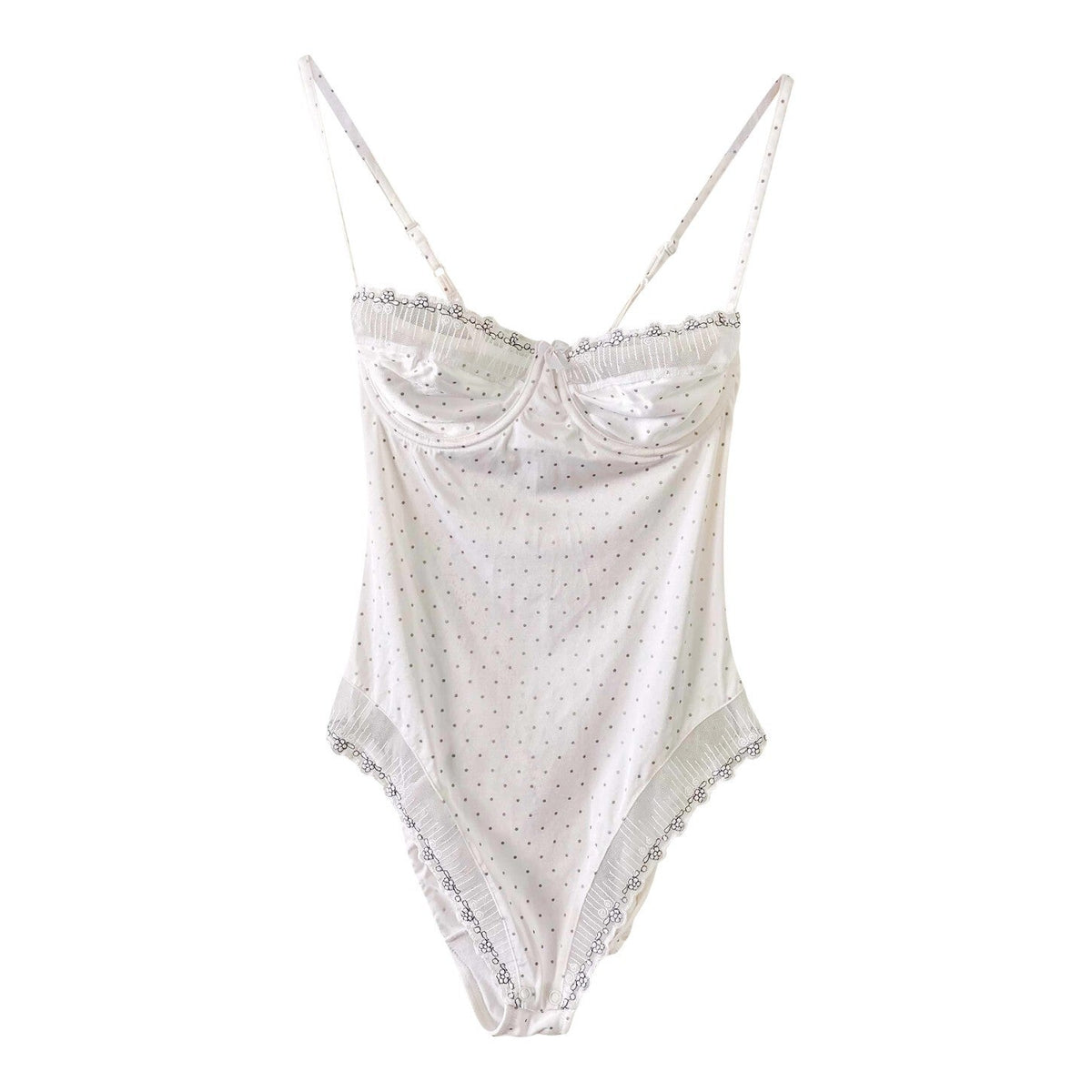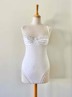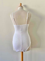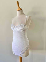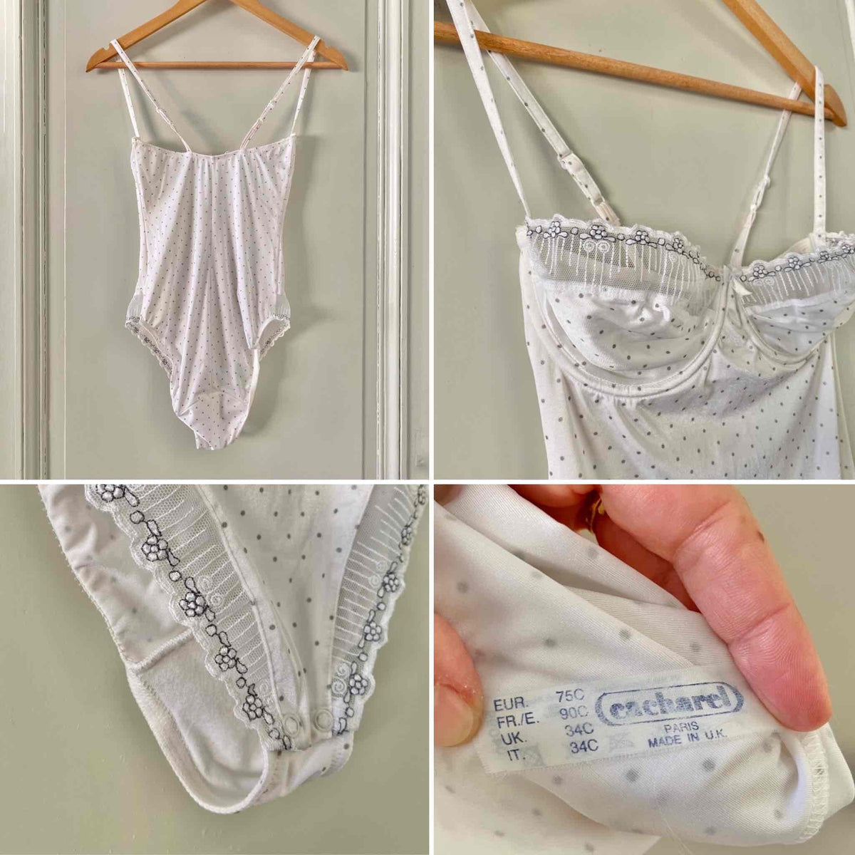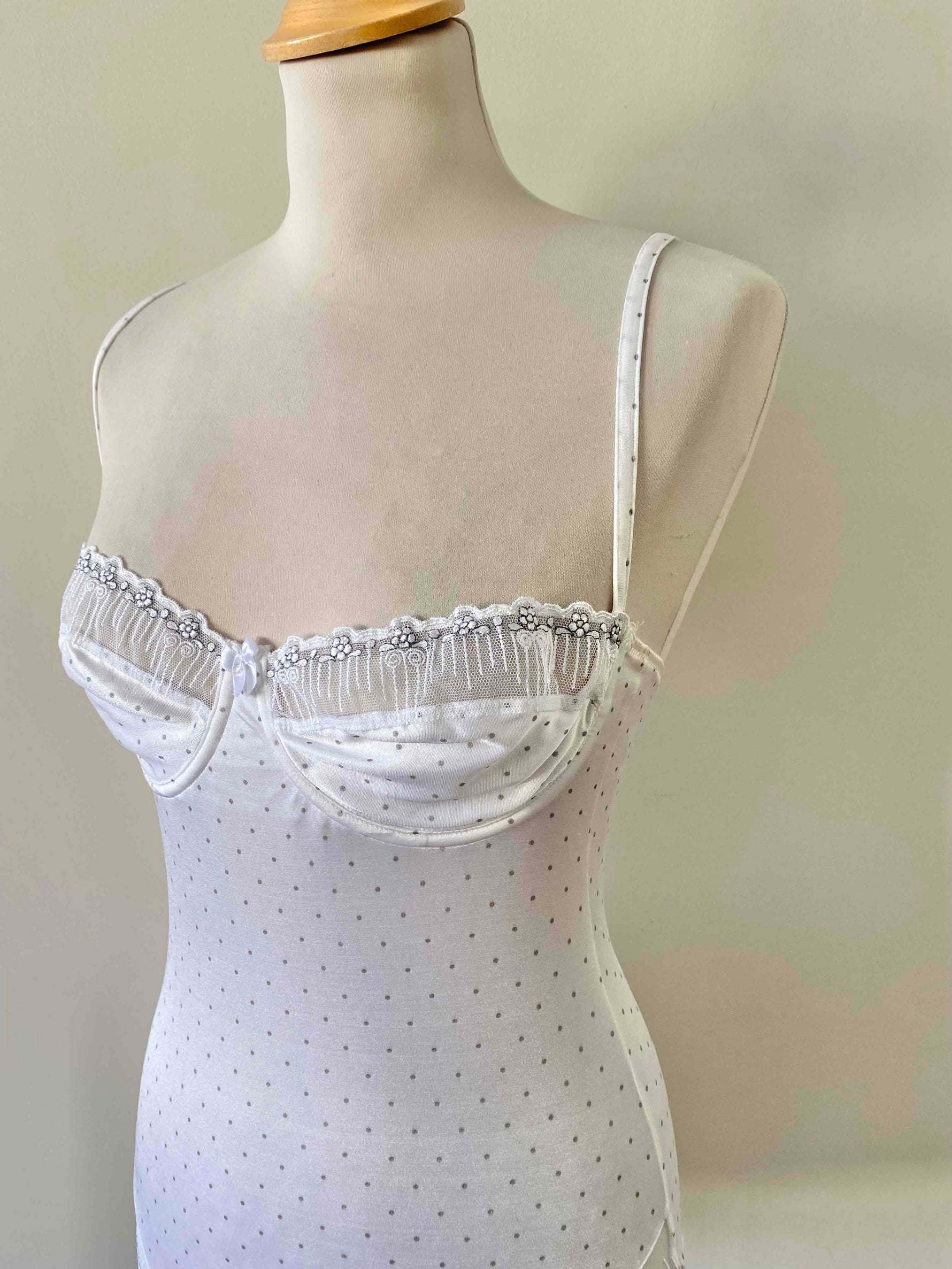 Prix unitaire parBody Cacharel en maille lycra blanc à pois gris, bordures en dentelle fleurie noire, bretelles réglables, fermeture à pressions, fabriqué en Angleterre, taille 36, bonnet C, porté ici sur un mannequin T36.