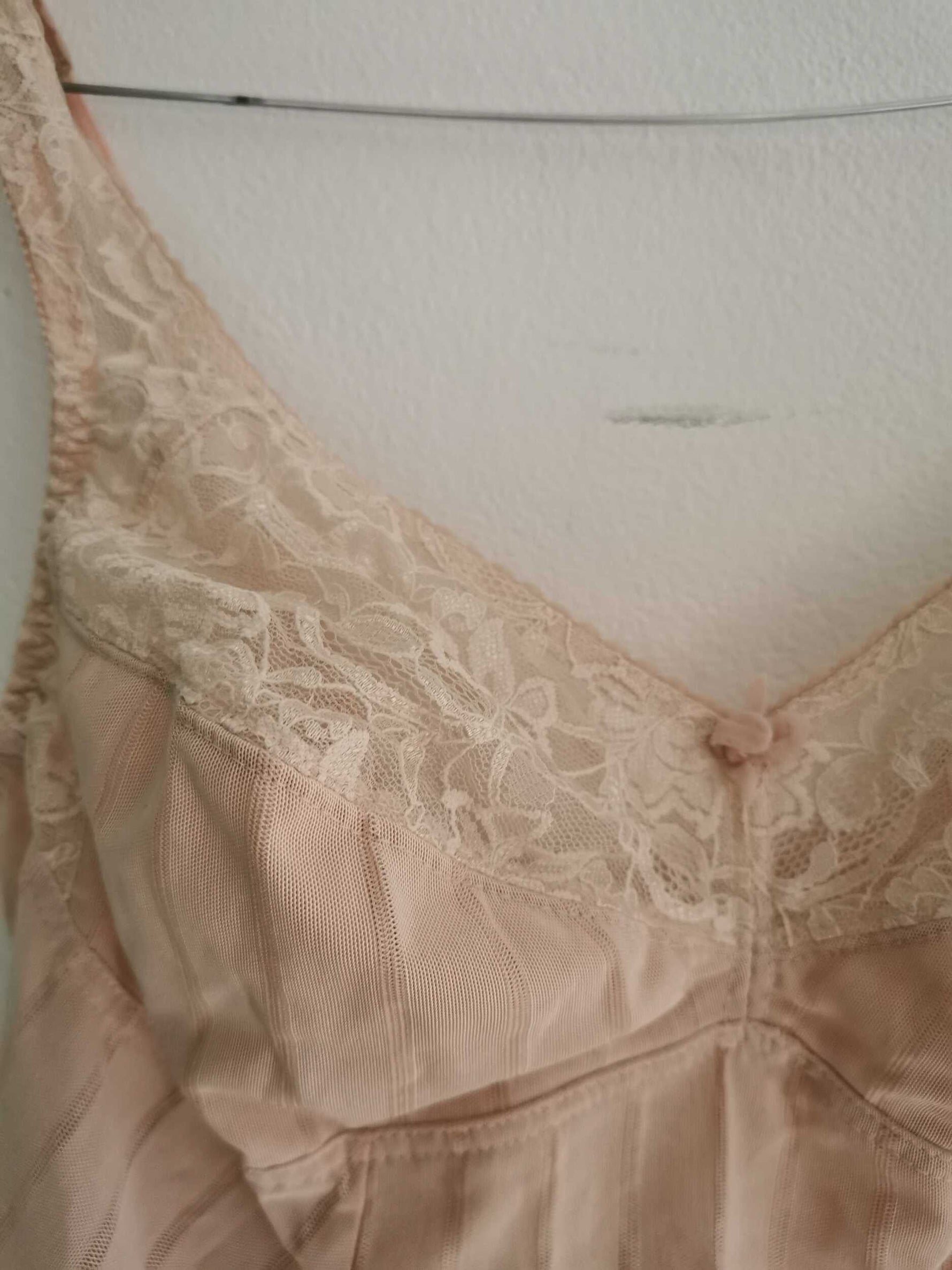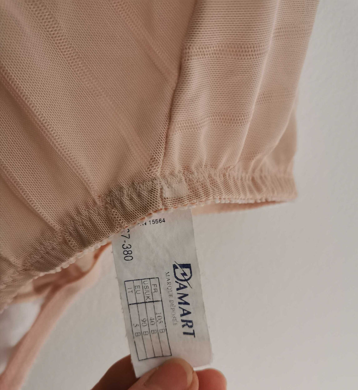Prix unitaire parGuêpière rose poudré de la marque Damart, dentelle sur la poitrine, agraphes à l'entrejambe et bretelles réglables. Correspond à une taille 38/ 40 et 90 B de poitrine approximativement.