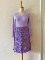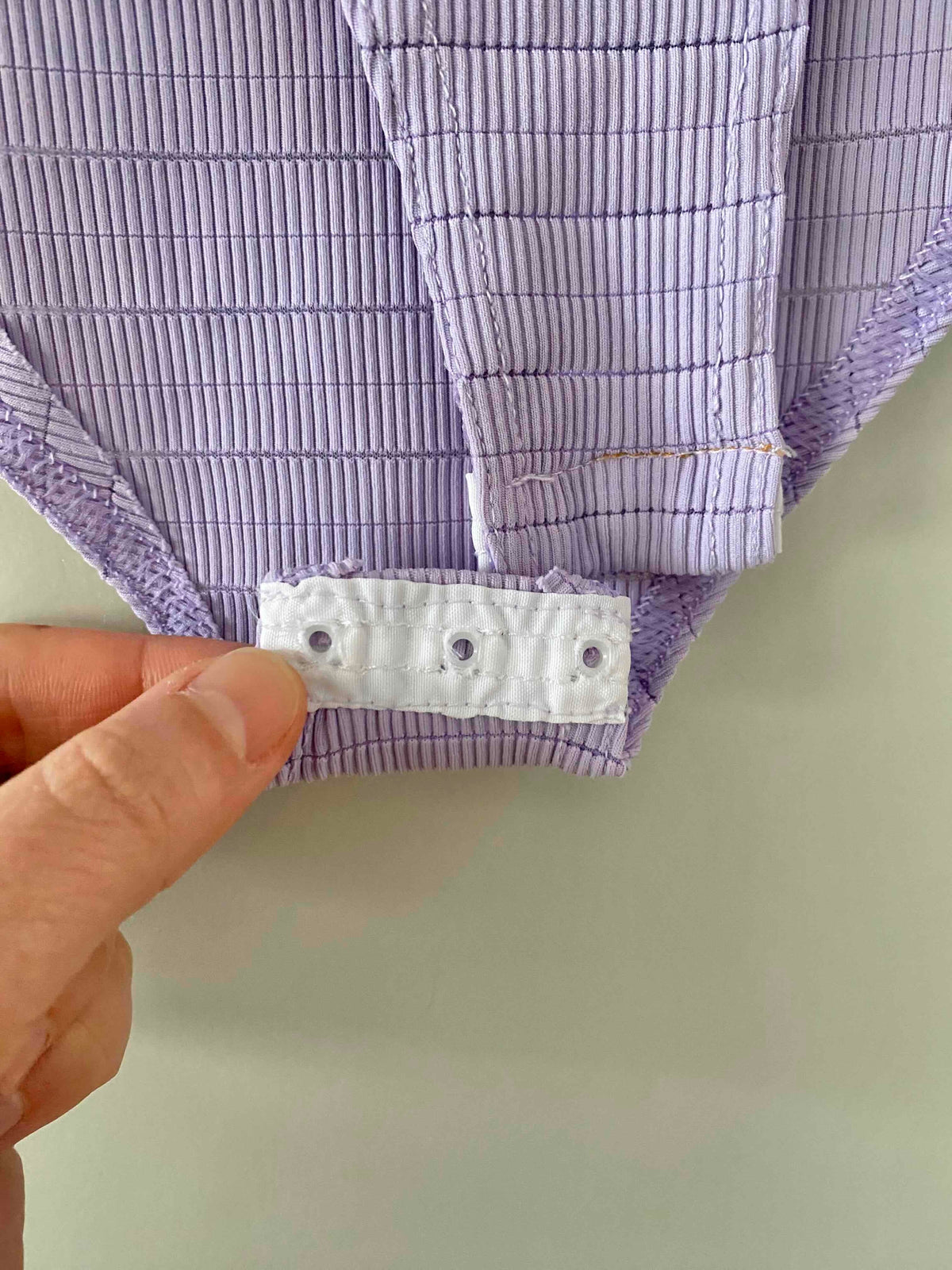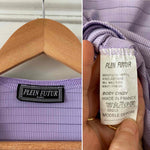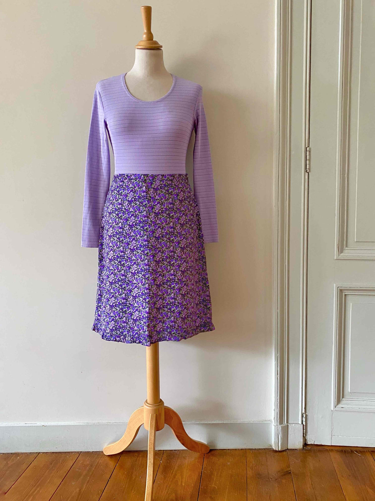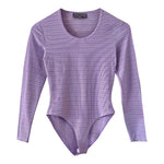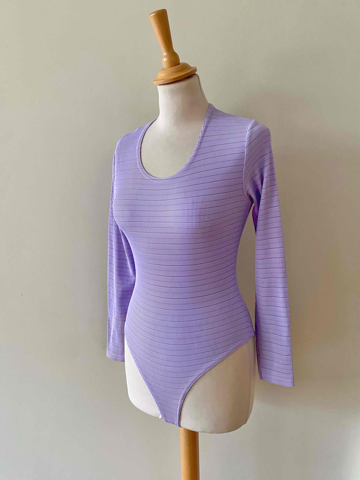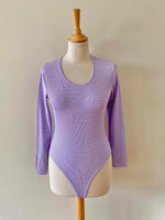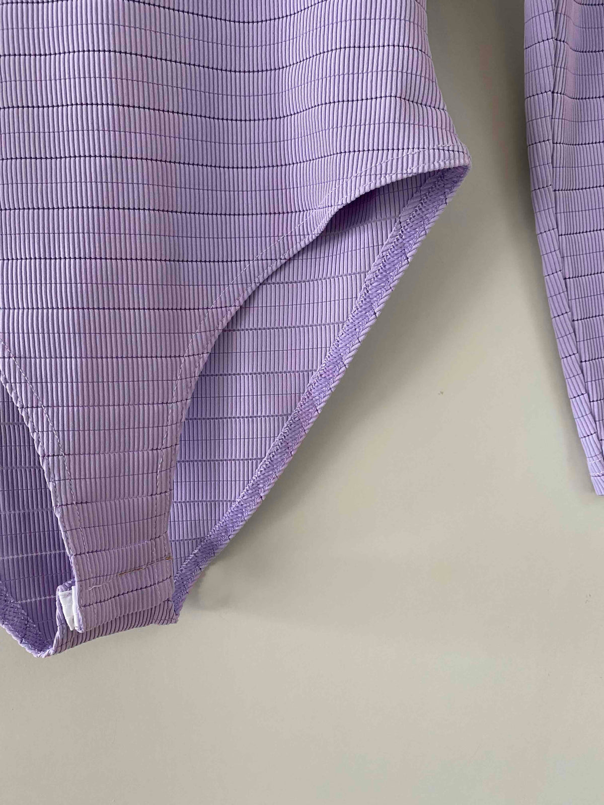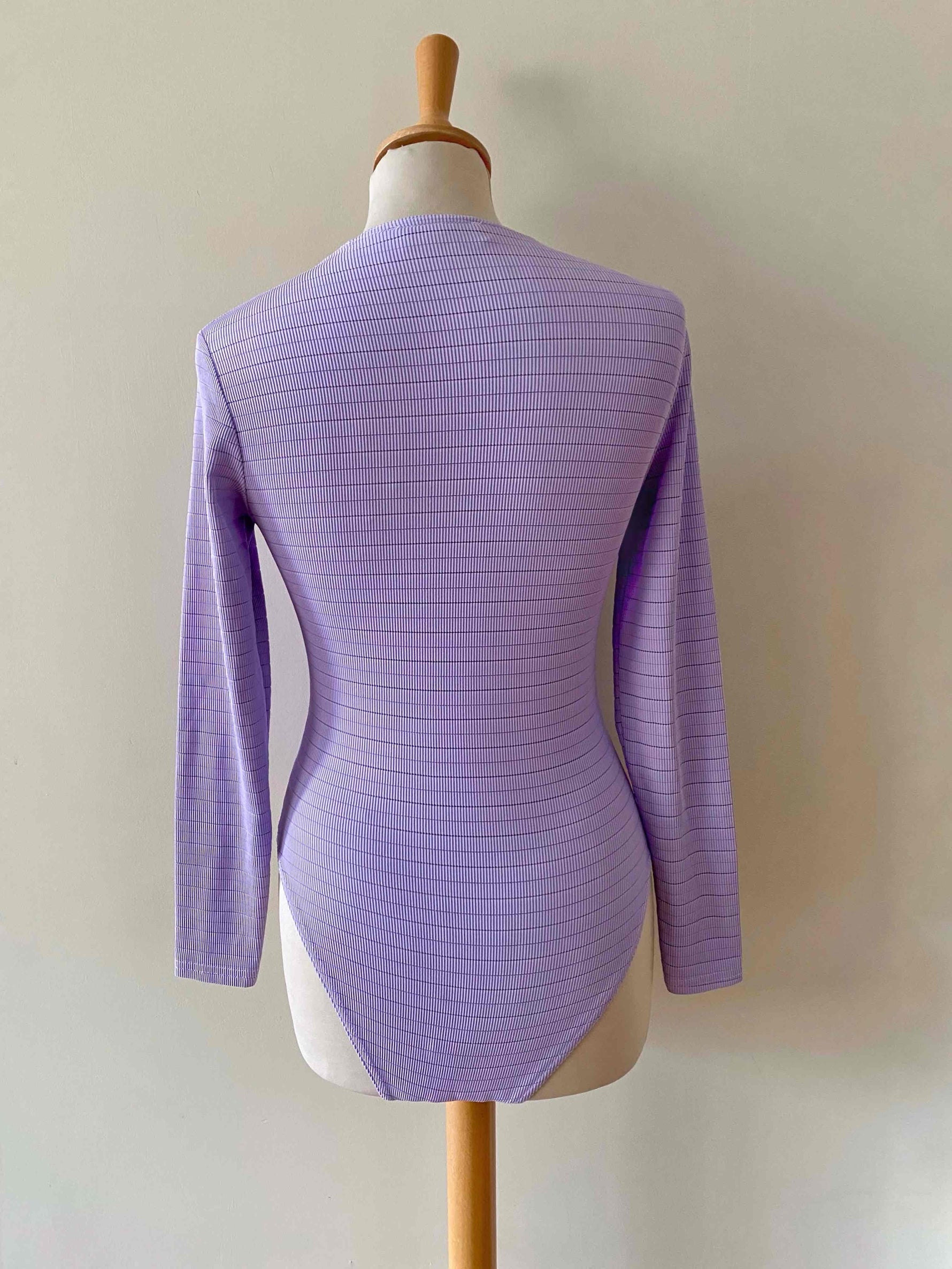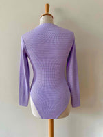 Prix unitaire parBody en maille côtelée lilas, maille striée, fabriqué en France, taille 34 et 36 exstensible porté ici sur un mannequin T36.