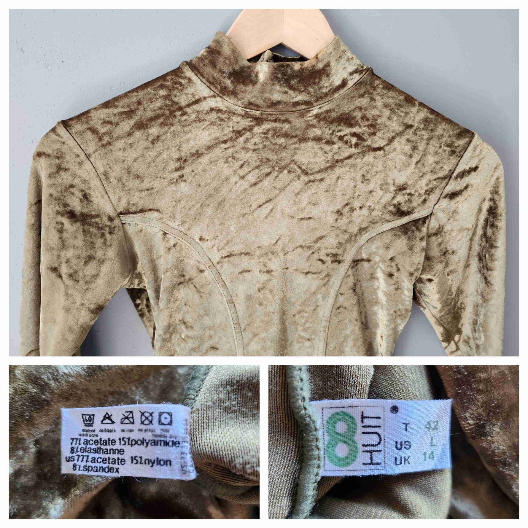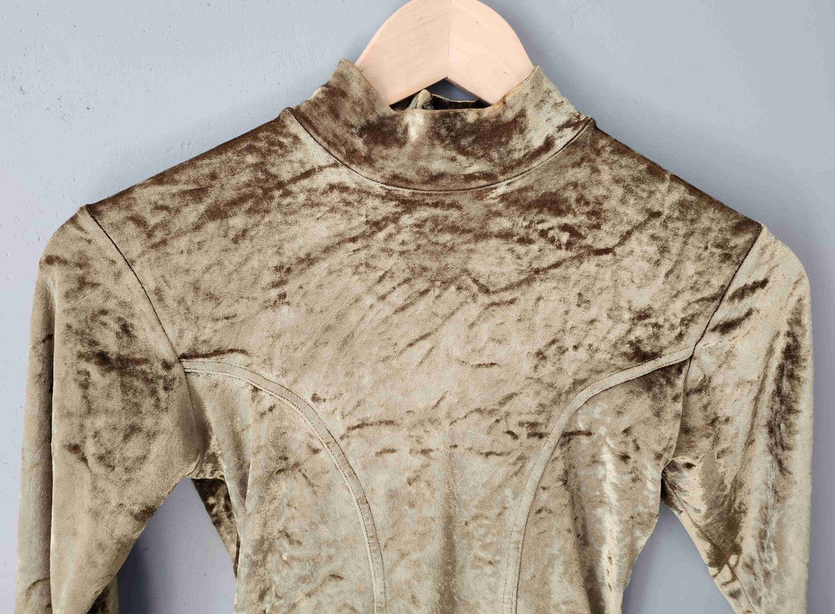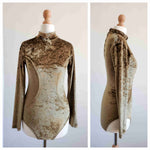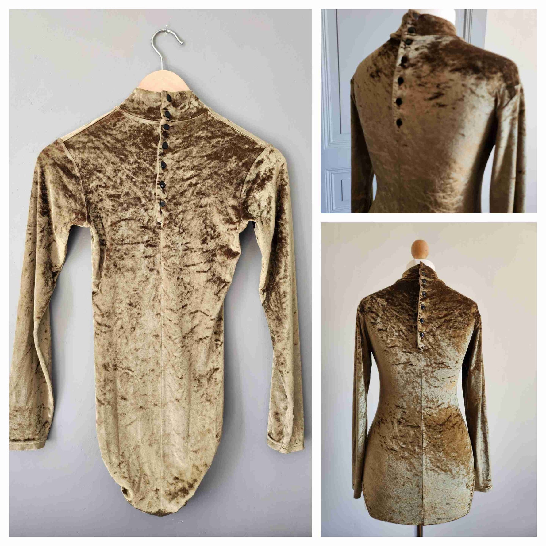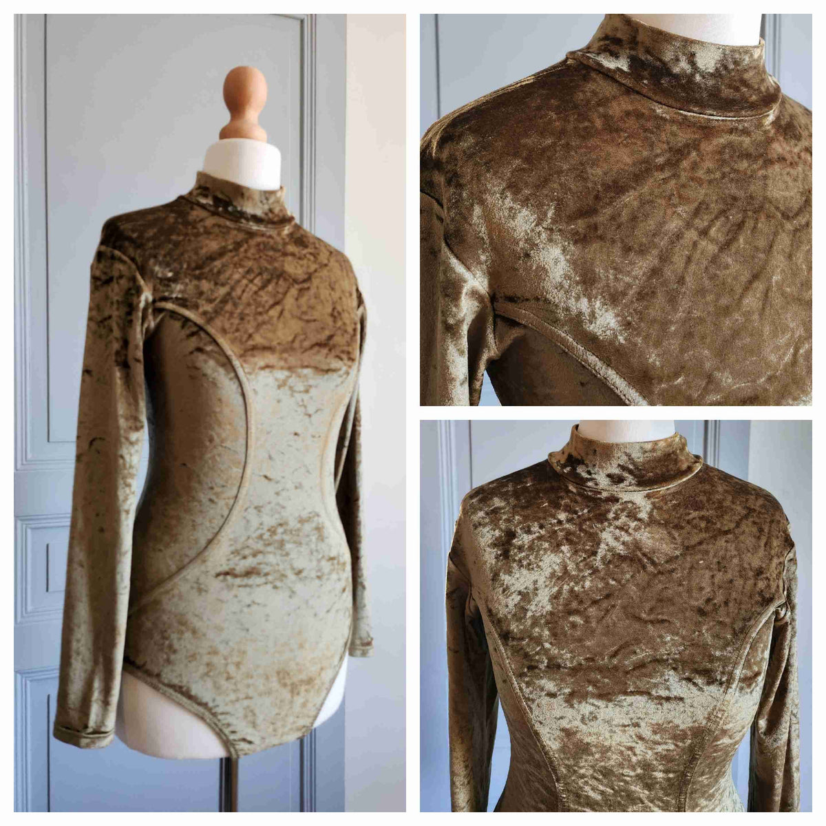 Prix unitaire parBody en velours stretch à effet moiré coloris olive, petit col montant, manches longues, petites pressions entrejambe, pressions au dos.