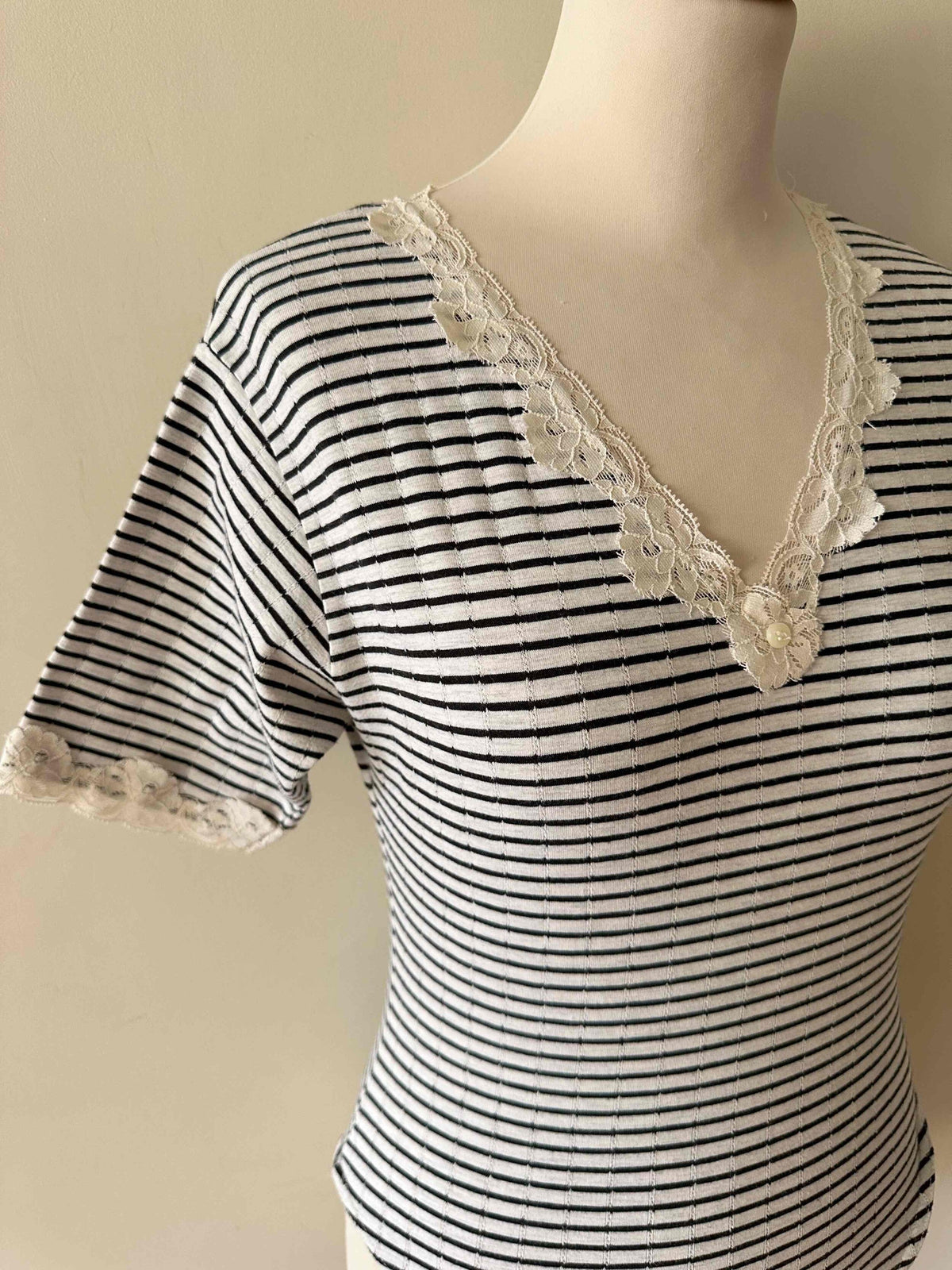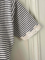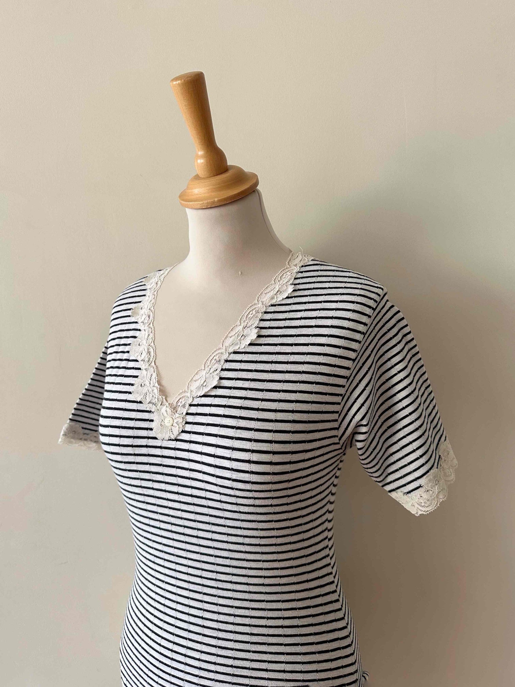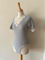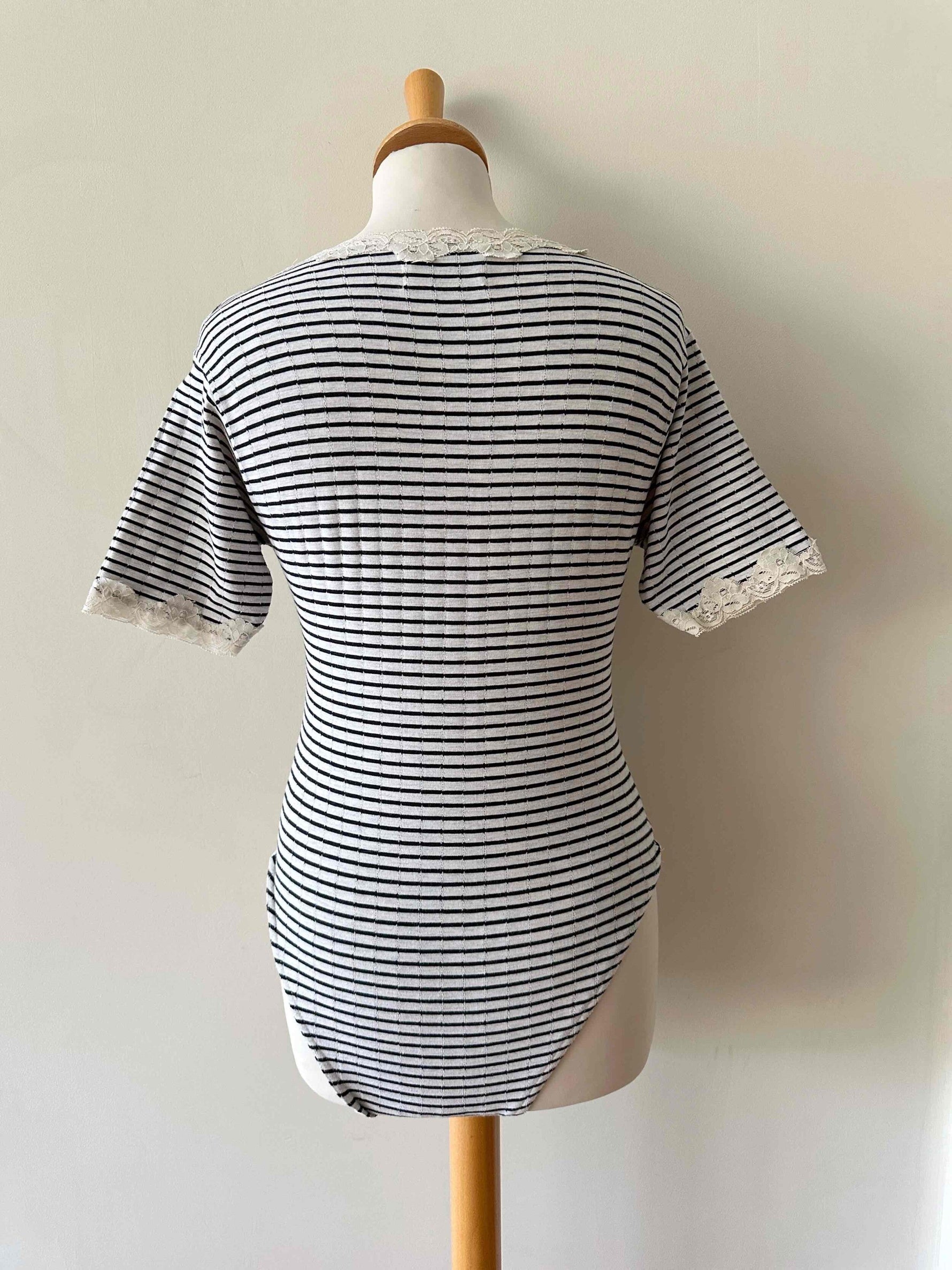 Prix unitaire parBody marinière en coton ecru chiné rayures marines, manches courtes et encolure bordées de dentelle écrue, fermeture entrejambe à pressions, fabriqué en France, taille 36 porté ici sur un mannequin T36.