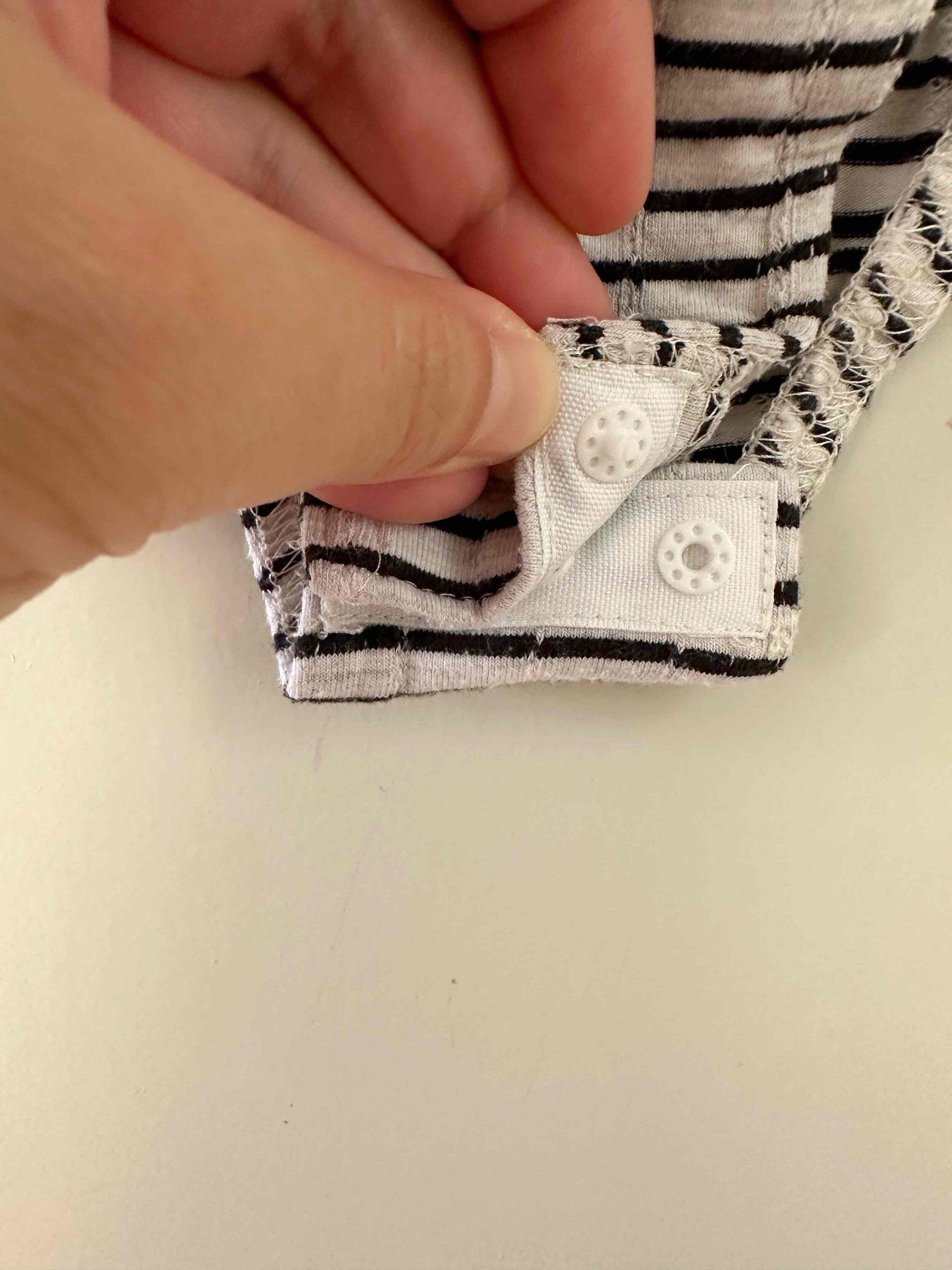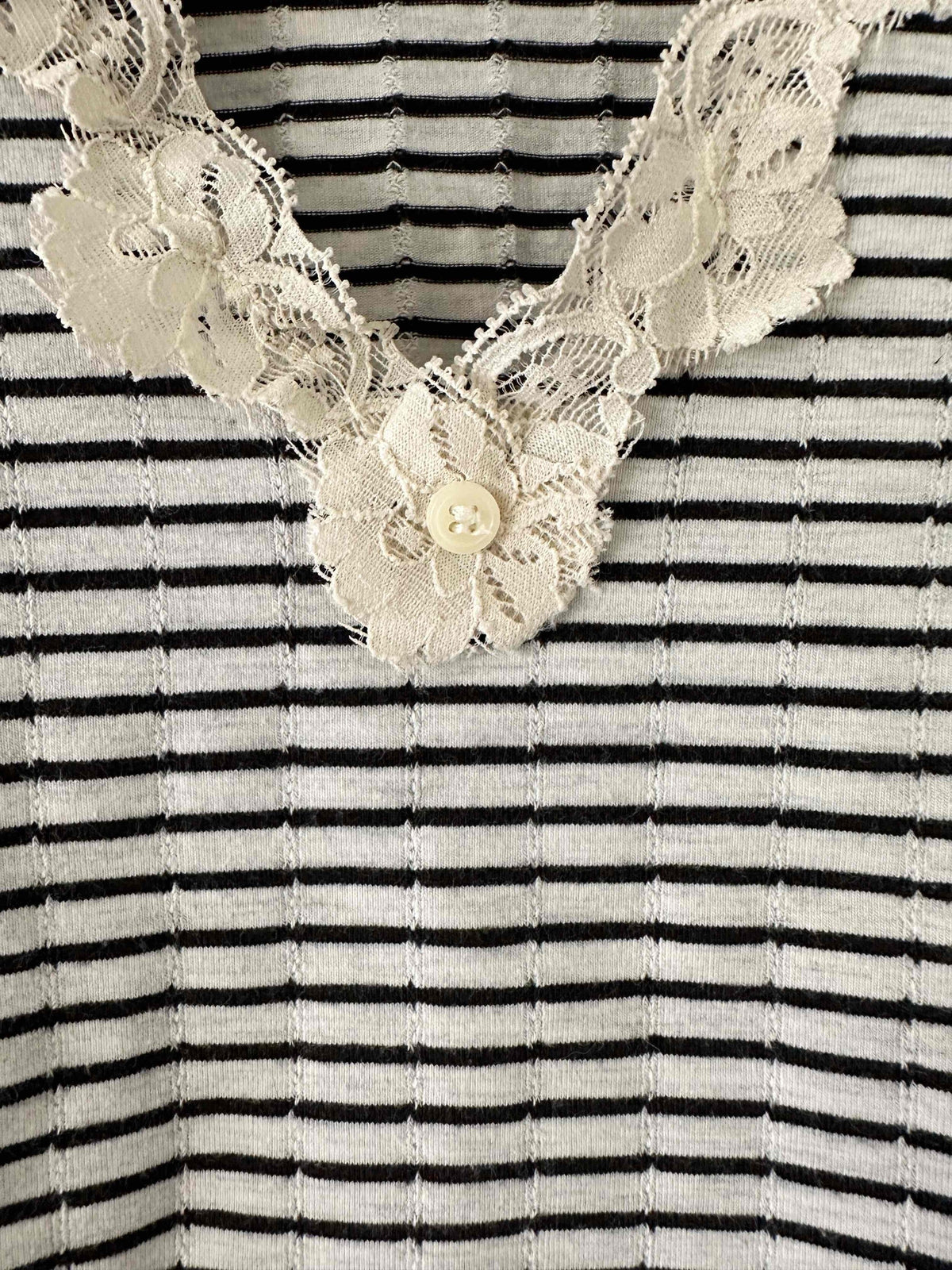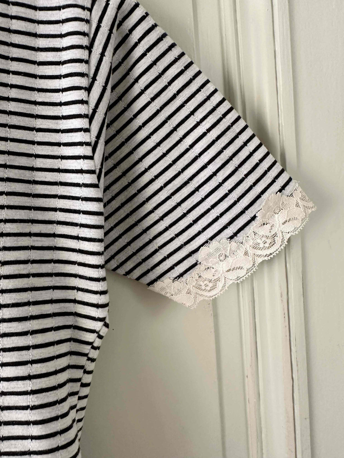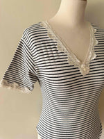 Prix unitaire parBody marinière en coton ecru chiné rayures marines, manches courtes et encolure bordées de dentelle écrue, fermeture entrejambe à pressions, fabriqué en France, taille 36 porté ici sur un mannequin T36.