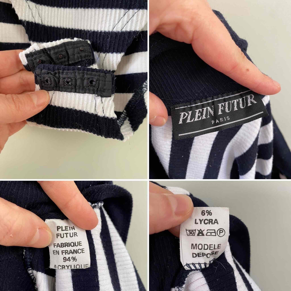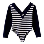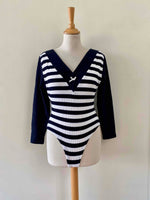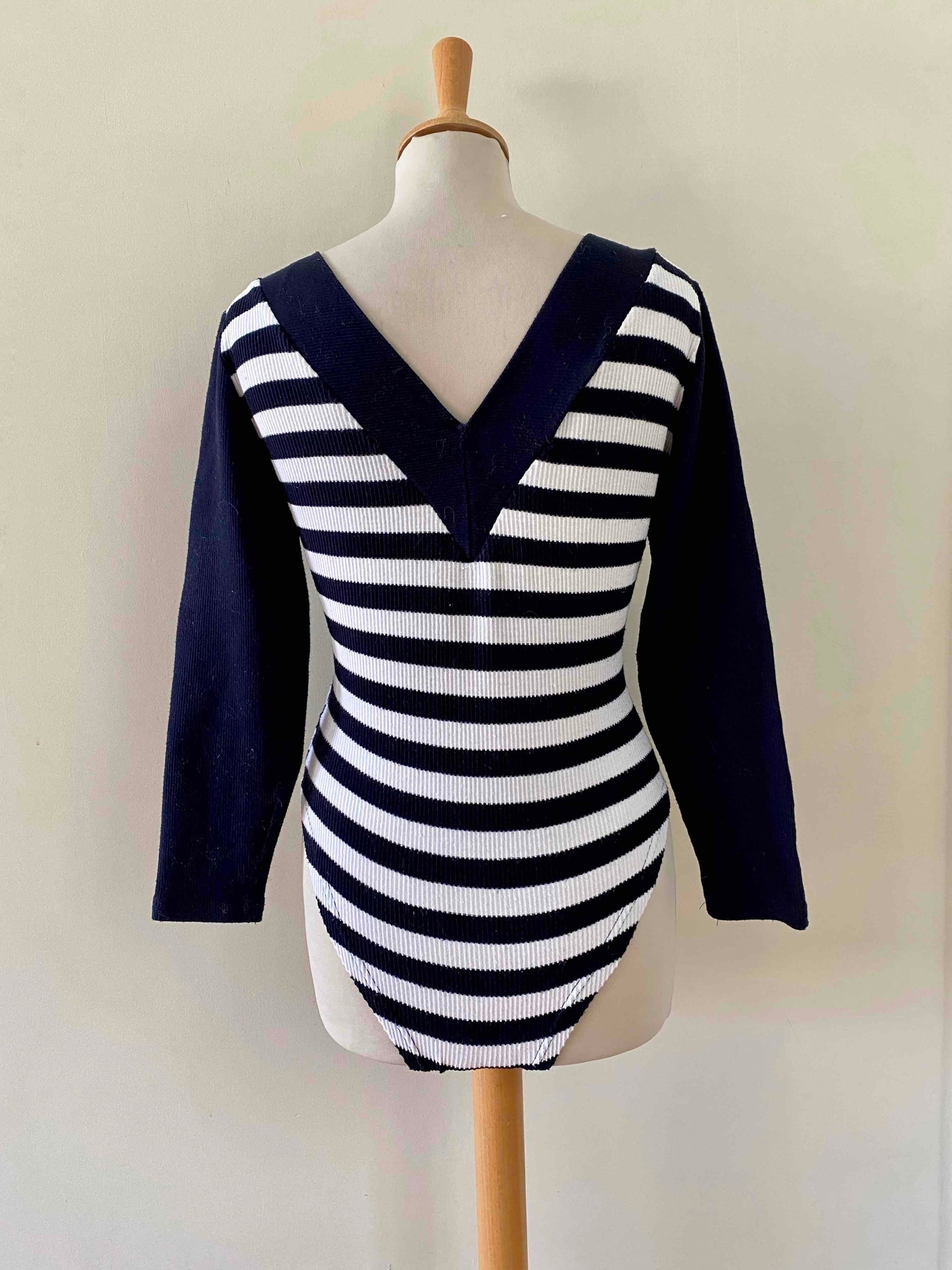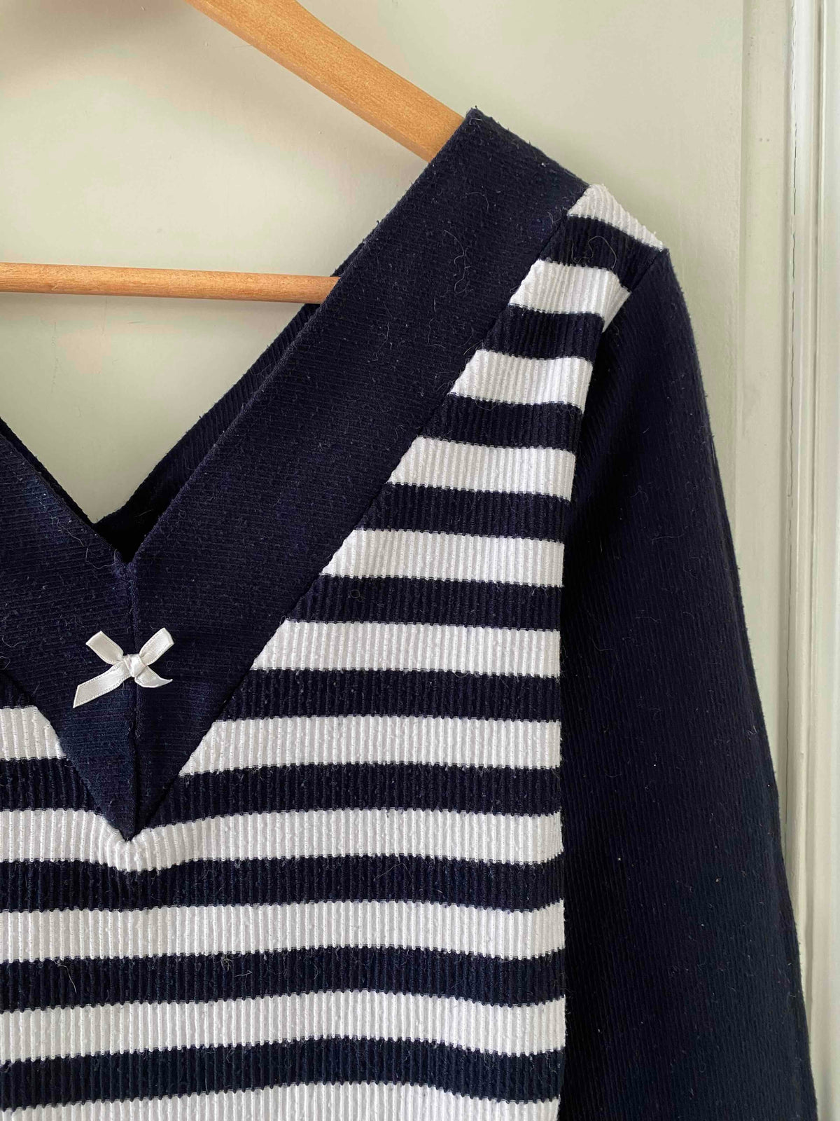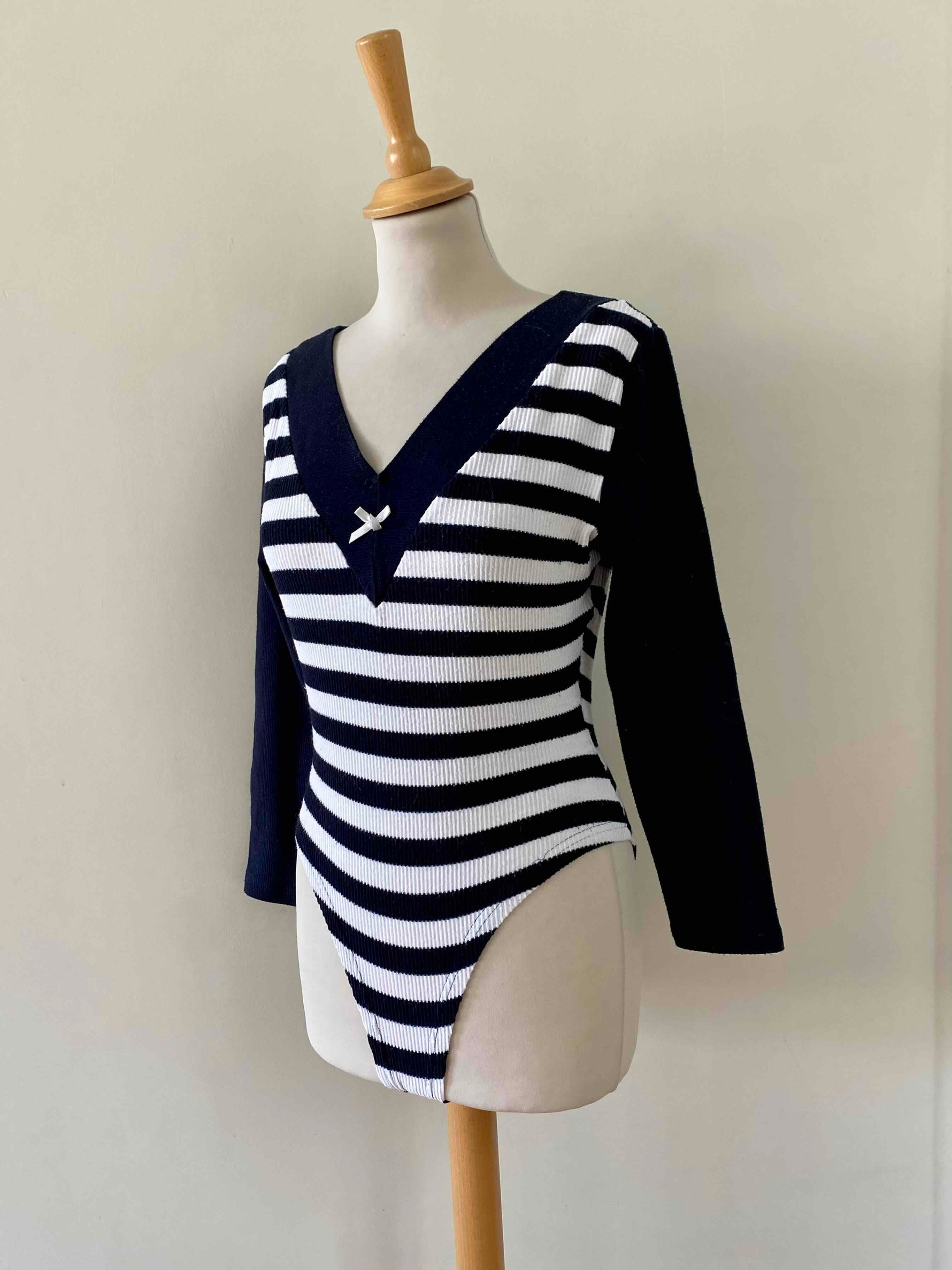 Prix unitaire parBody marinière, en maille côtelée lycra acrylique, encolure V devant et dos, petit noeud satin, manches 3/4 marine, fabriqué en France, taille 36 porté ici sur un mannequin T36.