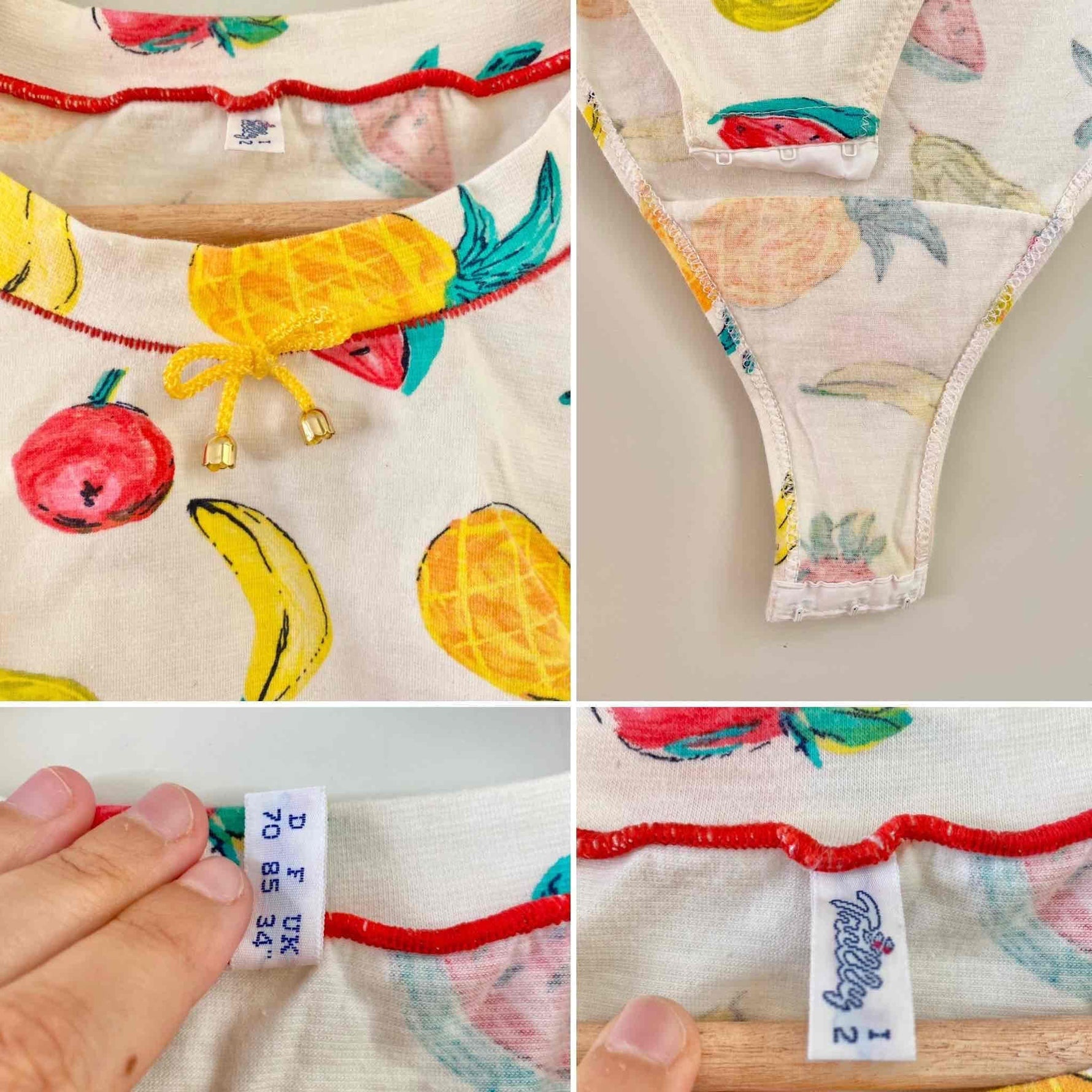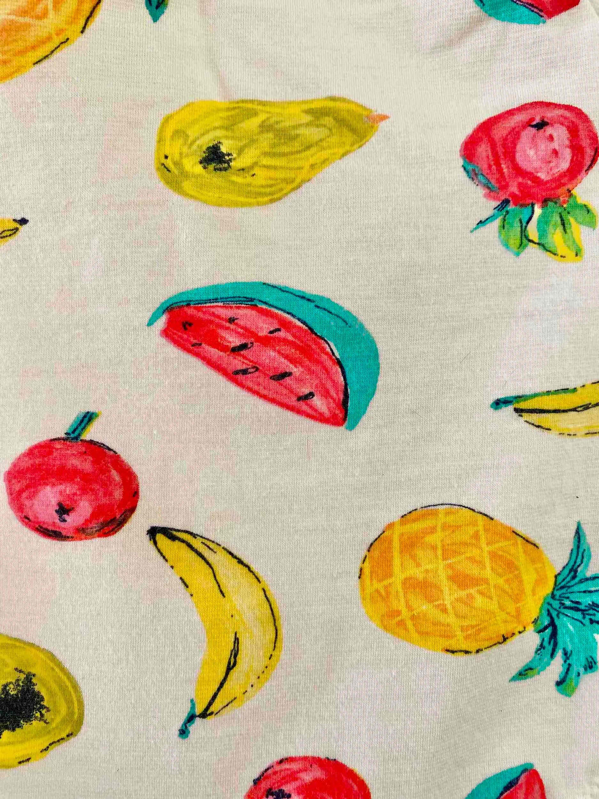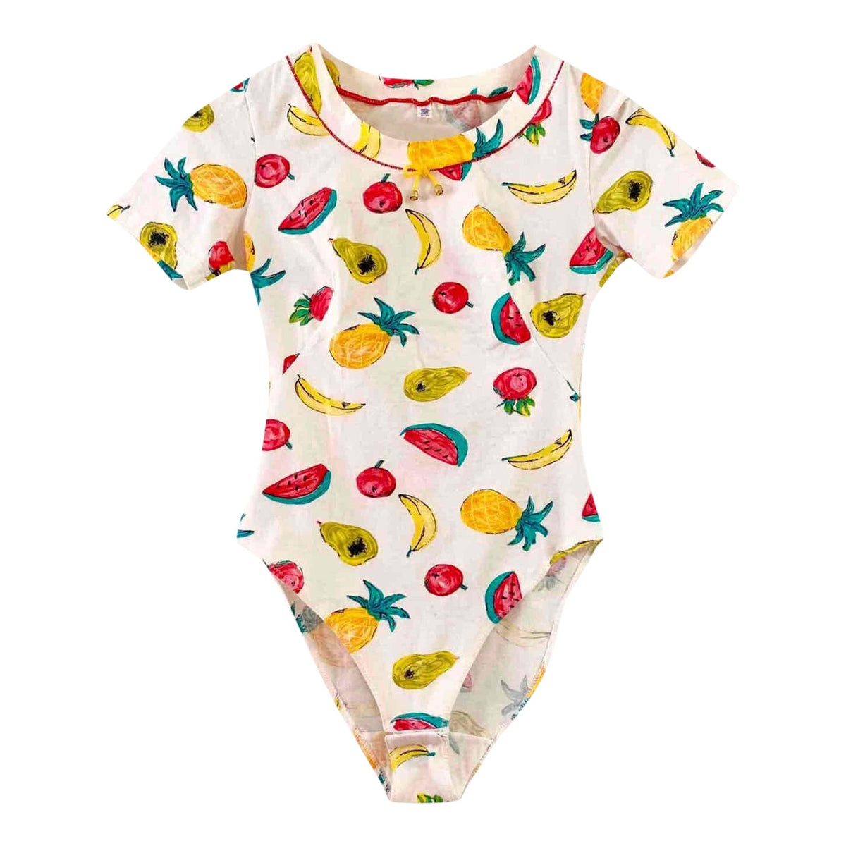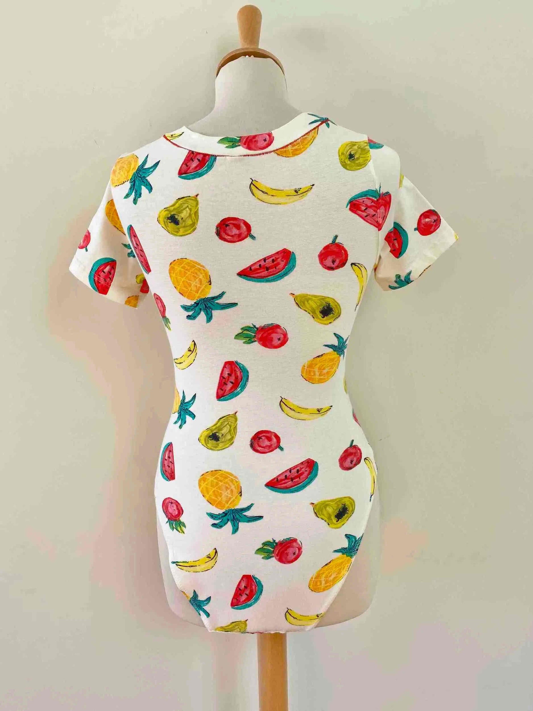Prix unitaire parBody Tutti Frutti, en jersey de coton, col rond, manches courtes, culotte à agrafes, imprimé pastèques, bananes, Ananas, petit noeud cordon jaune à l’encolure, fabriqué en Angleterre, années 90’s, taille 34 et 36 porté ici sur un mannequin T36.