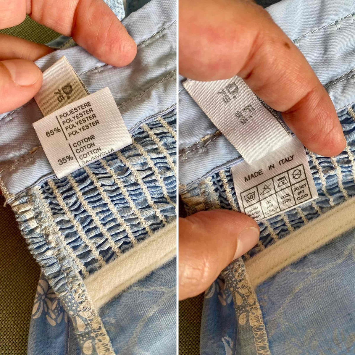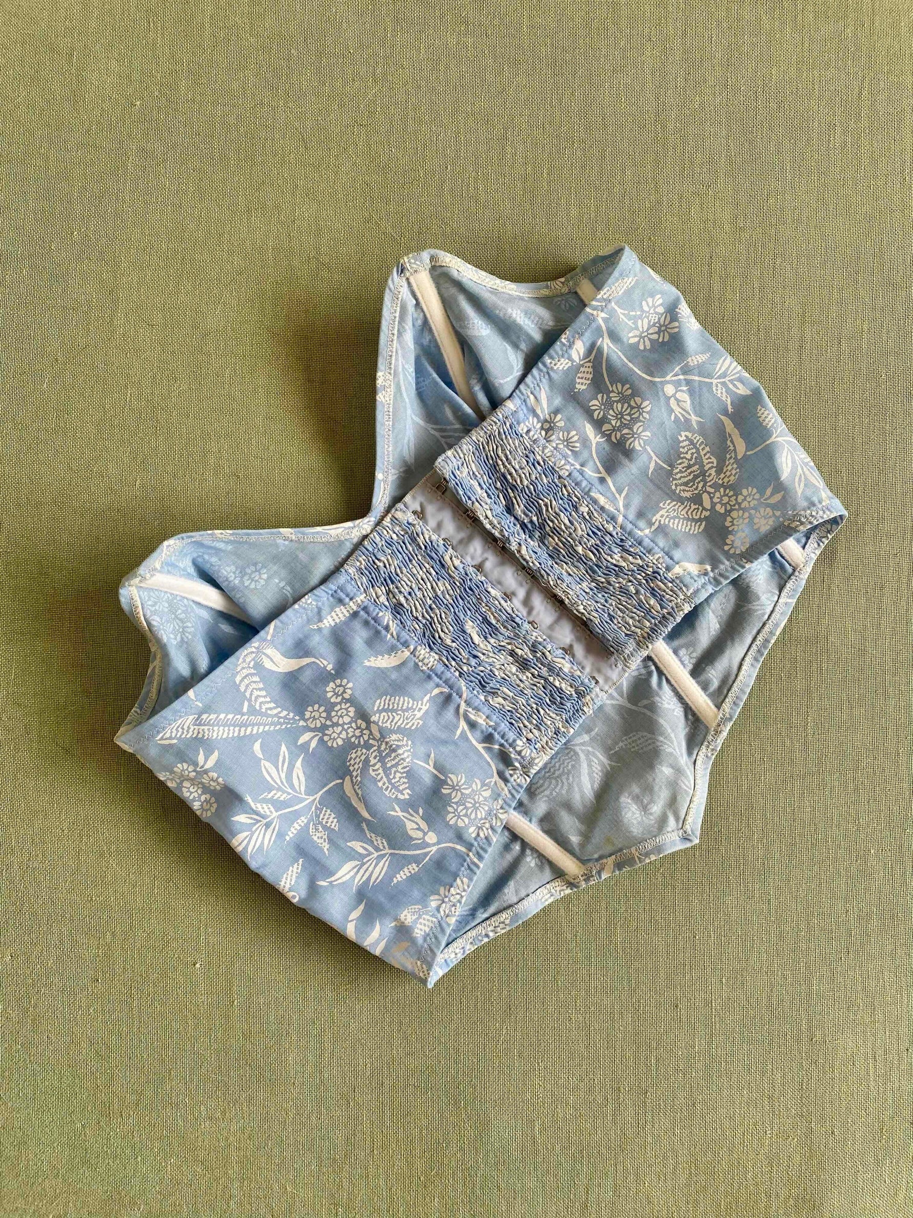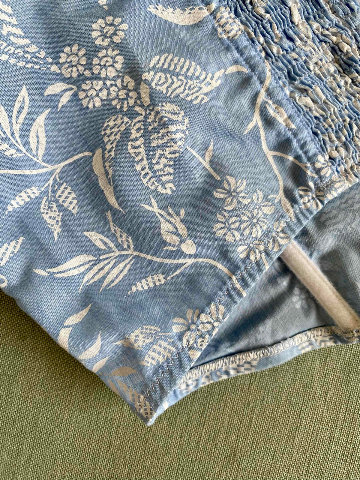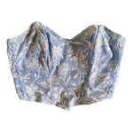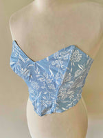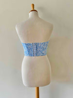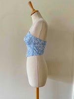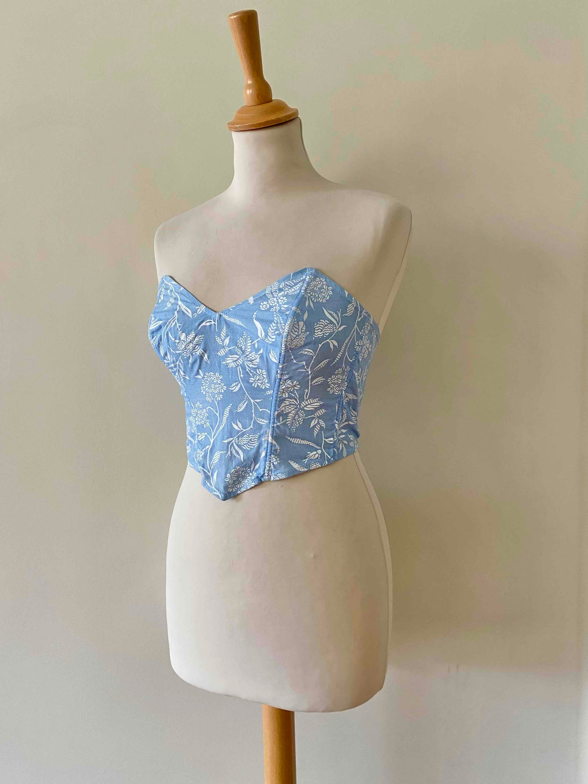 Prix unitaire parBustier à fleurs, en coton popeline mélangé bleu ciel imprimée fleurs blanches, poitrine coeur à baleines souples, dos smocké élastique, fermeture par agrafes, fabriqué en Italie, taille 34 et 36 porté ici sur un mannequin T36.