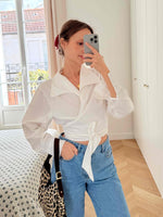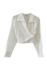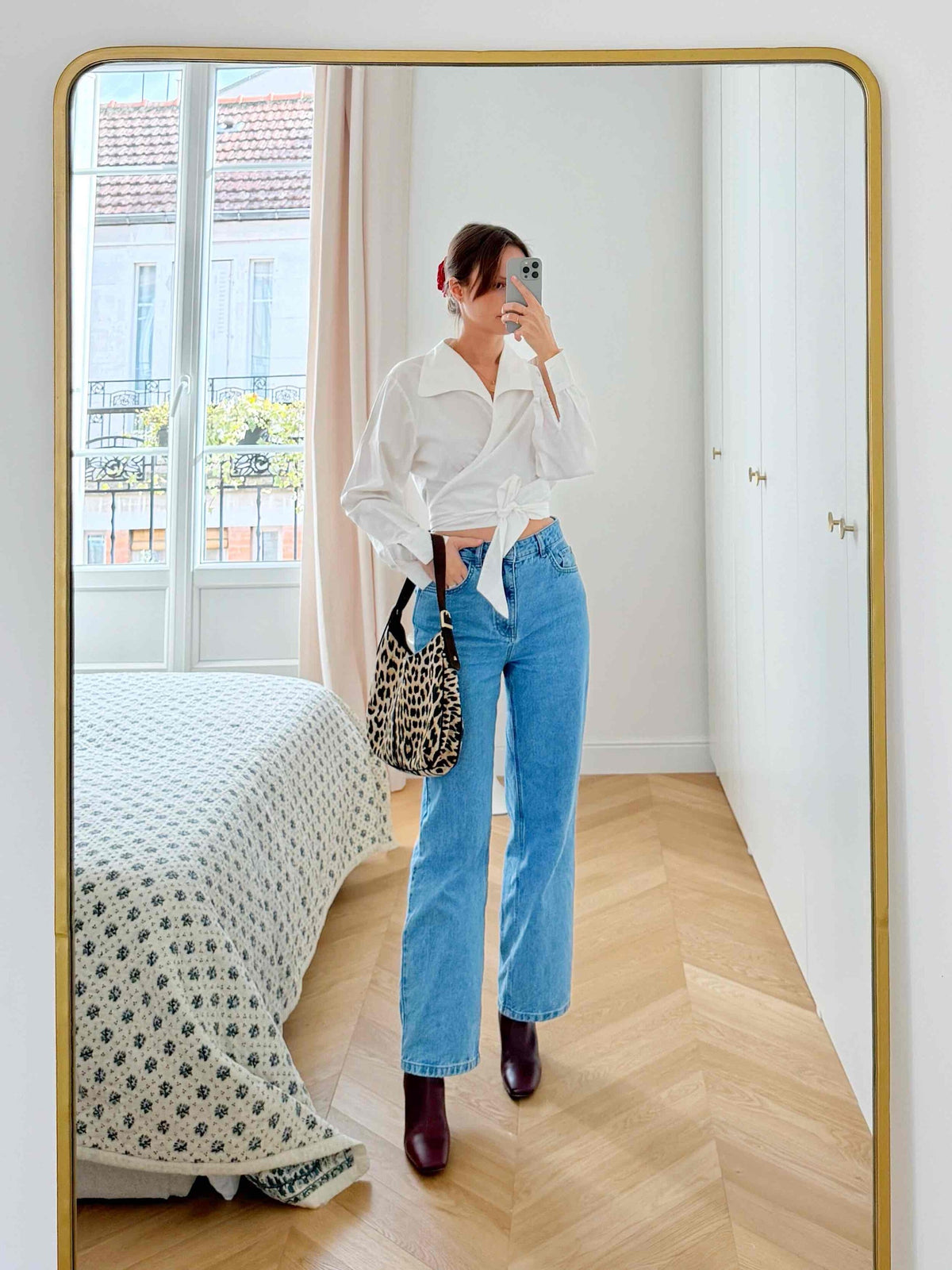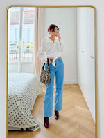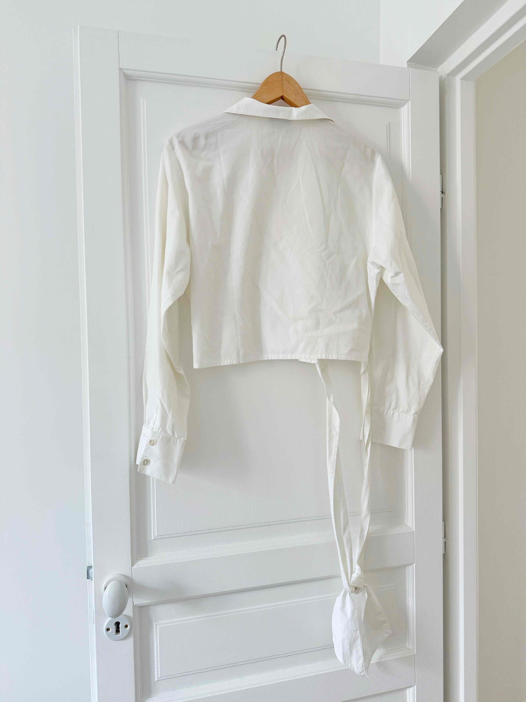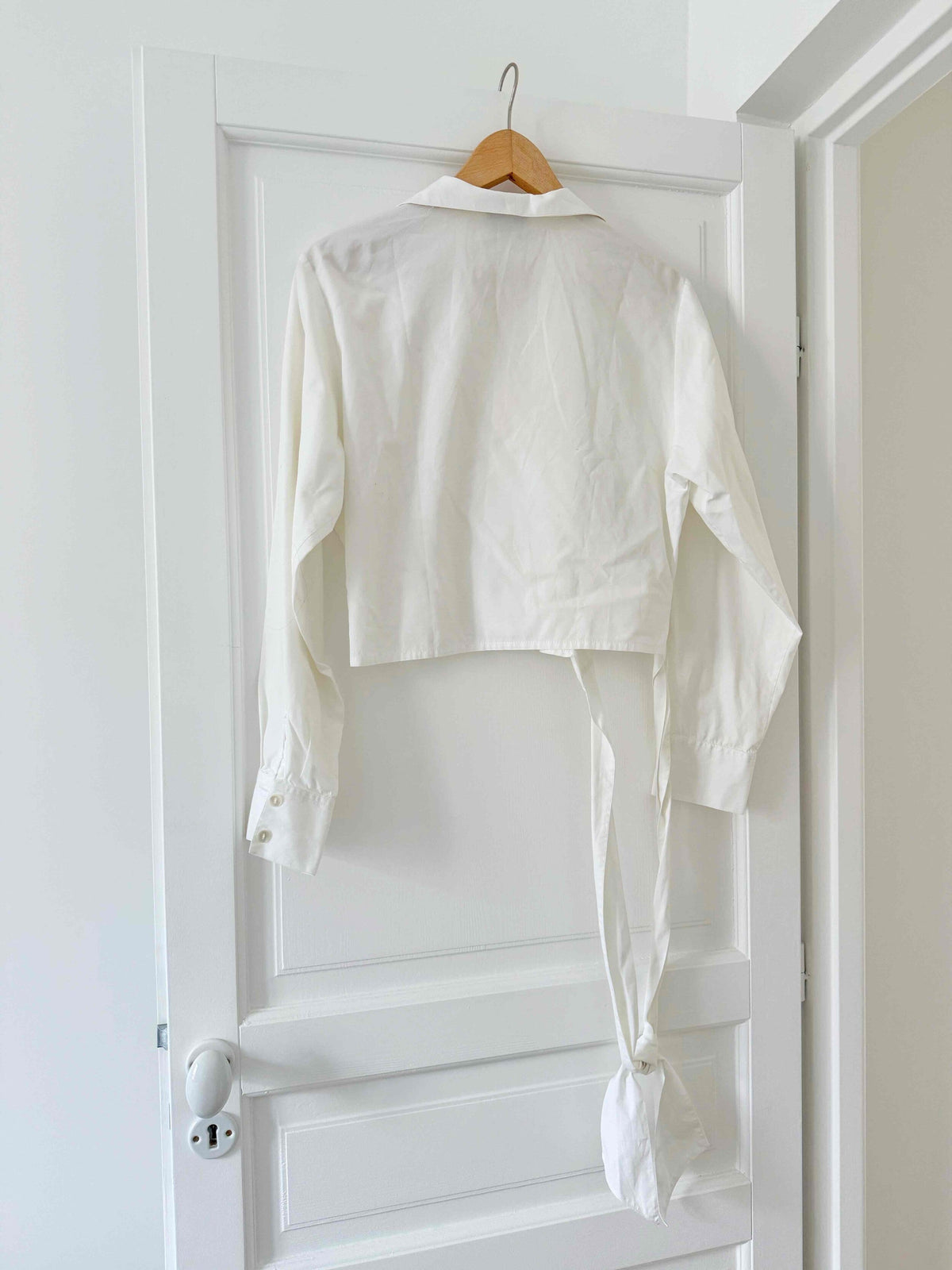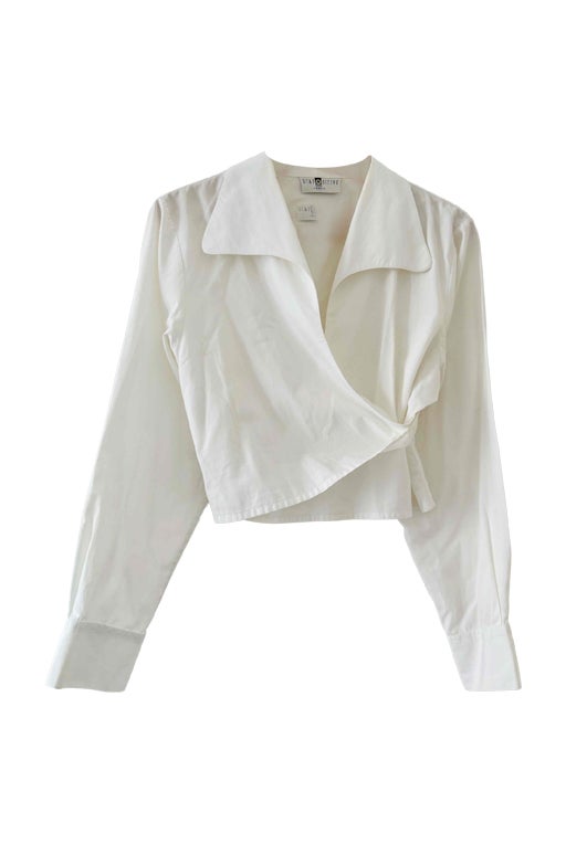 Décolleté en V, manches légèrement bouffantes, poignets fermés par deux boutons. Plutôt court.