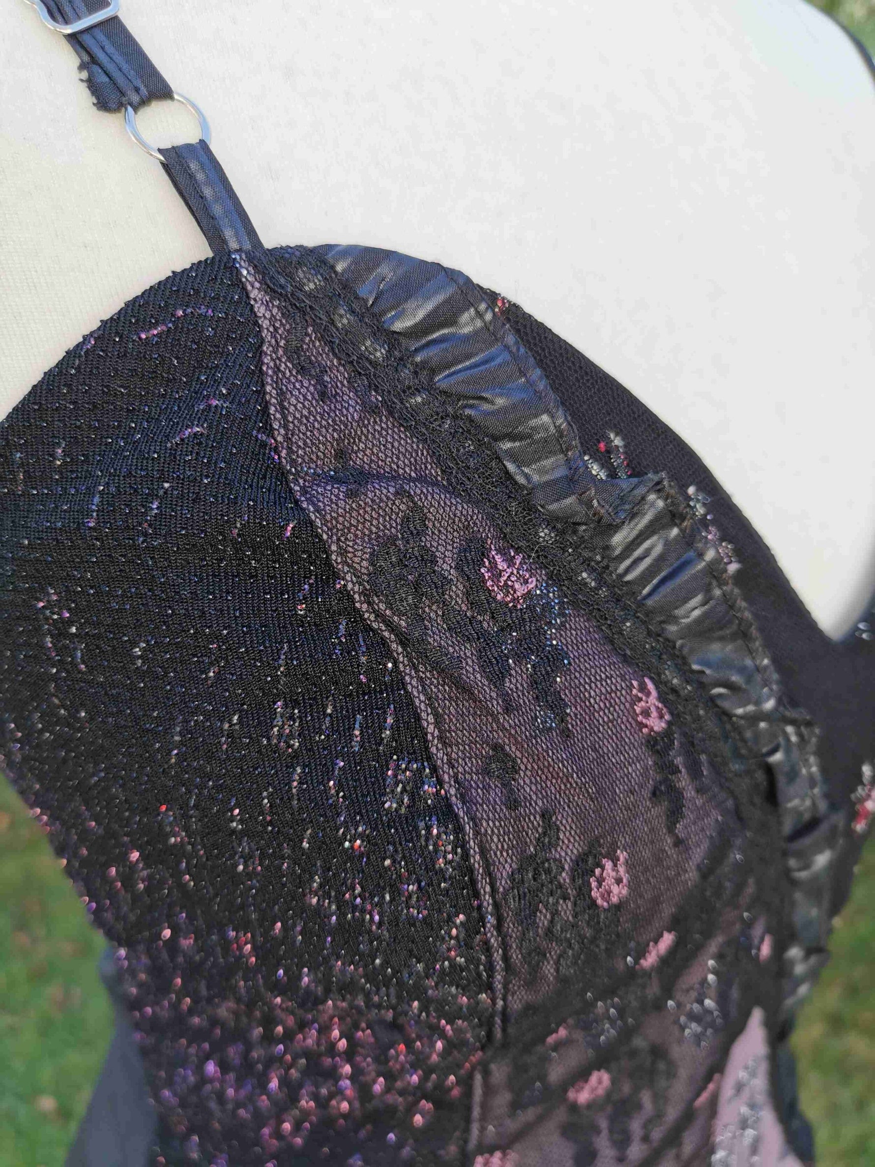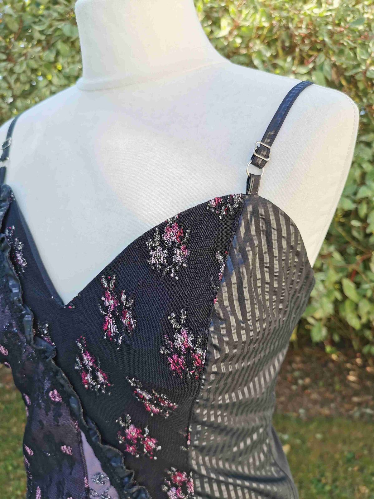 En gaze organza brodé de fleurs et volant en diagonale