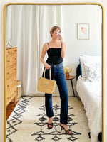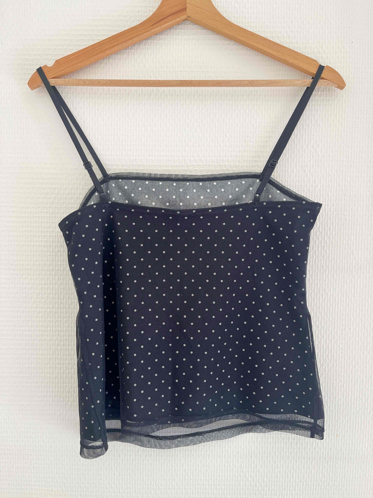 Prix unitaire parTop à pois, tulle transparente sur le devant, petit nœud décoratif et dentelle situés sous la poitrine, bretelles ajustables, confectionné en France. Porté ici sur une T36 pour 1,64 m