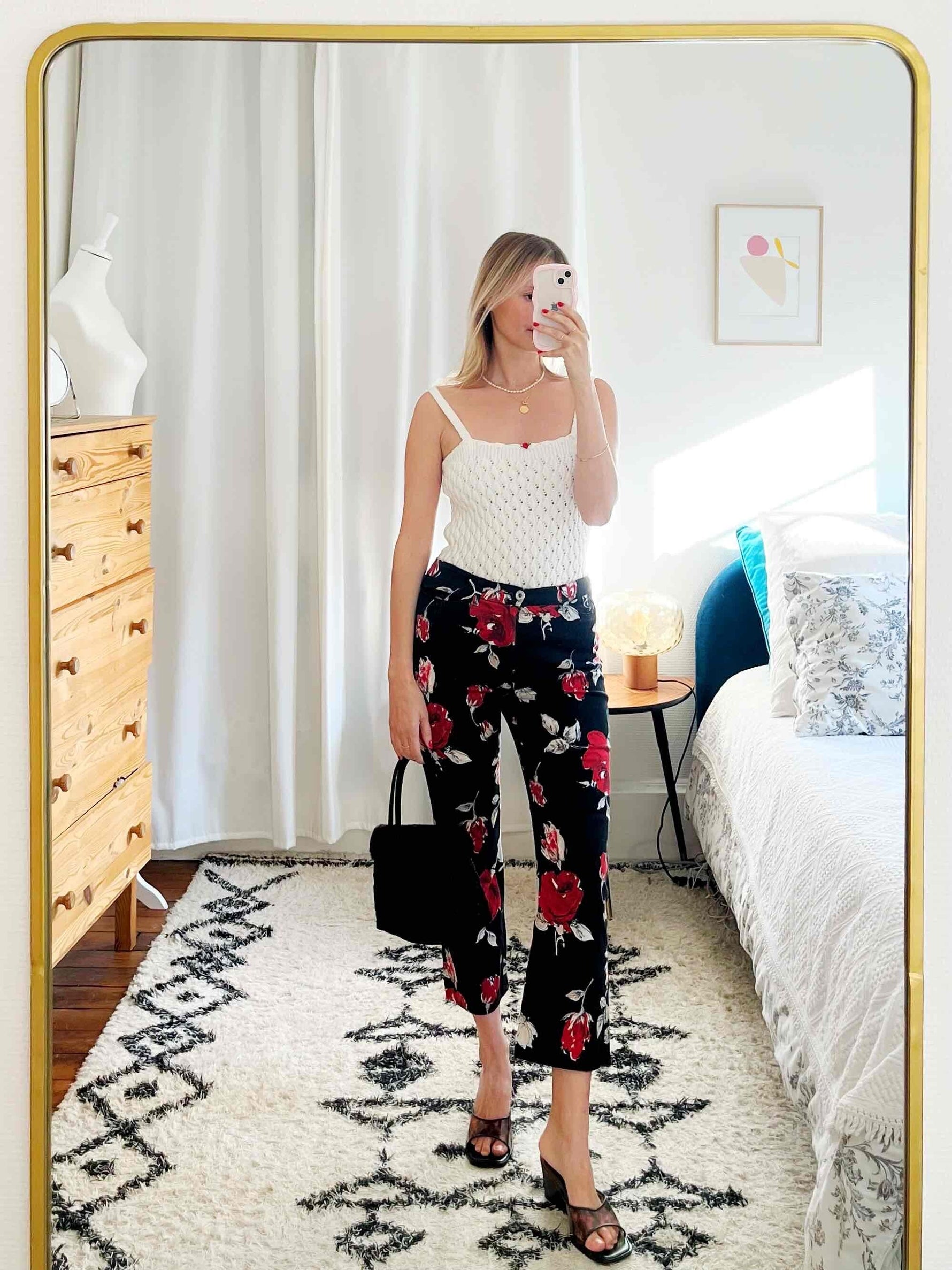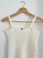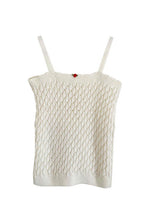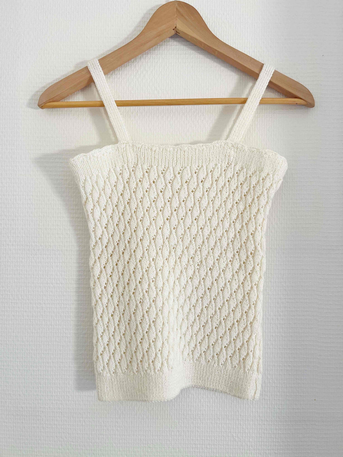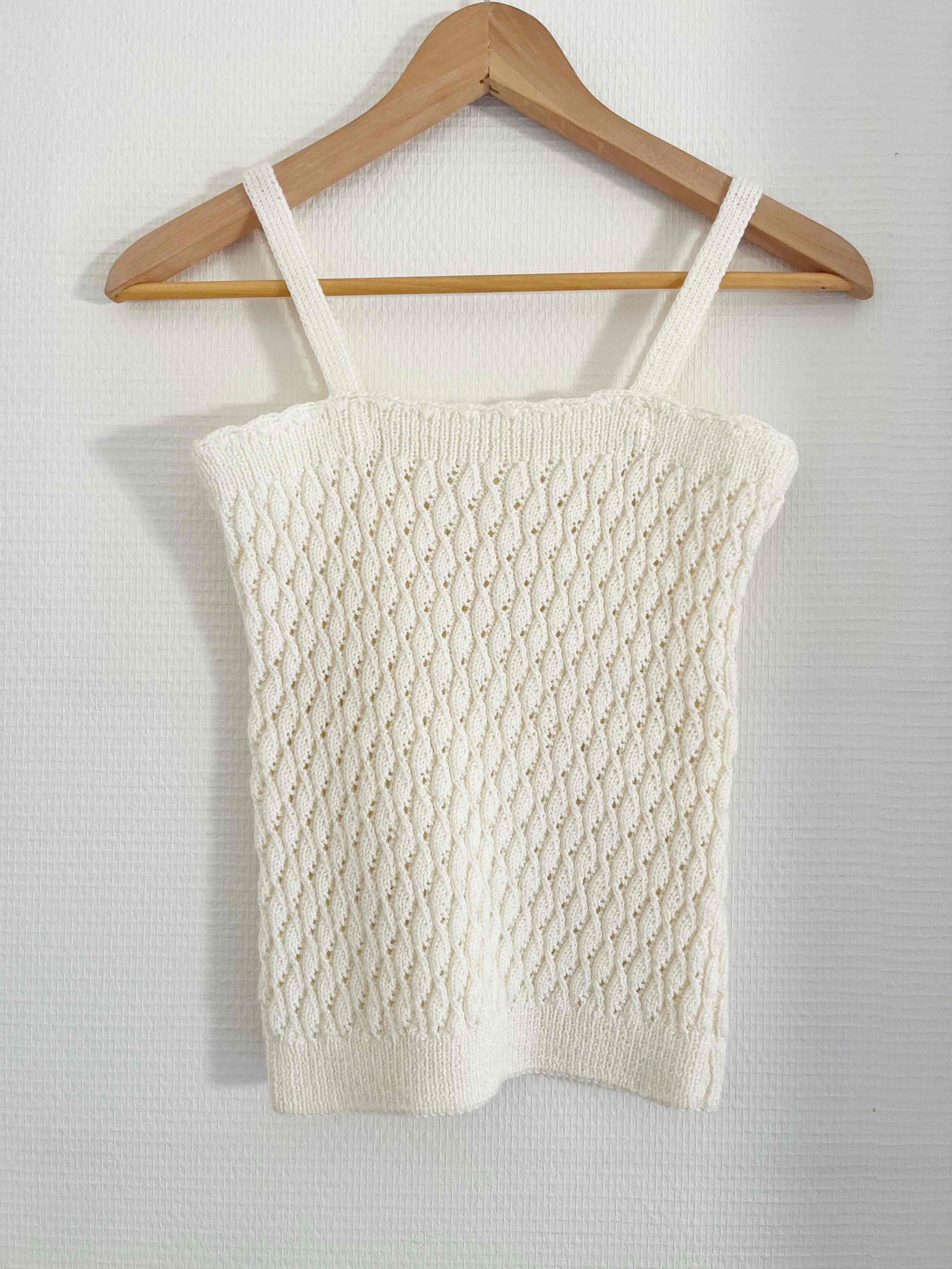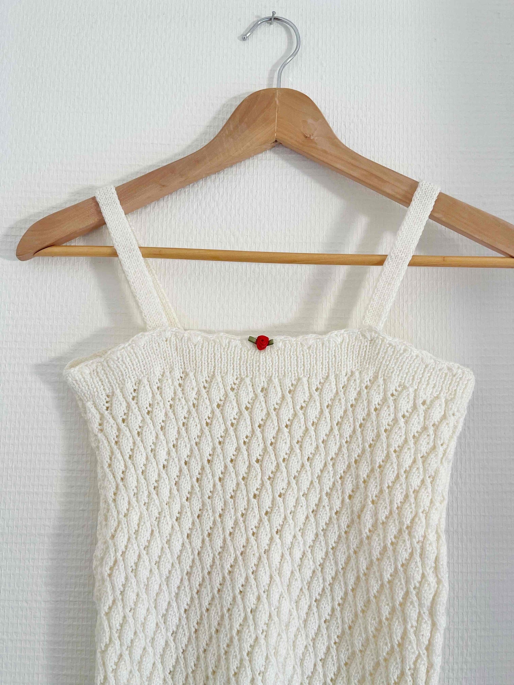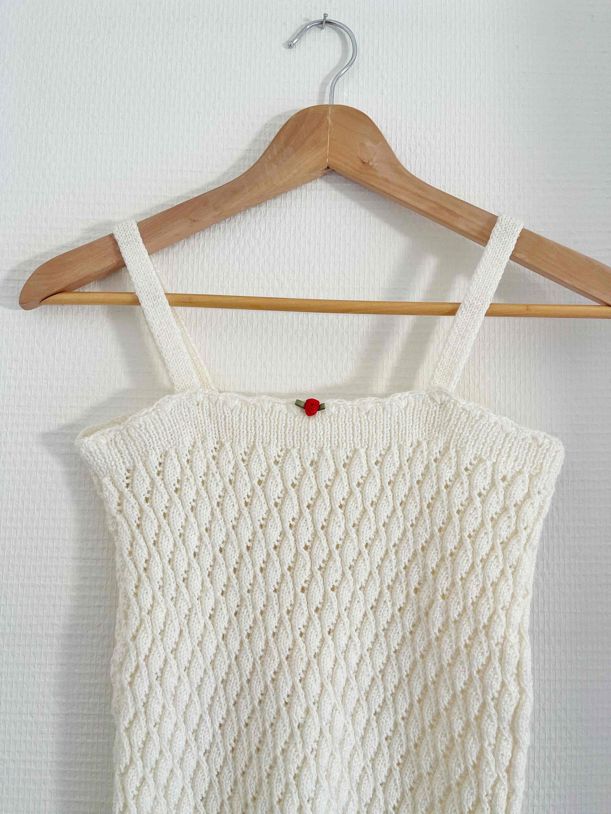 Prix unitaire parDébardeur en maille, façon crochet torsadé, plutôt épais, décolleté orné d’une petite rose rouge. Porté ici sur une T36 pour 1m64. Absence d’étiquette avec la composition