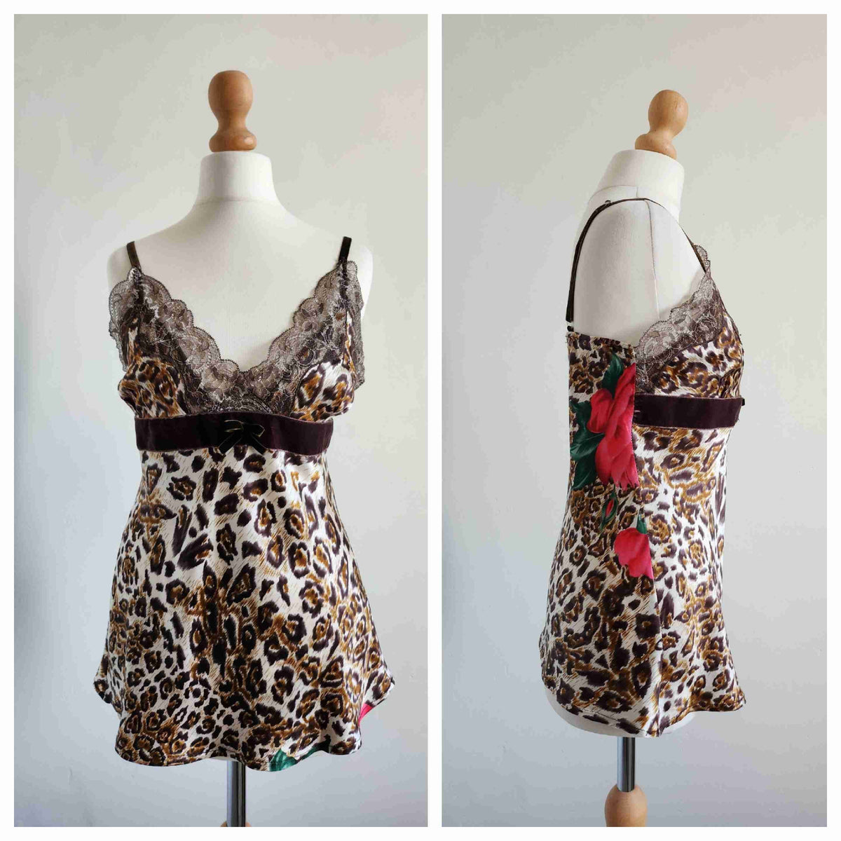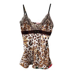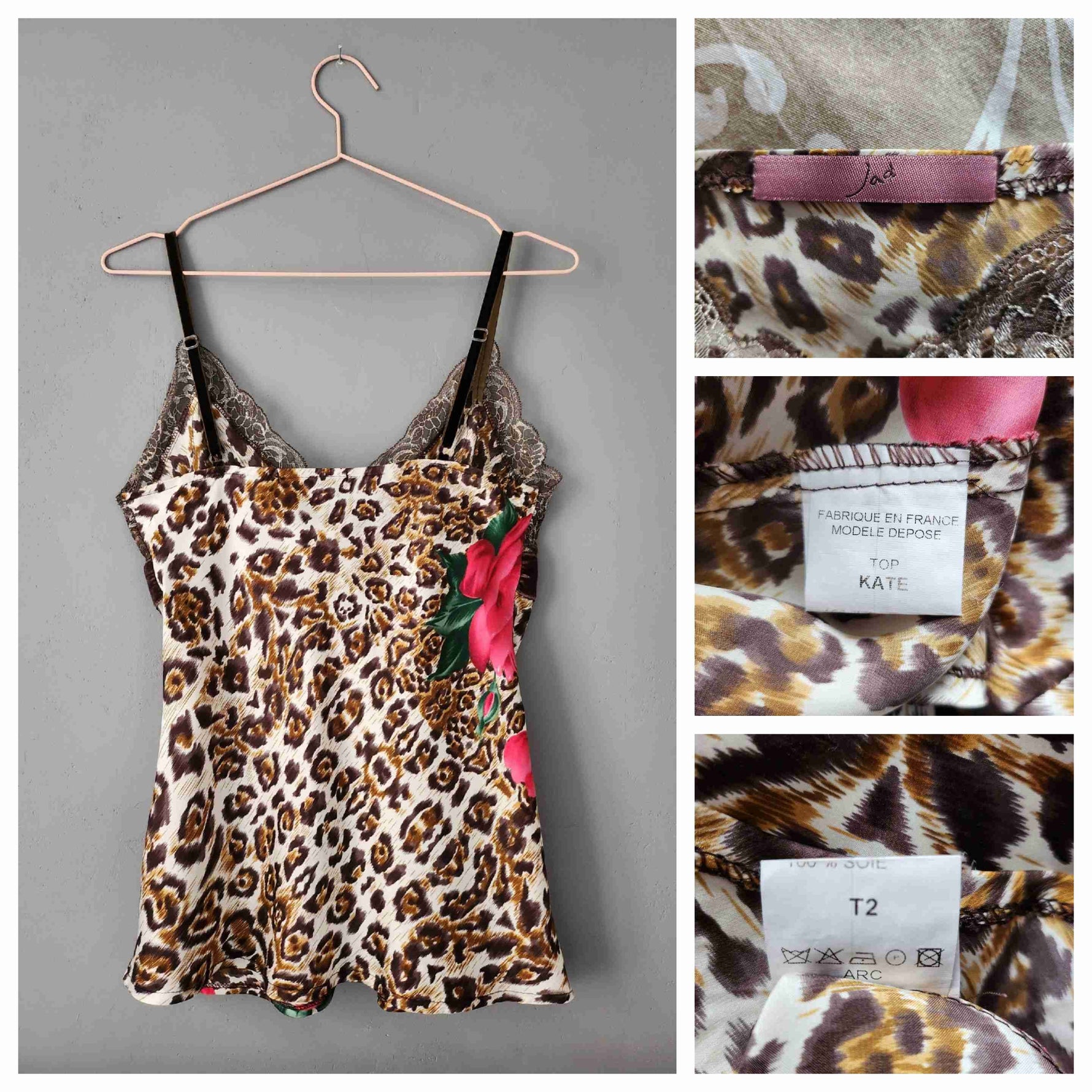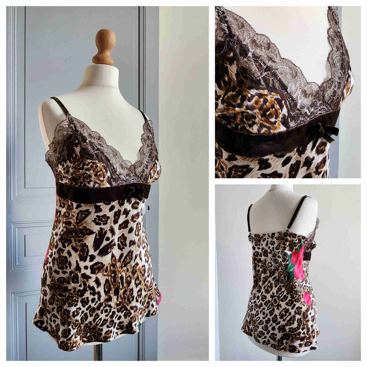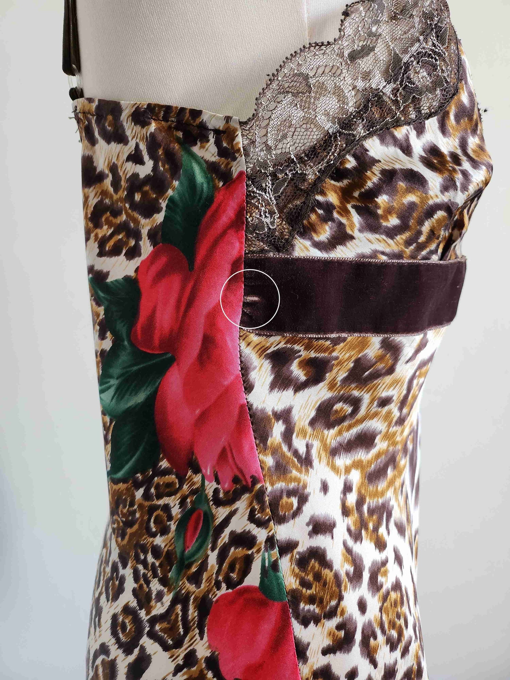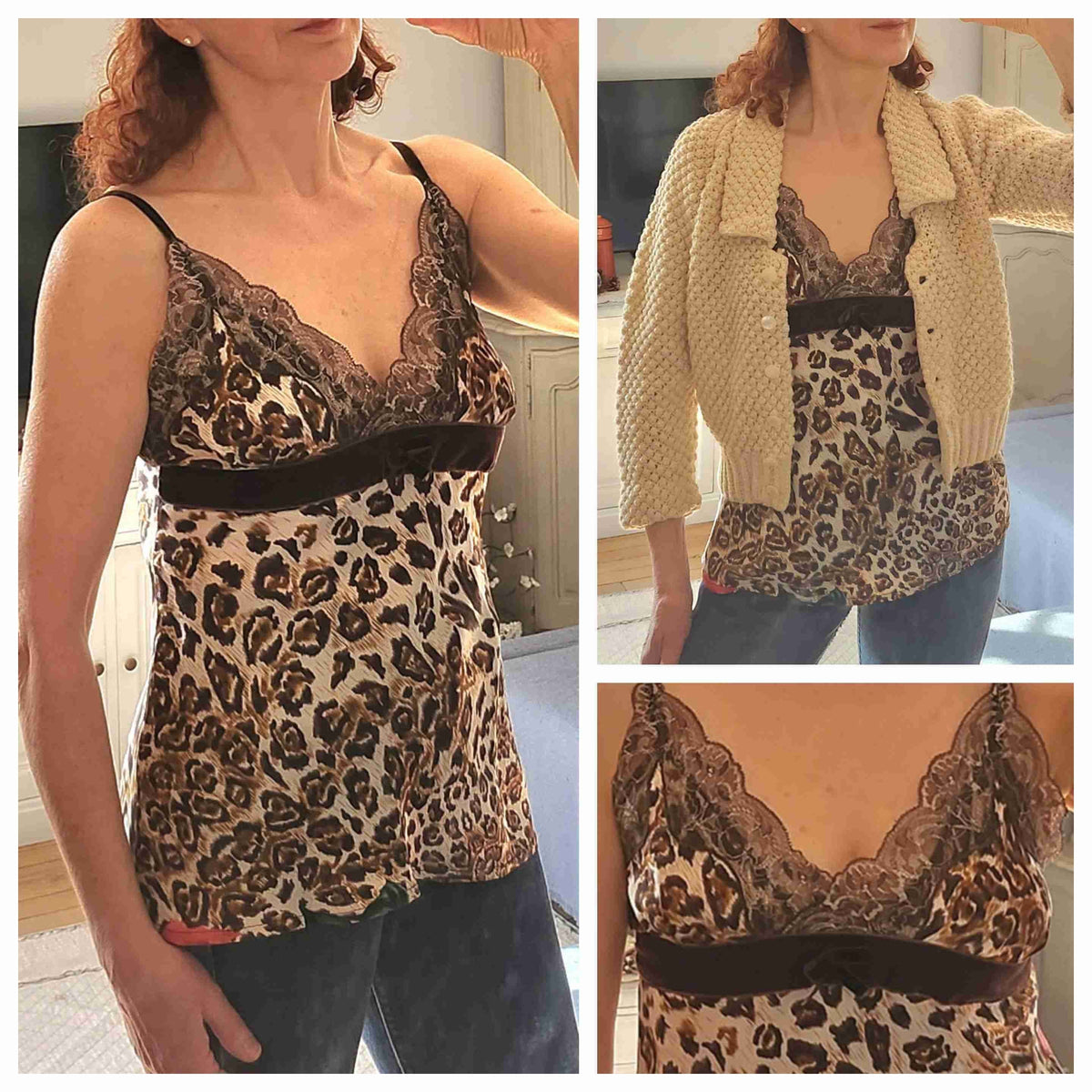 Prix unitaire parCaraco en soie imprimé léopard avec détail floral fuschia et vert émeraude, à bretelles réglables, dentelle et bandeau velours chocolat sous poitrine, découpe lingerie avec pinces, petit noeud fixe. Piece 100 % soie, fabriquée en France.