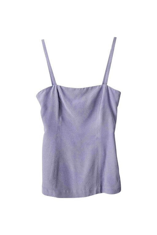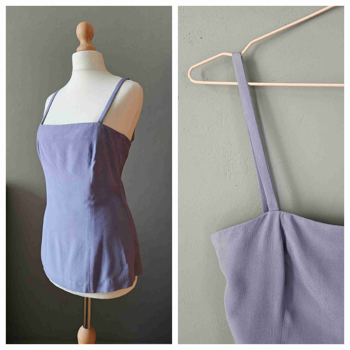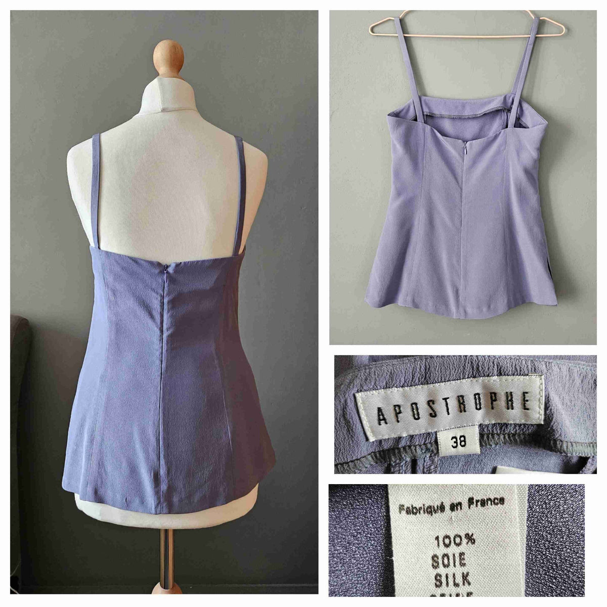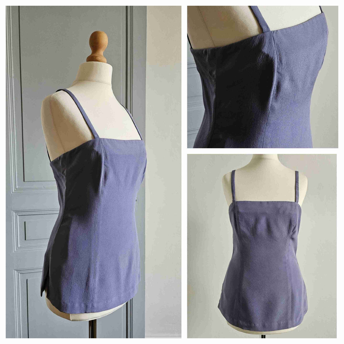 Prix unitaire parCaraco en pure soie, coloris lilas, pinces poitrine, bretelles non réglables, zippé dos, petites fentes côtés. Fabriqué en France.