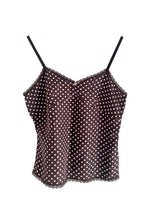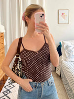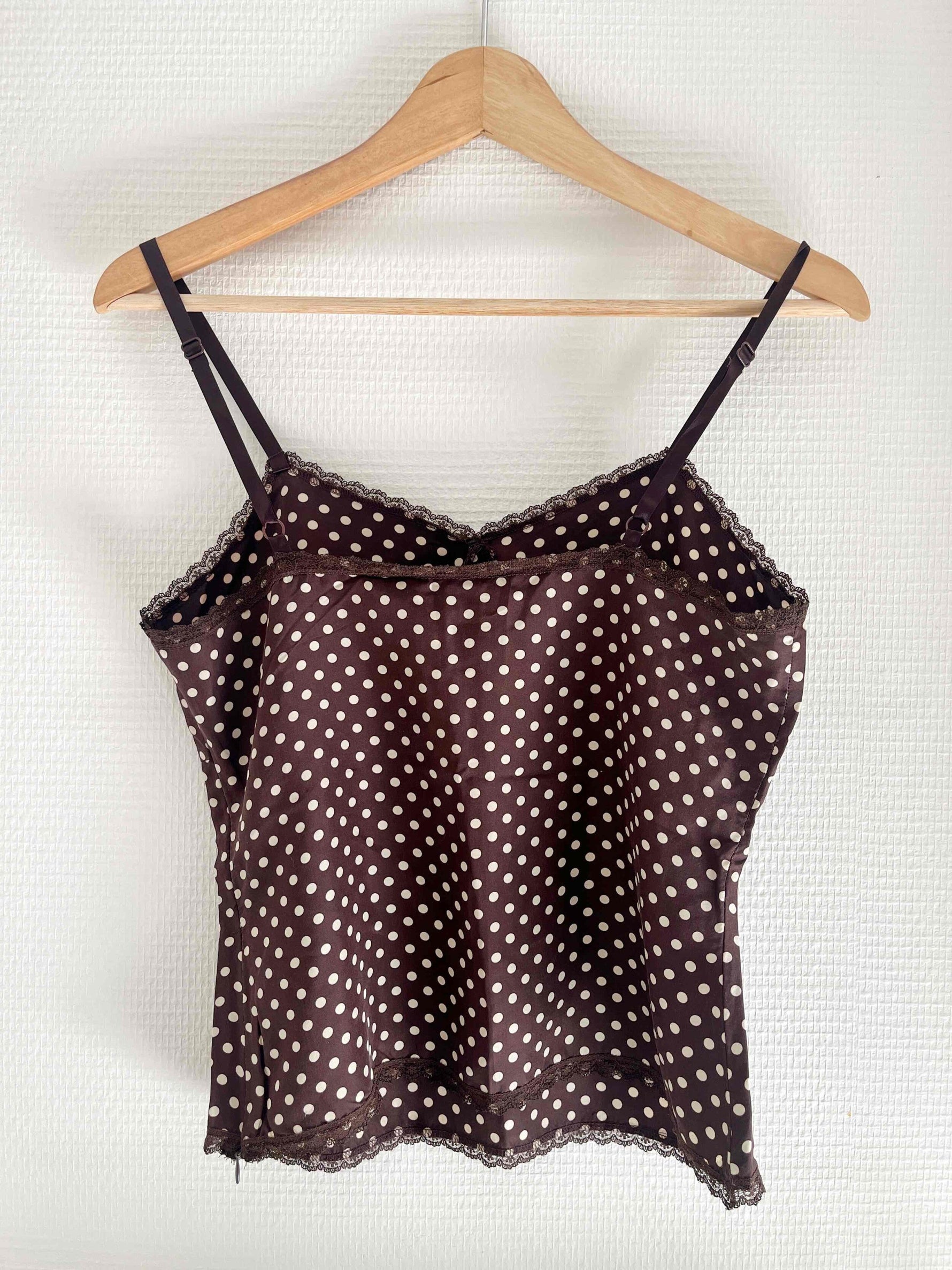 Prix unitaire parCaraco en soie, marron à pois, décolleté en V orné de dentelle, bretelles ajustables, porté ici sur une T36 pour 1,64 m