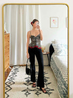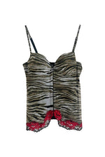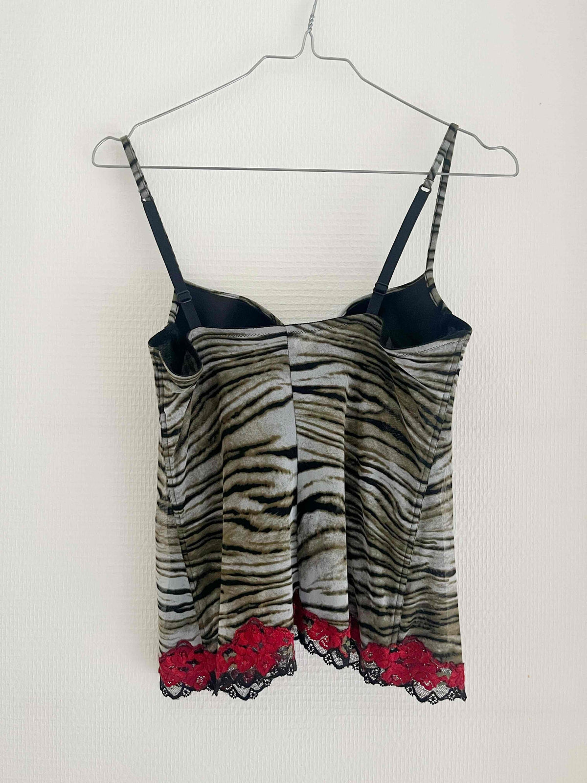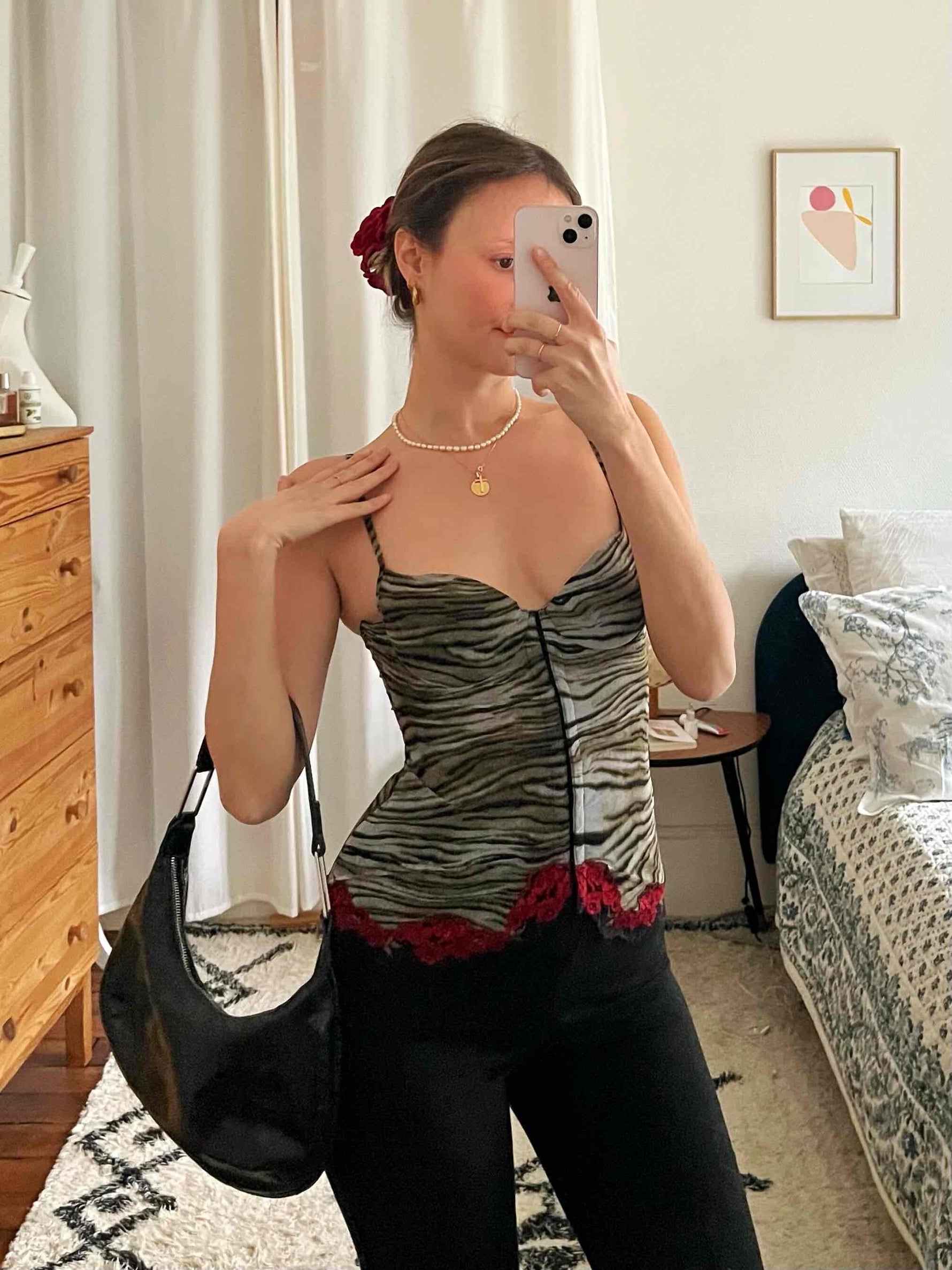 Prix unitaire parCorset imprimé animal, ornés de roses rouges, fermeture à crochets sur le devant, bretelles ajustables, bonnet 85B. Porté ici sur une T36 pour 1m64